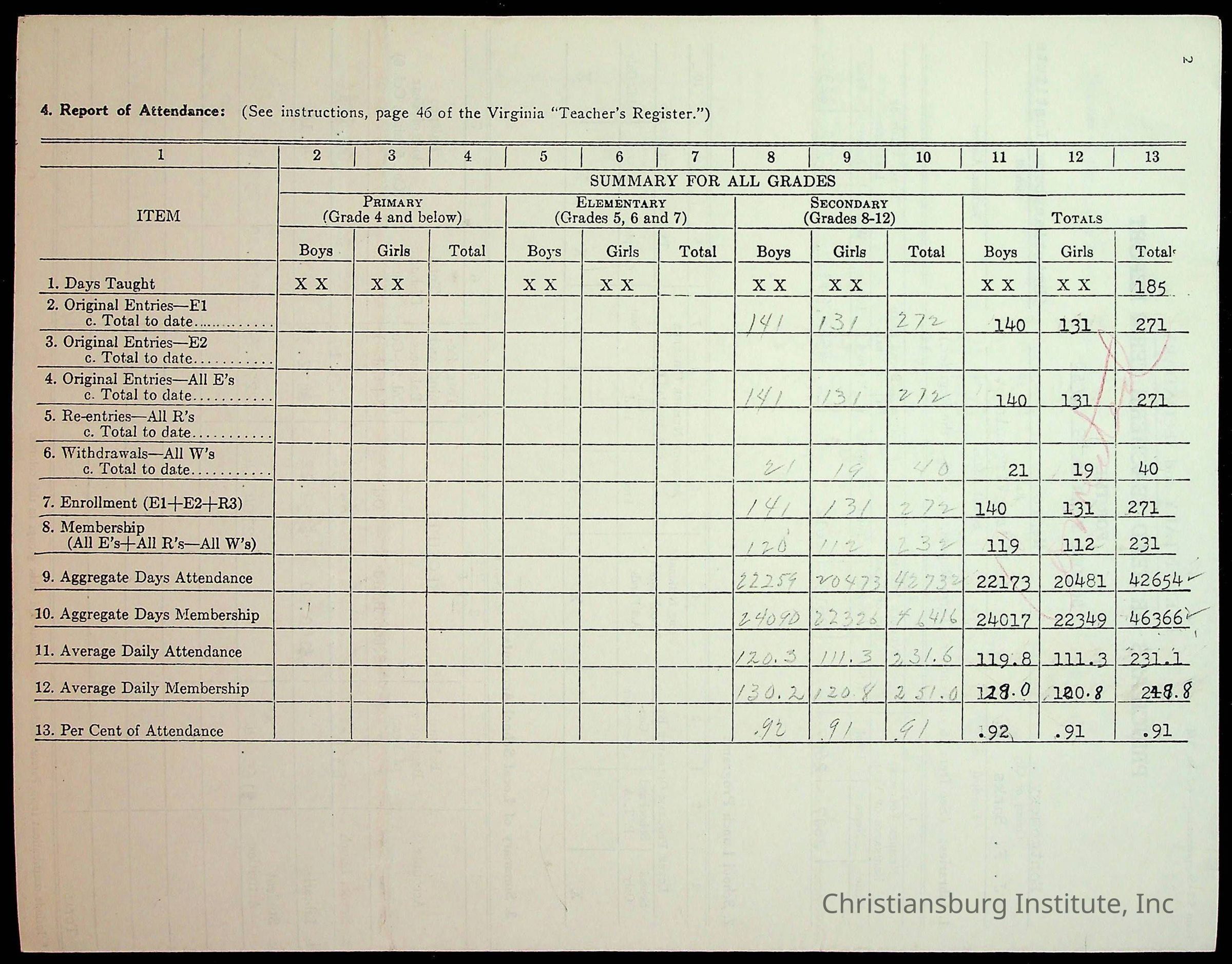 The first folder of an archive of reports to the Commonwealth of Virginia Department of Education for Christiansburg Institute during the 1930s through the 1950s.