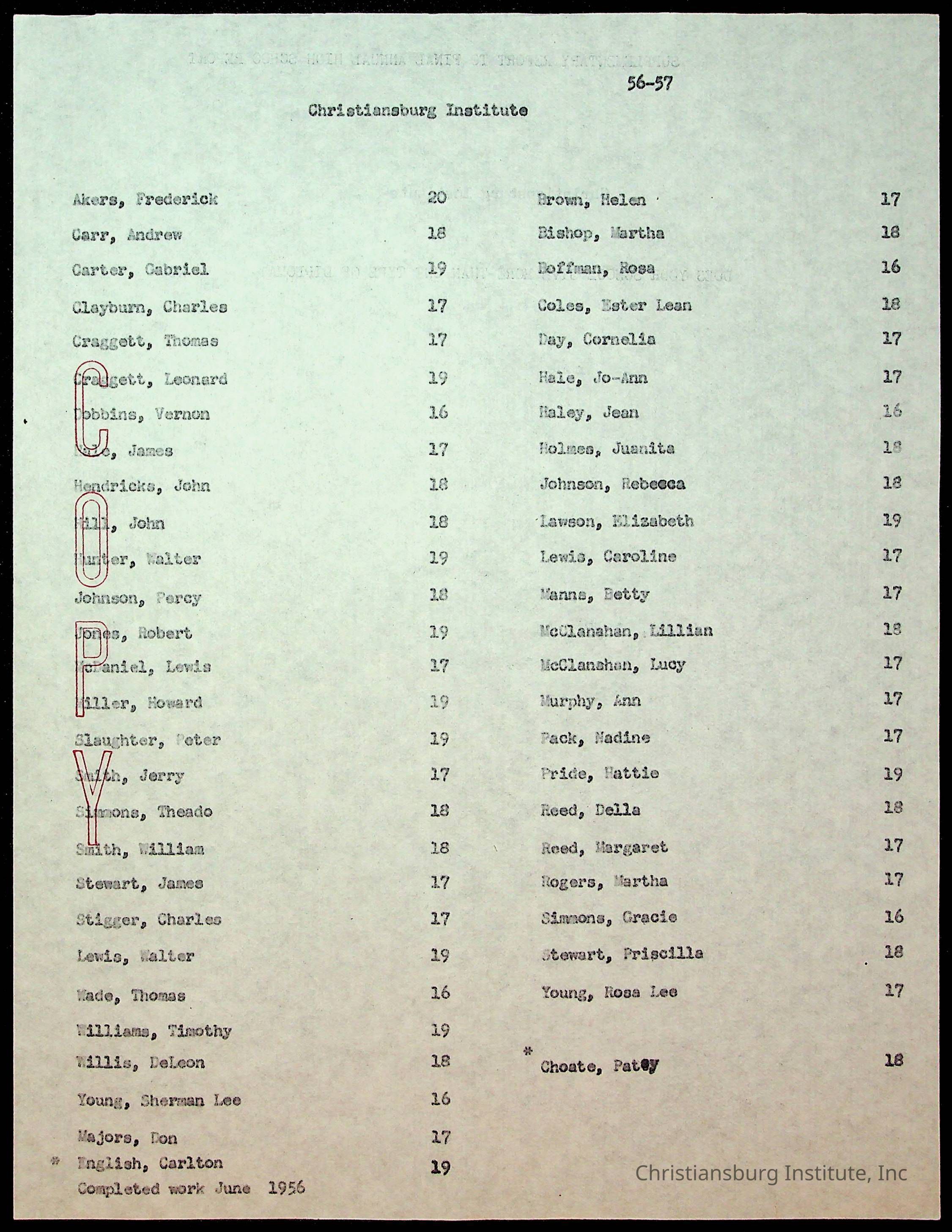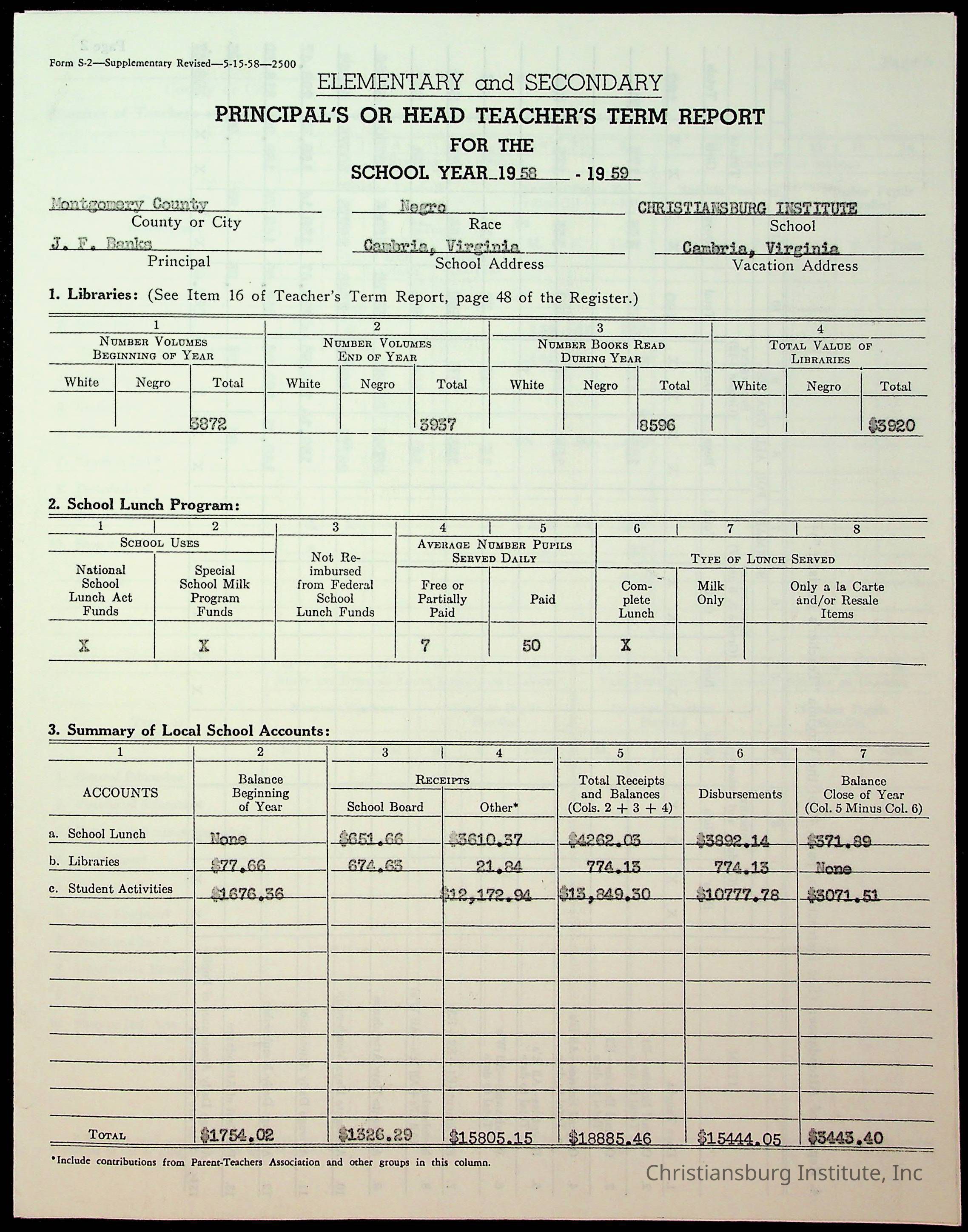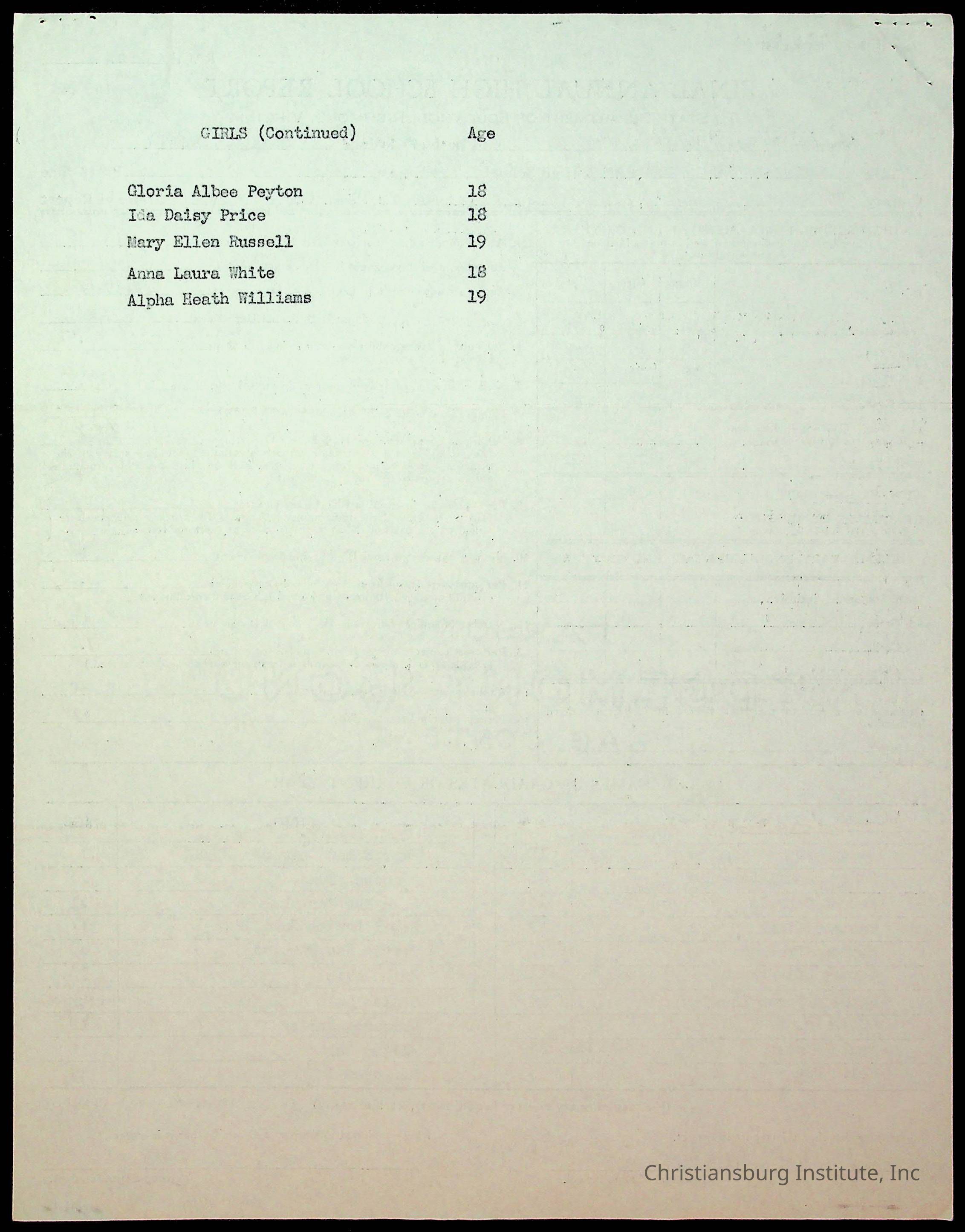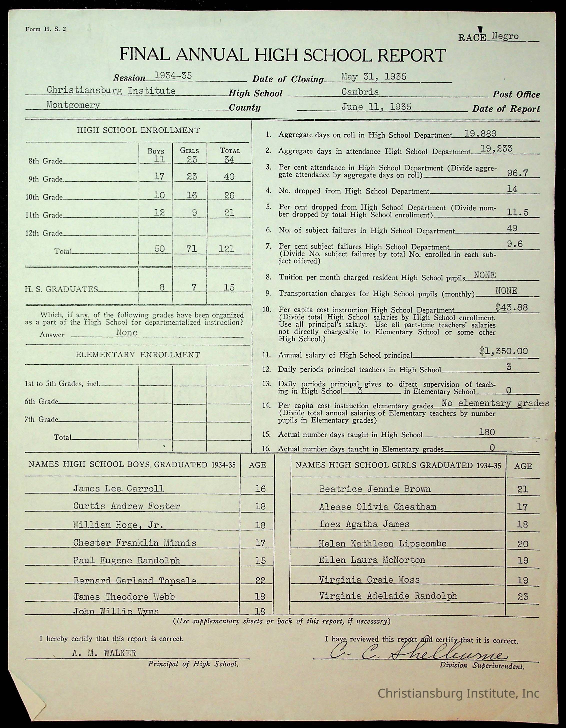 Copyright has been assigned to Christiansburg Institute Museum & Archives by Montgomery County Public Schools. For permission to publish materials created by the donor, contact CIMA@christiansburginstitute.com. Materials not created by Christiansburg Industrial Institute may still be under copyright.