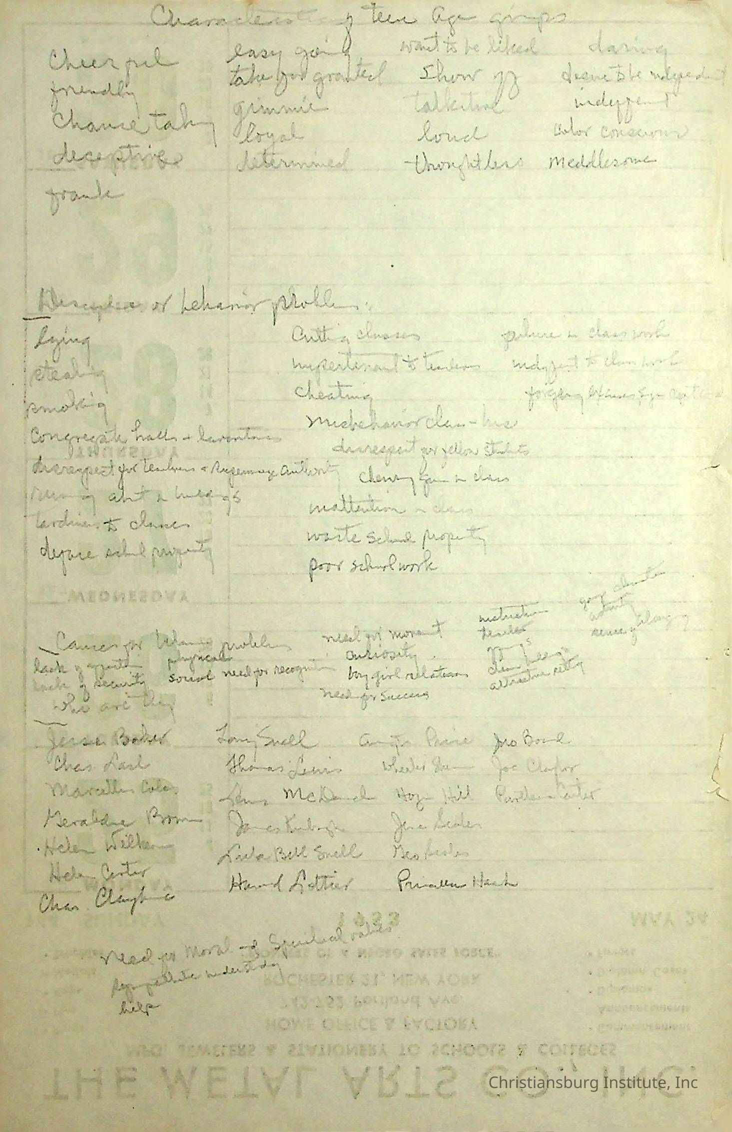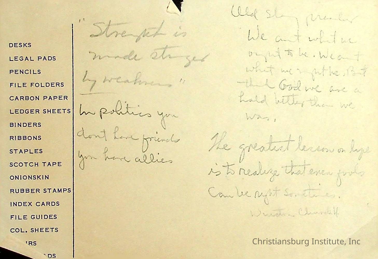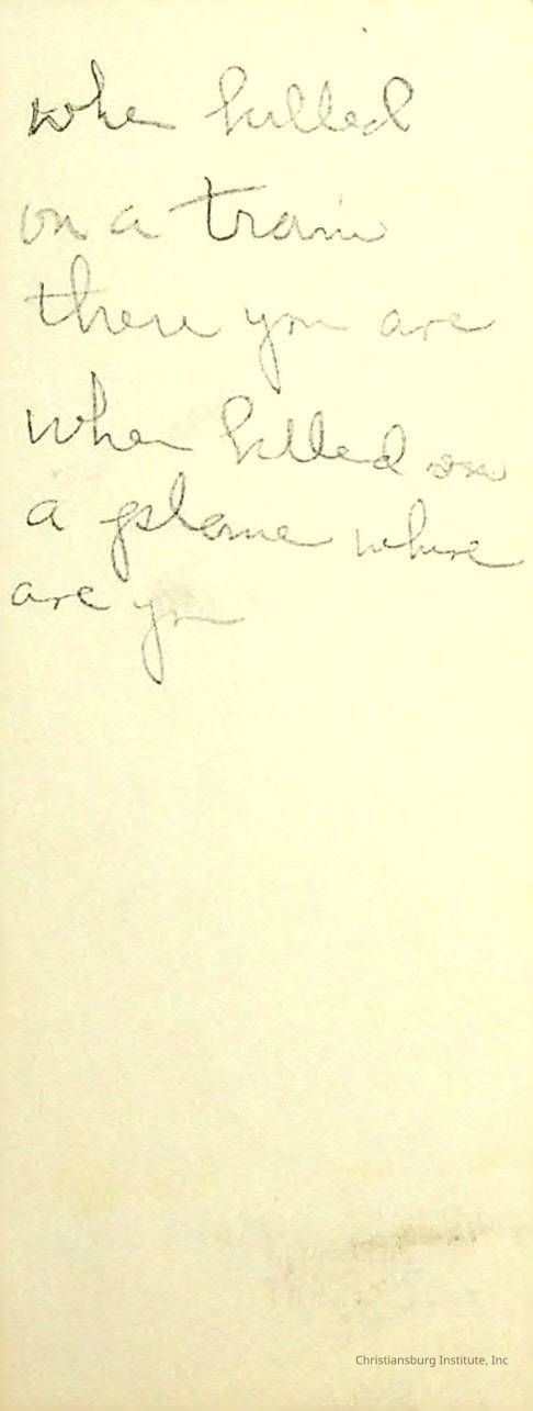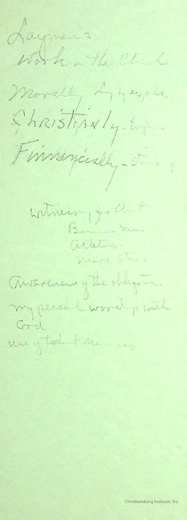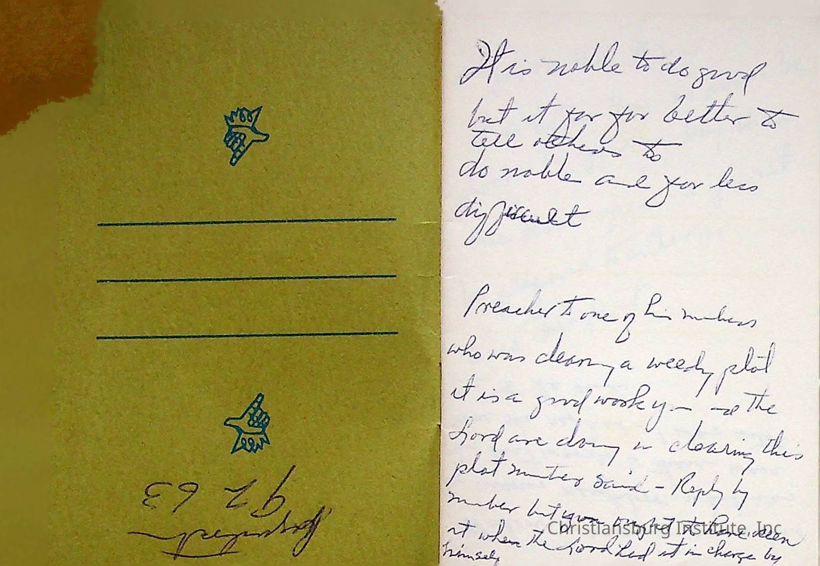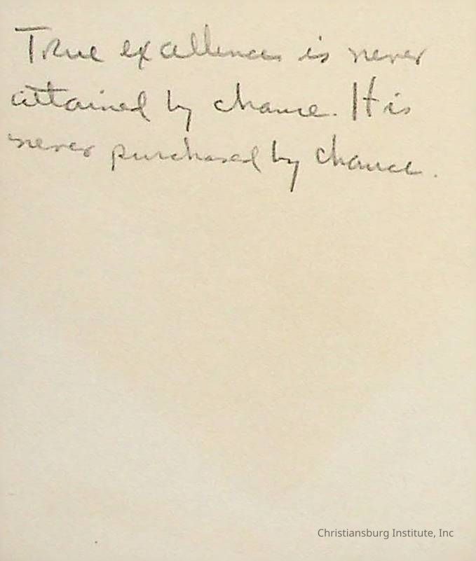 There are dozens of notes written by Principal Joseph F. Banks.  They appear to mostly be ideas for his sermons and writings.  They are jotted down on scraps of paper and are all undated. A series of various notes written and kept by Christiansburg Institute principal, John F. Banks, circa 1950s-1960s.Collection