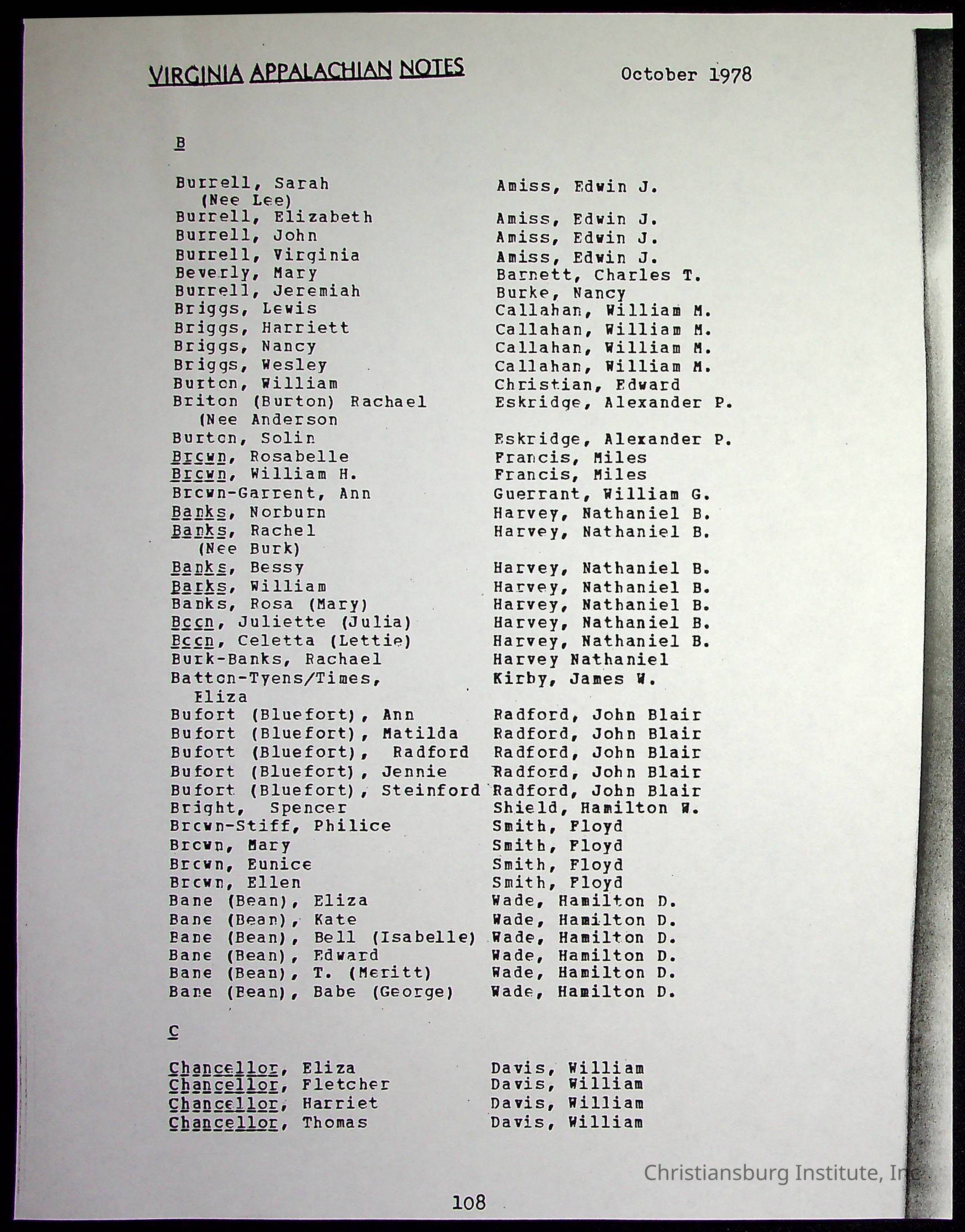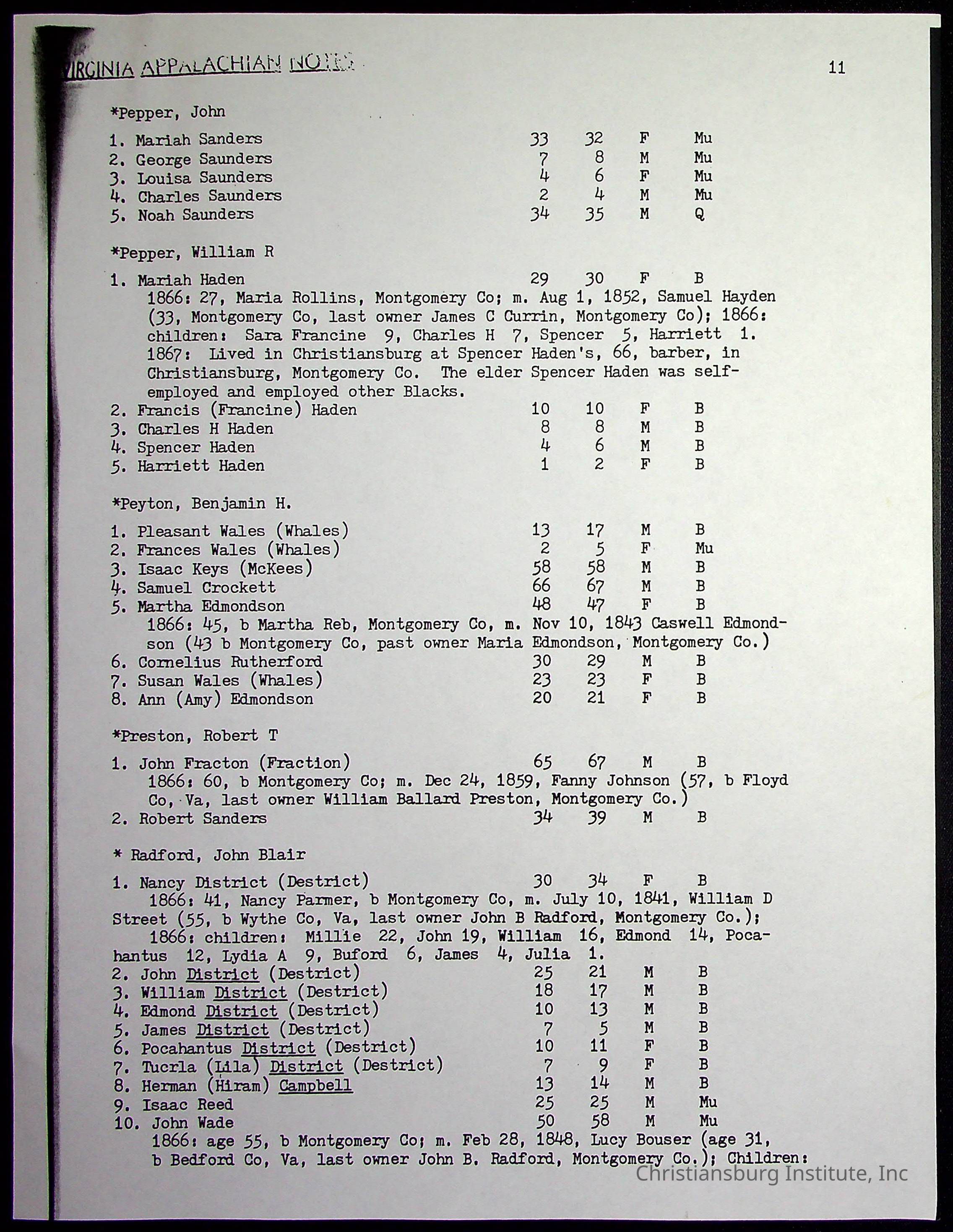 Farm Land, Boom Town, Village: A History of Belspring, Virginia, 1750-1940, The Reports of Charles S. Schaeffer from the Virginia counties of Montgomery and Pulaski, with additional information on the counties of Floyd, Giles, Craig, Wythe, and Roanoke., Ingles Ferry Ledgers (1840s-1880s), These people lived in a pleasant valley, Making their mark: Black Families of New River Depot, 1870-1940., Whartons’ Town New River Depot, 1870-1940., Radford’s Early Black Residents, 1880-1925