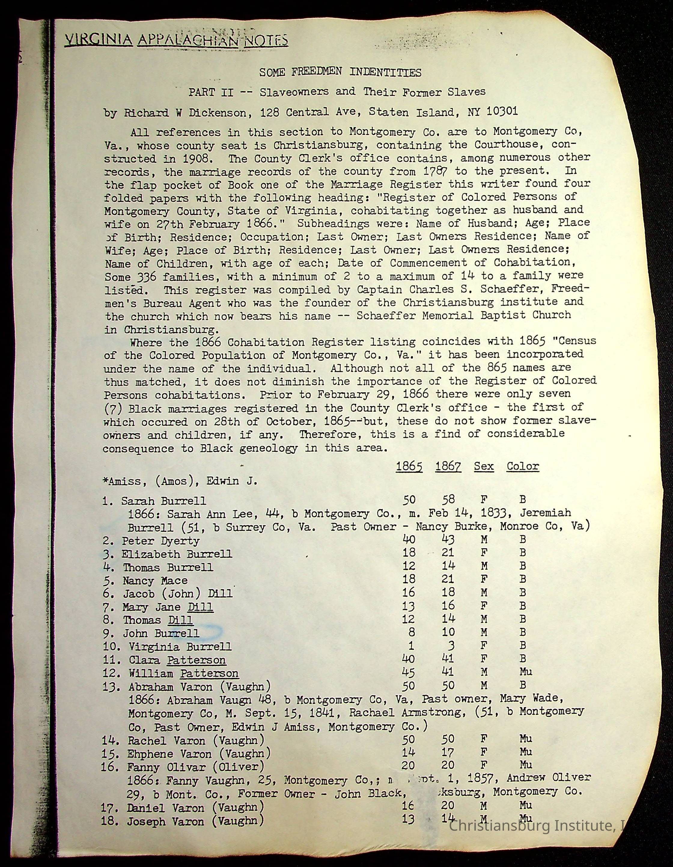 A folder of research materials collected by Radford University professor, Dr. Linda Killen. This folder is titled 'Dickenson Material' and includes research conducted about freedmen in the Southwest Virginia region by genealogist, Richard Dickenson.