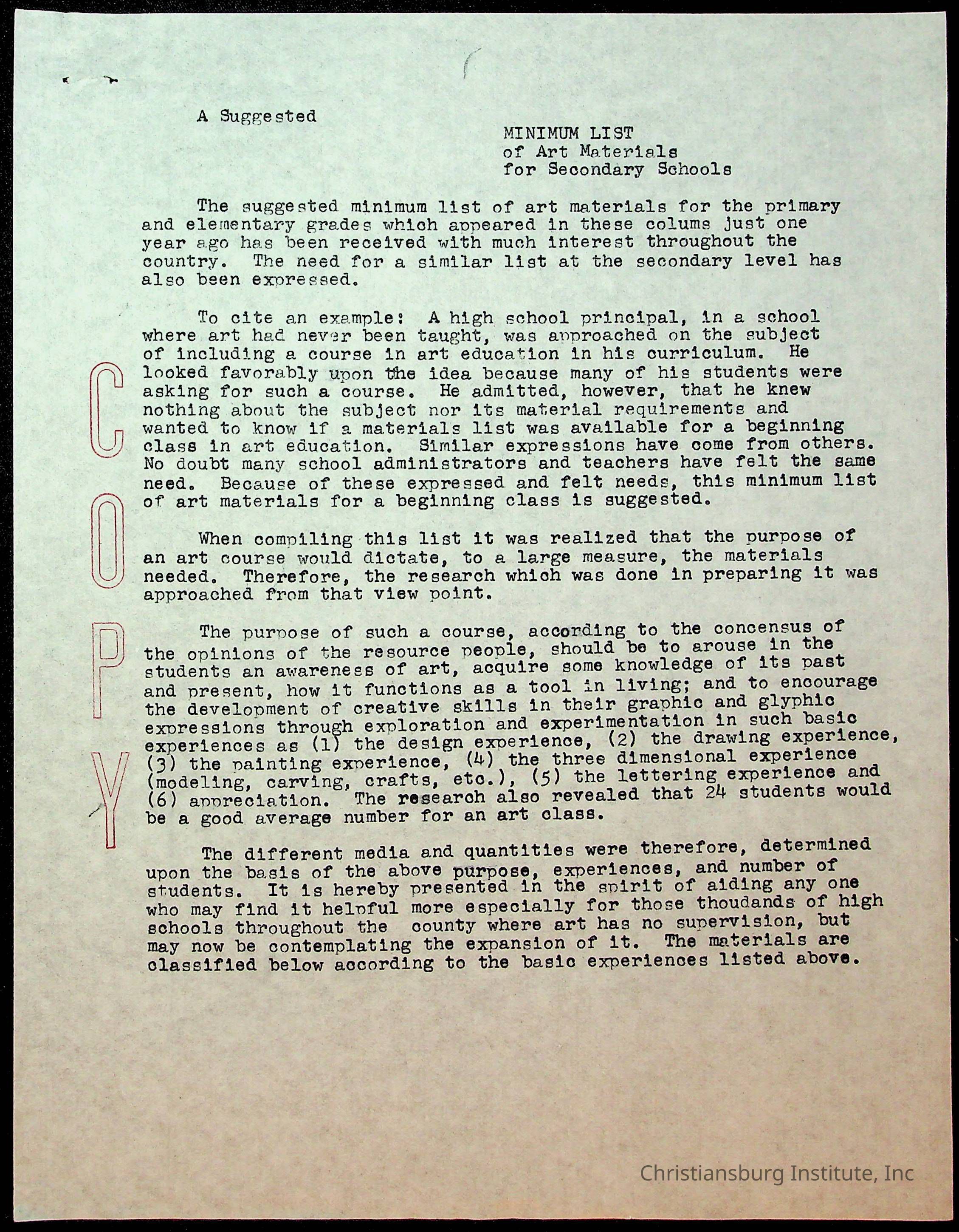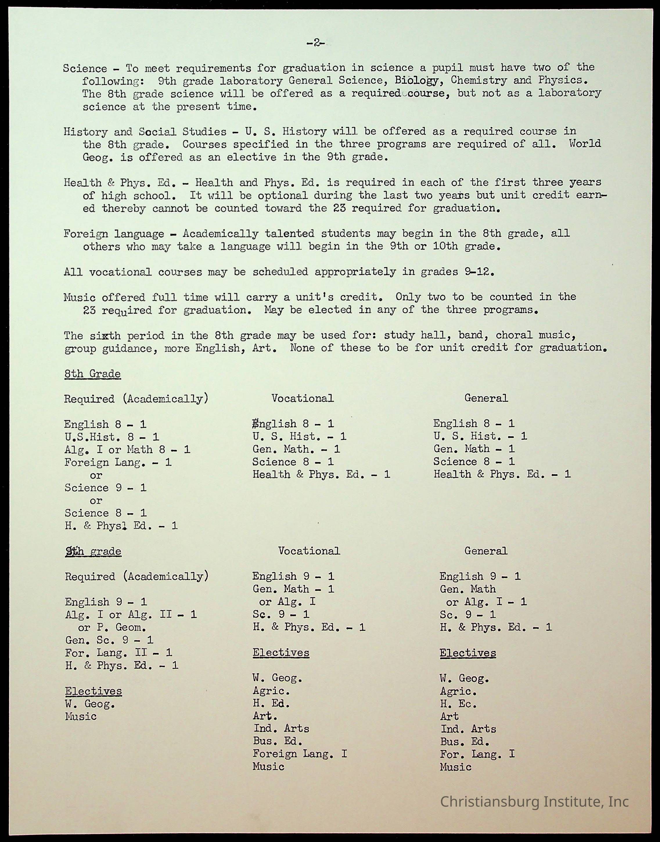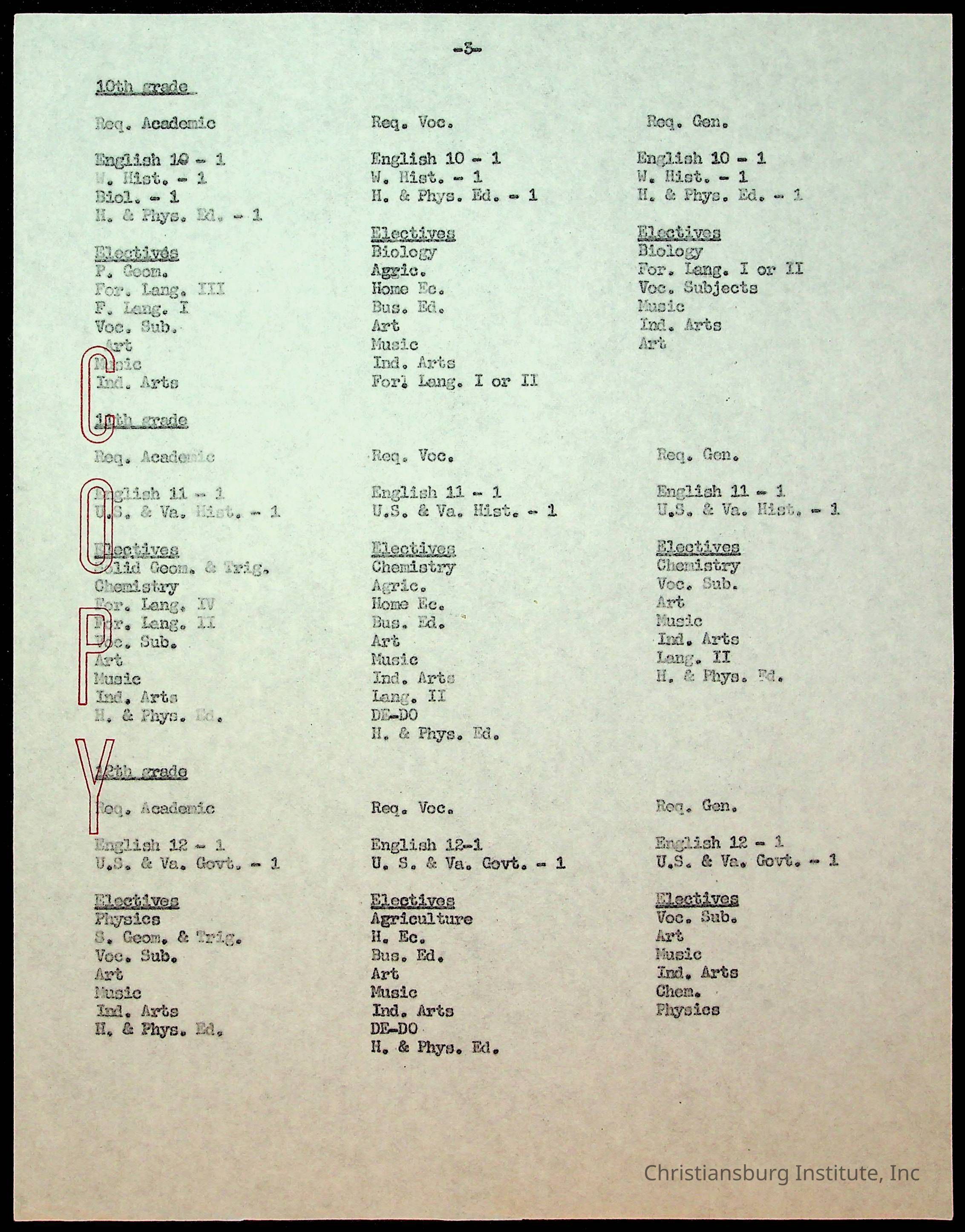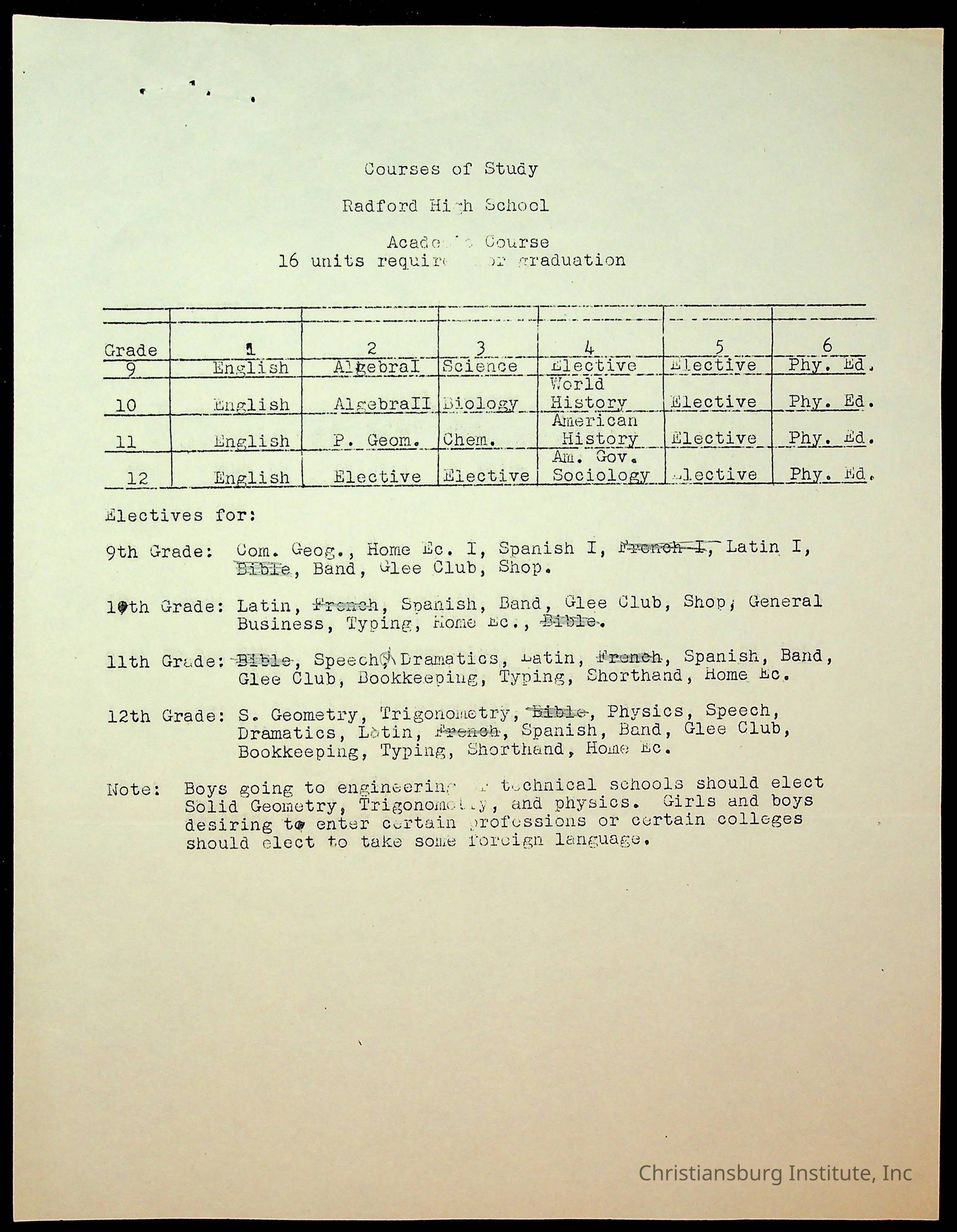 An archive of documents relating to high schools in the New River Valley including course offerings, correspondence, reports, and miscellaneous documents circa 1950-1960s.Collection