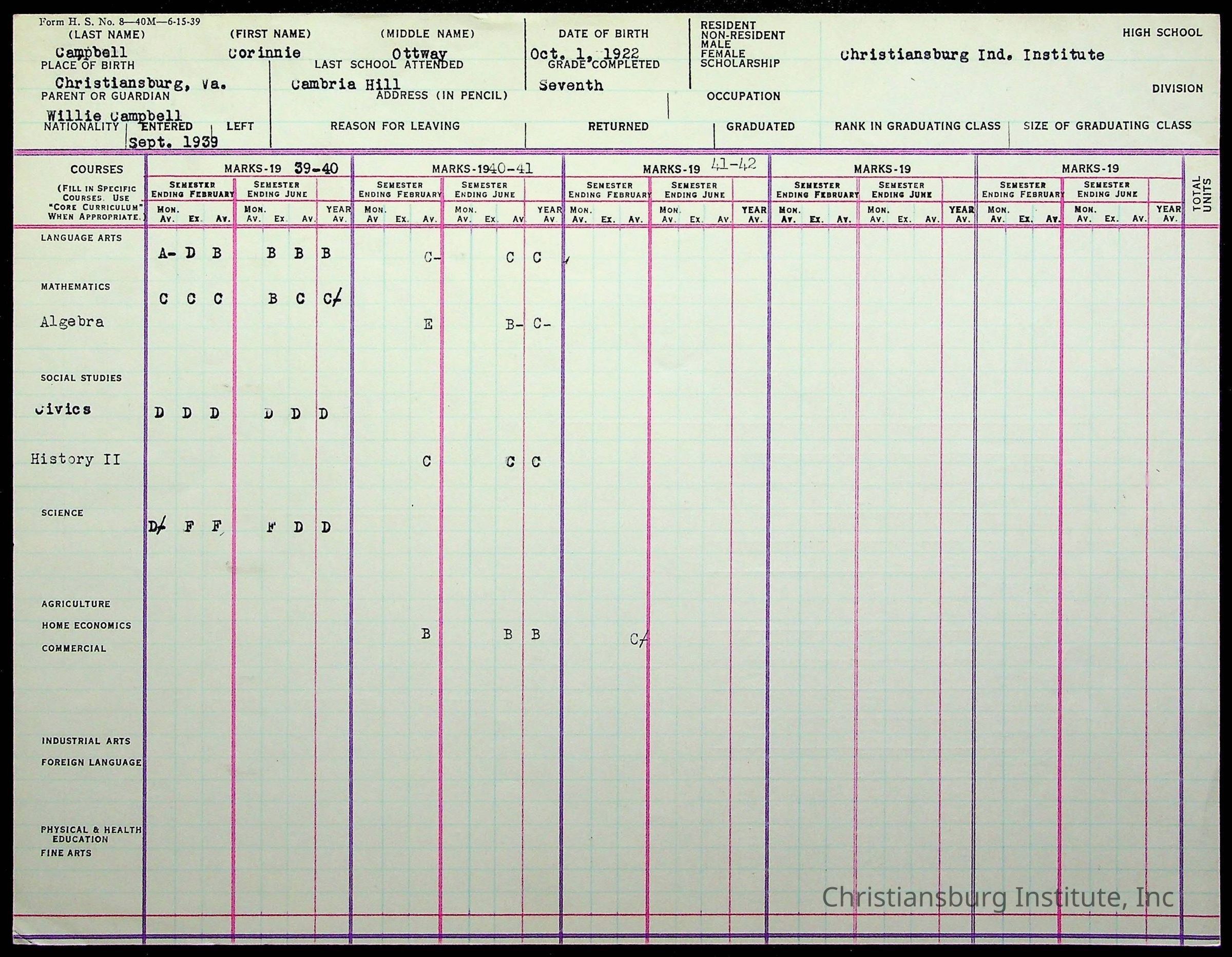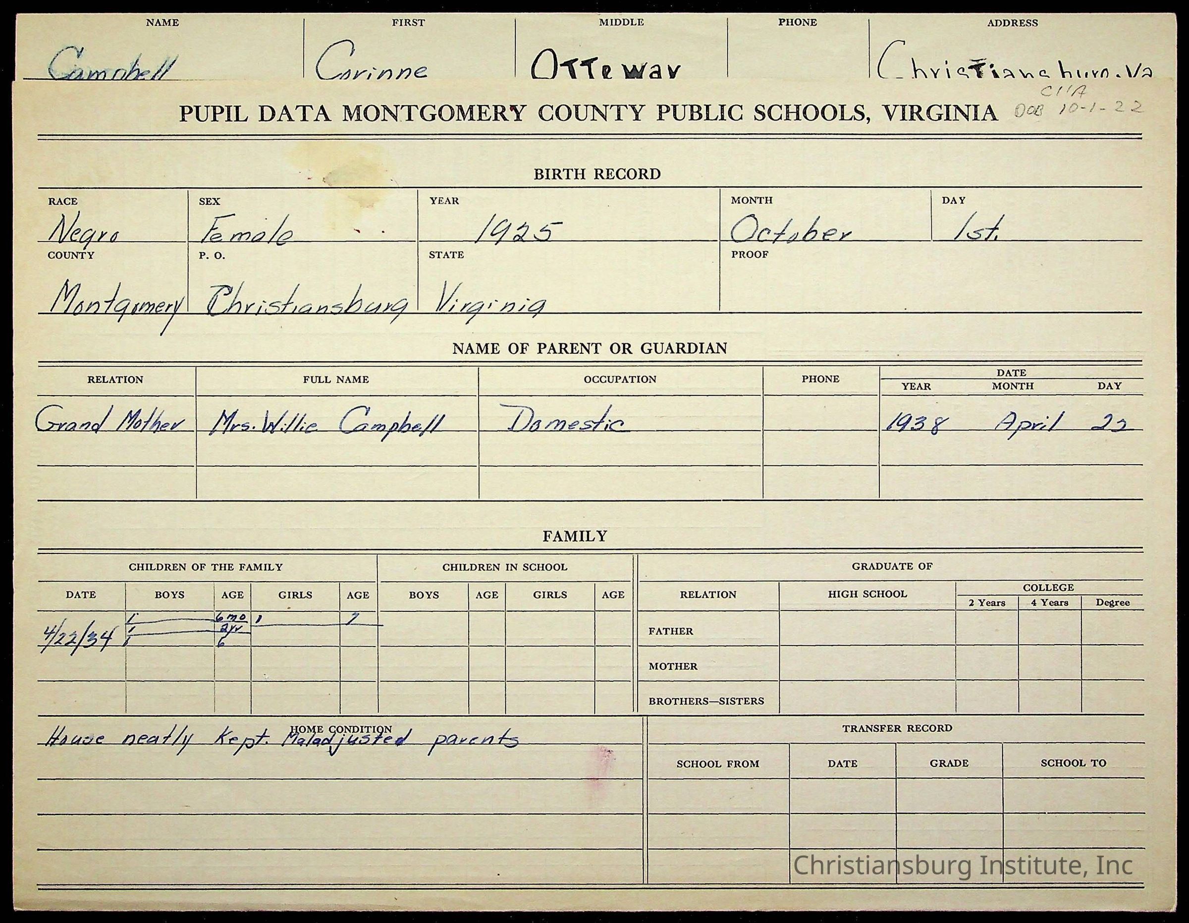 The student file for the Christiansburg Institute student, Corinnie Ottway Campbell circa 1940s.