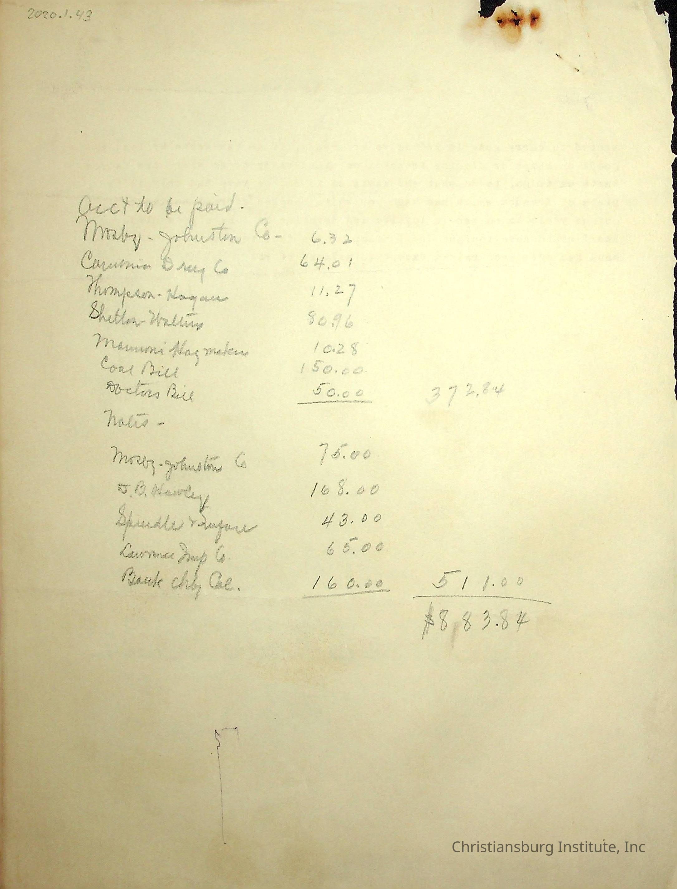 A miscellaneous document from Christiansburg Institute in regards to accounts in need of payment, undated. Gifted by Carlton Banks in 2001.