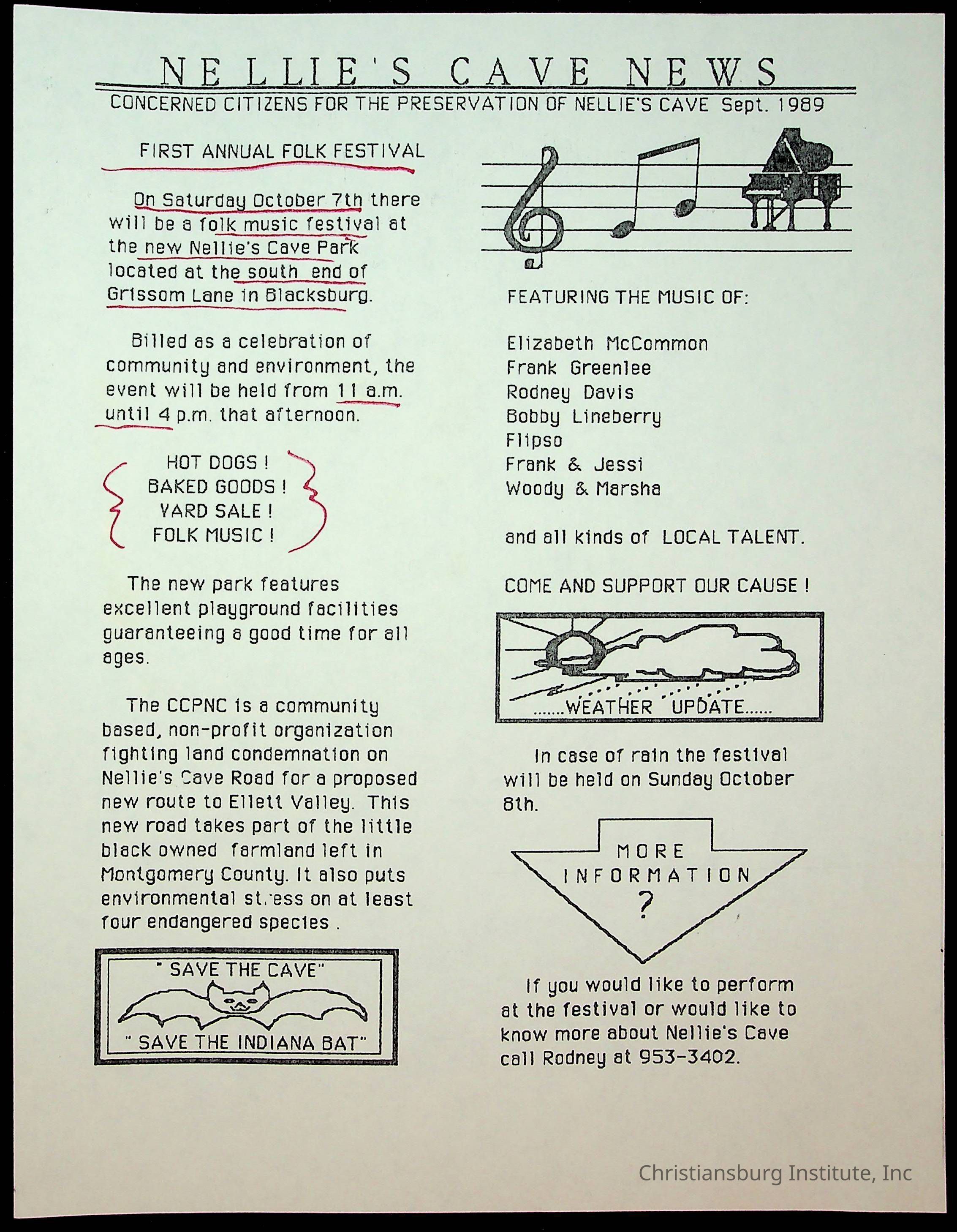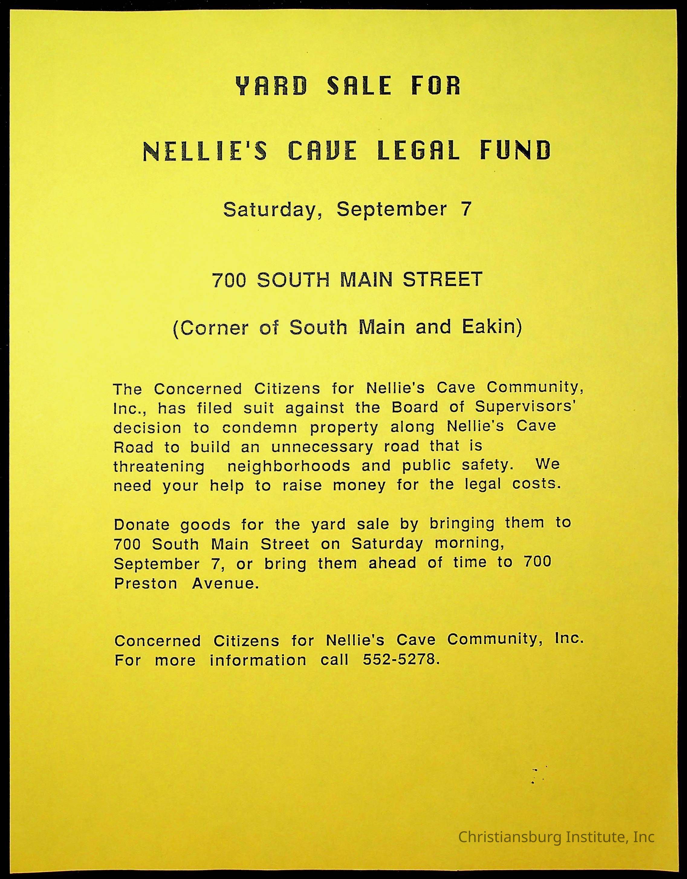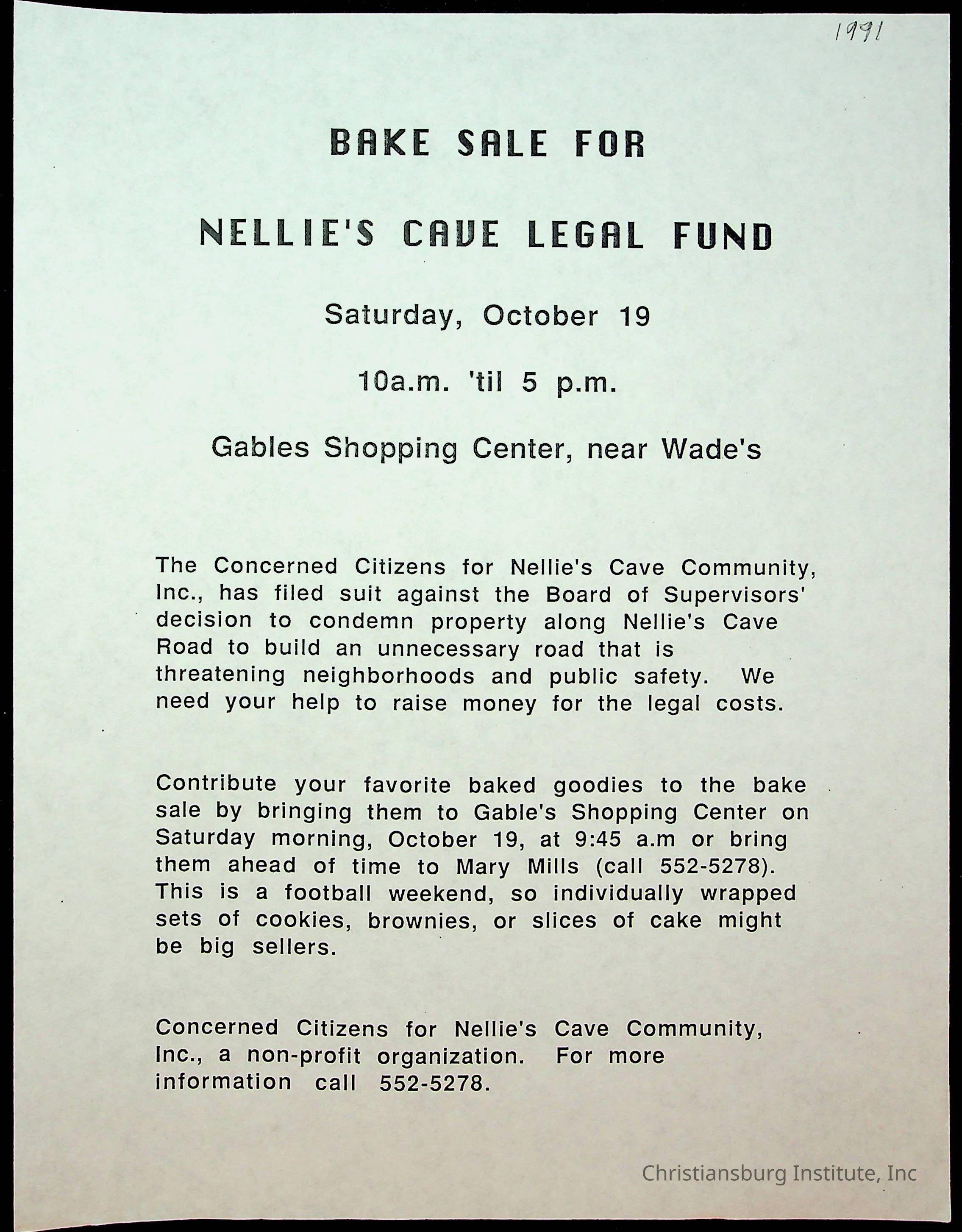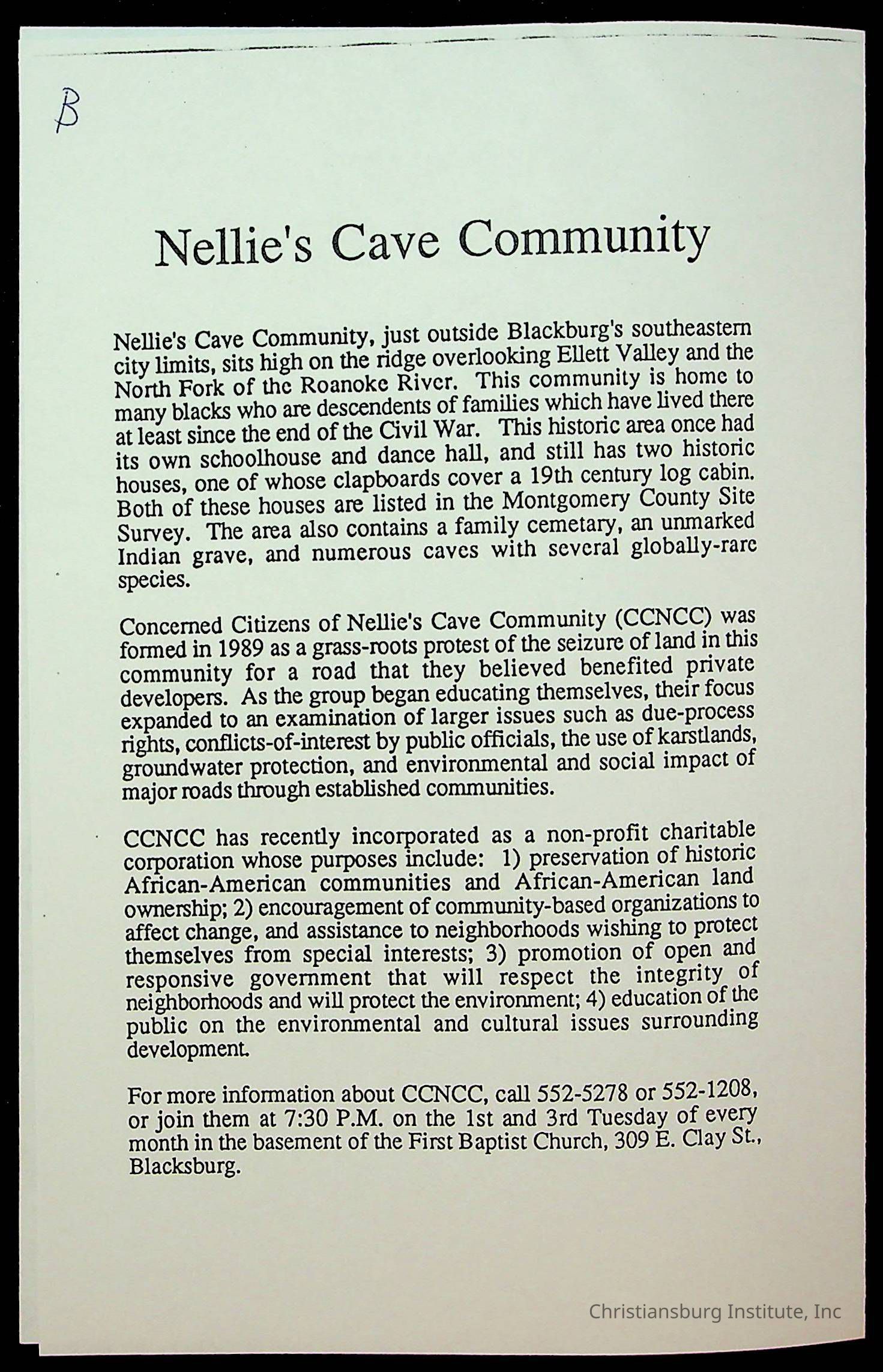 An archive of materials related to activities involving the group, Concerned Citizens for Nellies Cave Community, compiled by Elizabeth Fine circa 1990s.