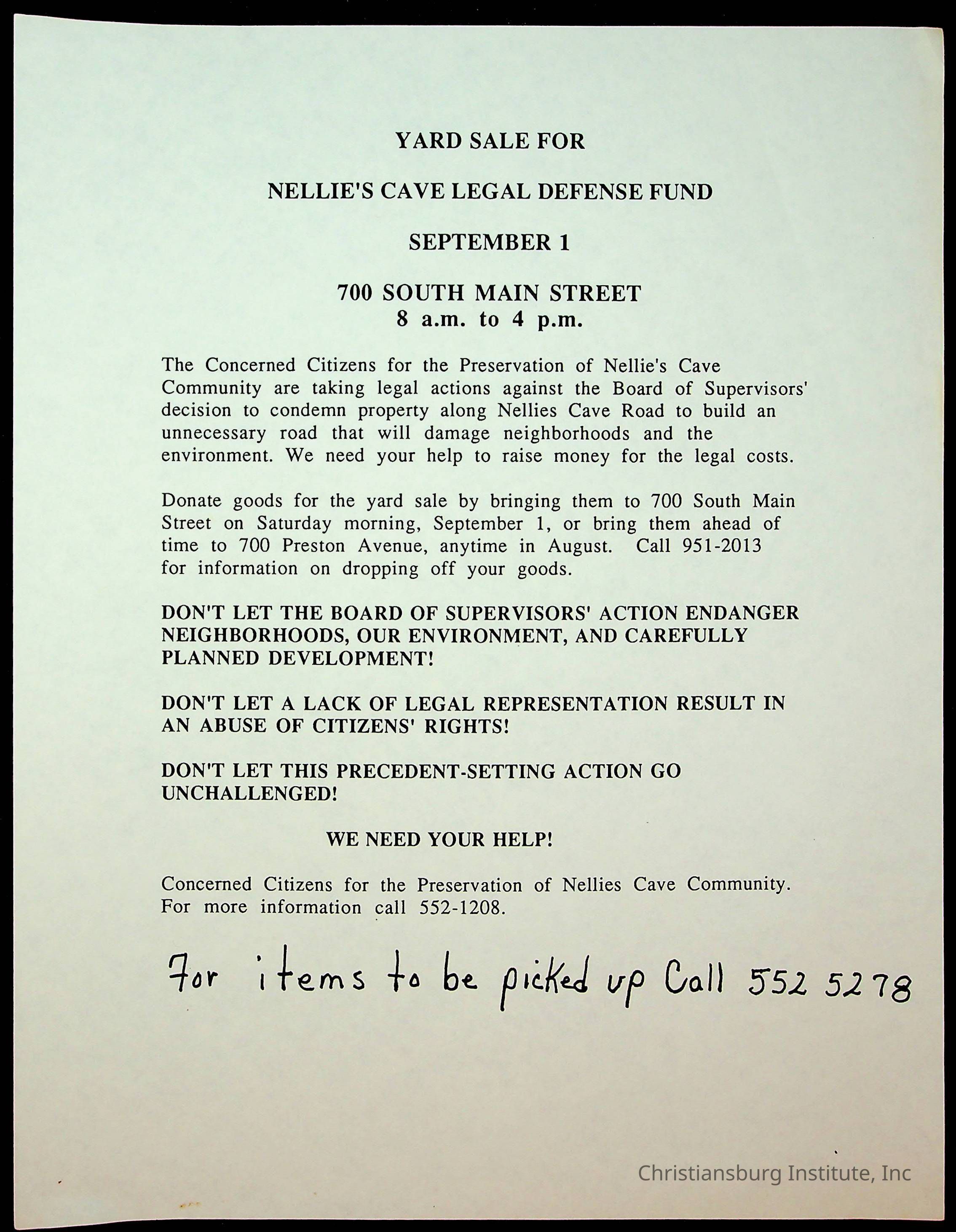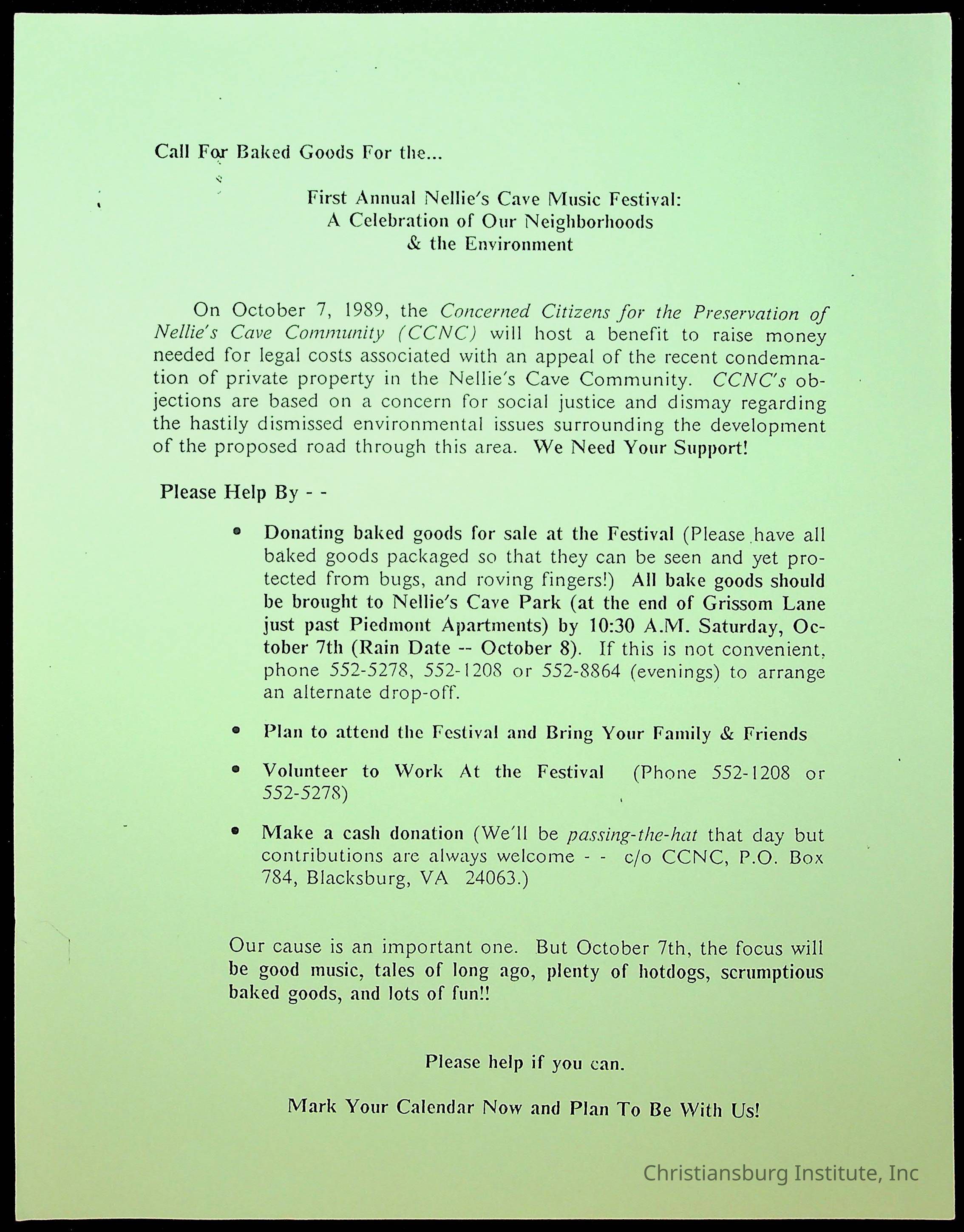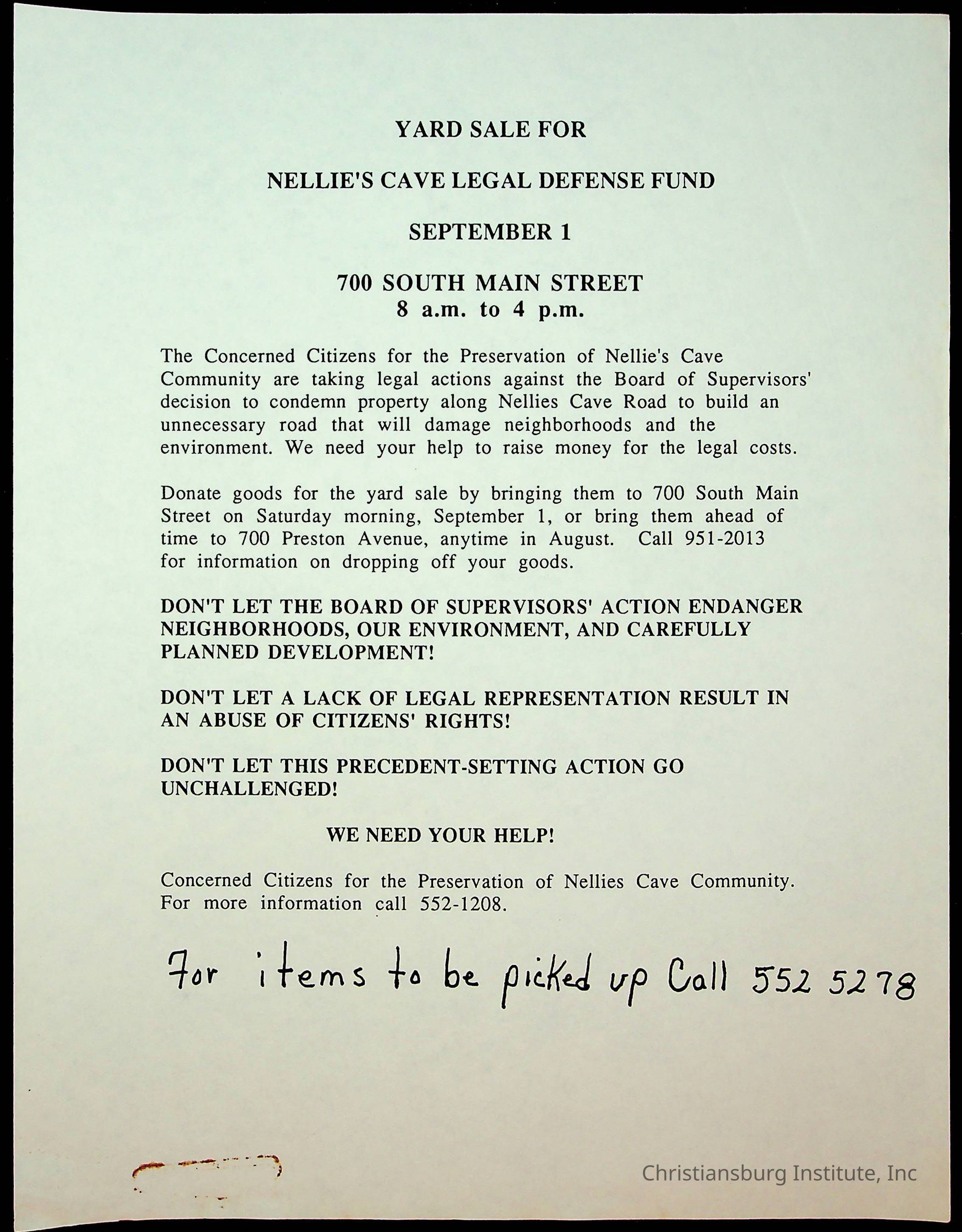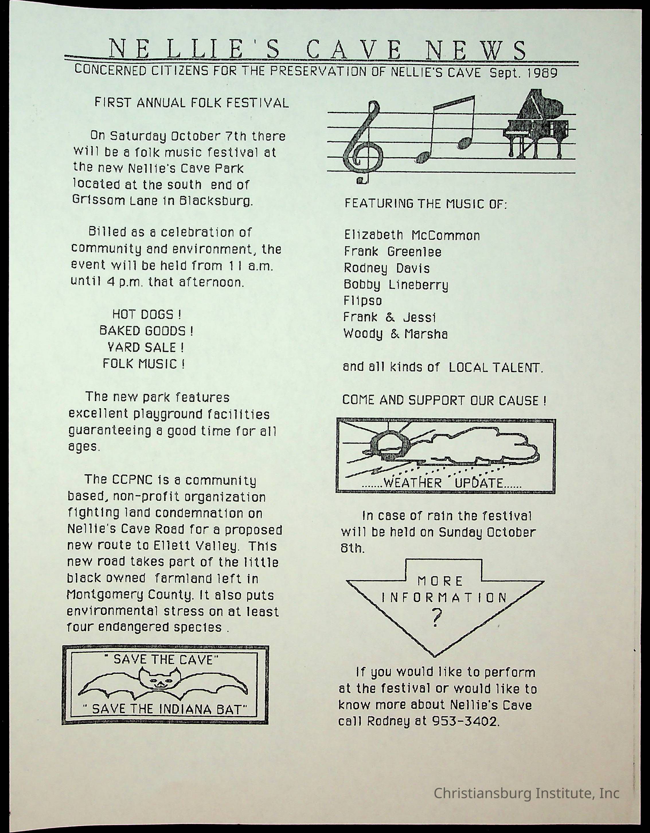 An archive of materials related to activities involving the group, Concerned Citizens for Nellies Cave Community, compiled by Elizabeth Fine circa 1990s.