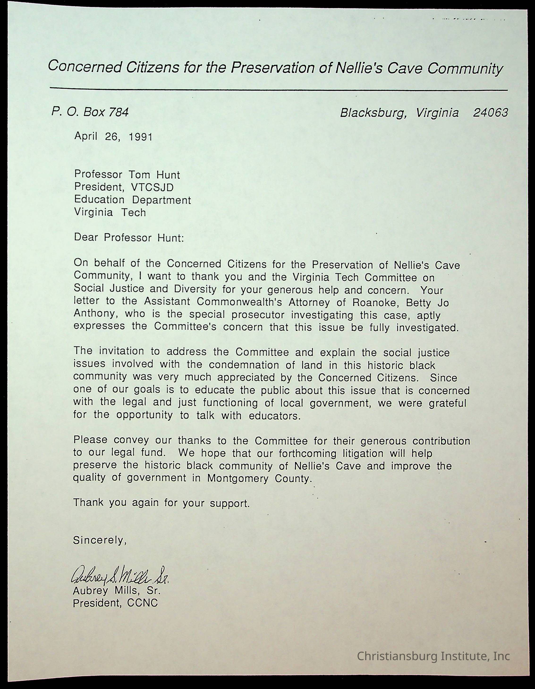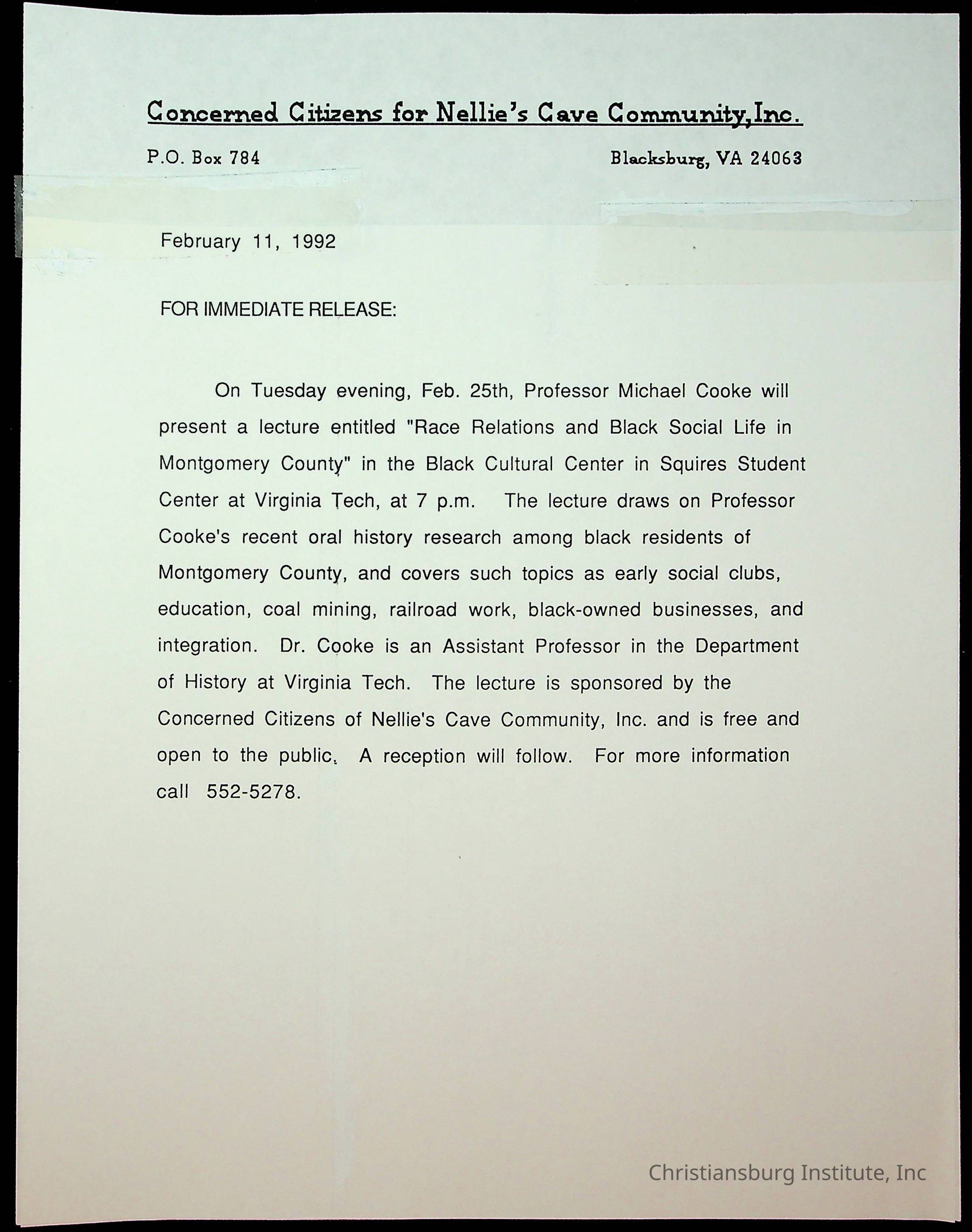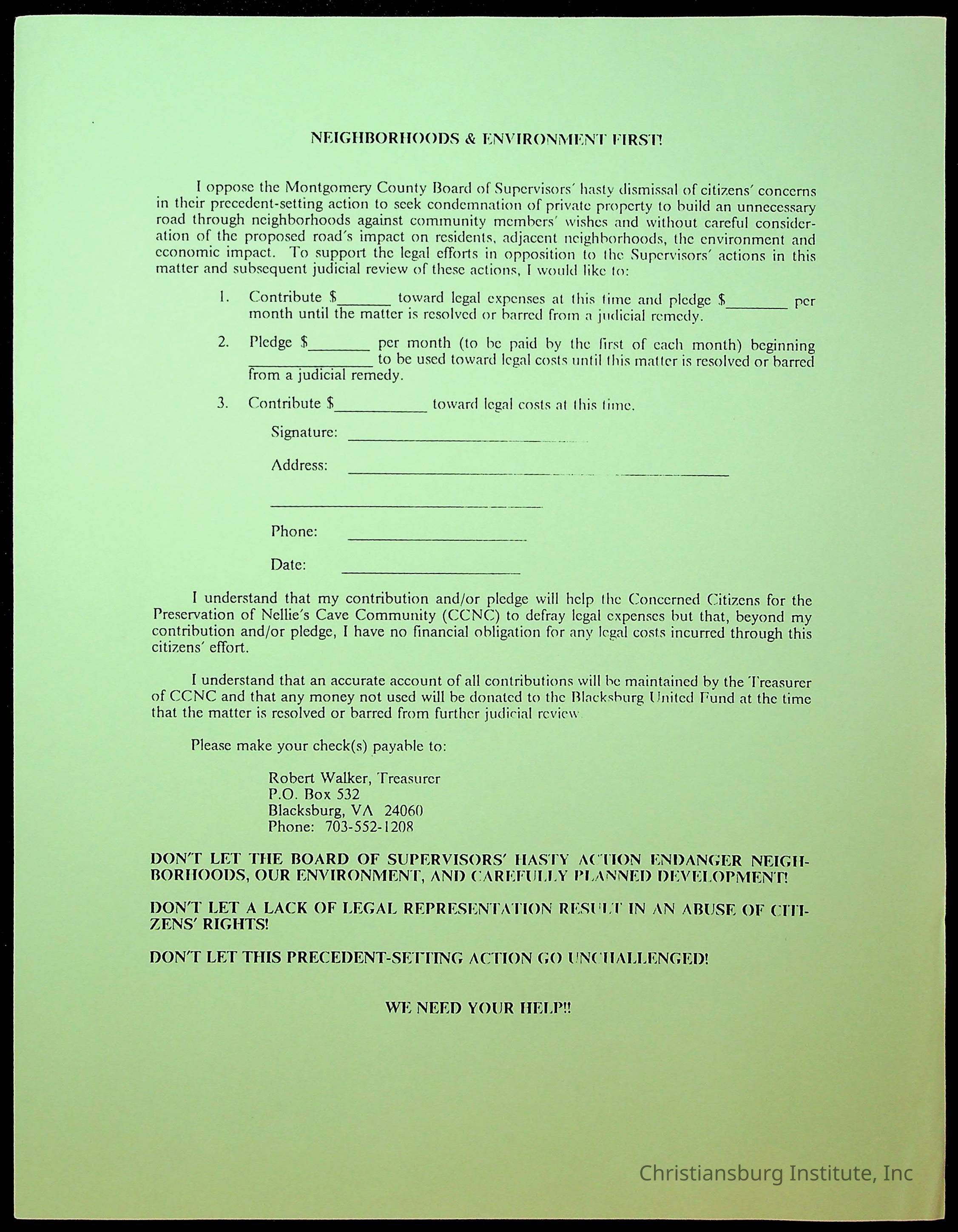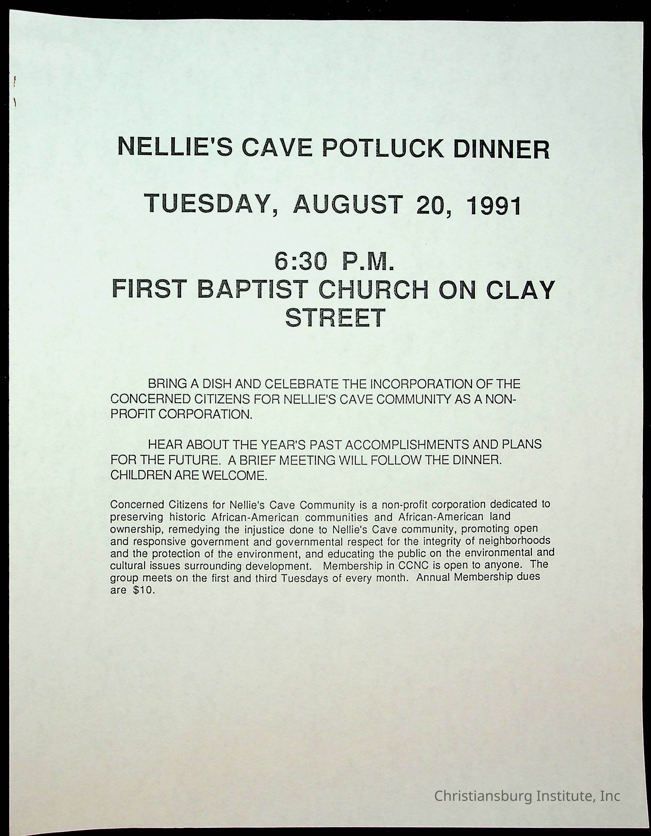 An archive of materials related to activities involving the group, Concerned Citizens for Nellies Cave Community, compiled by Elizabeth Fine circa 1990s.