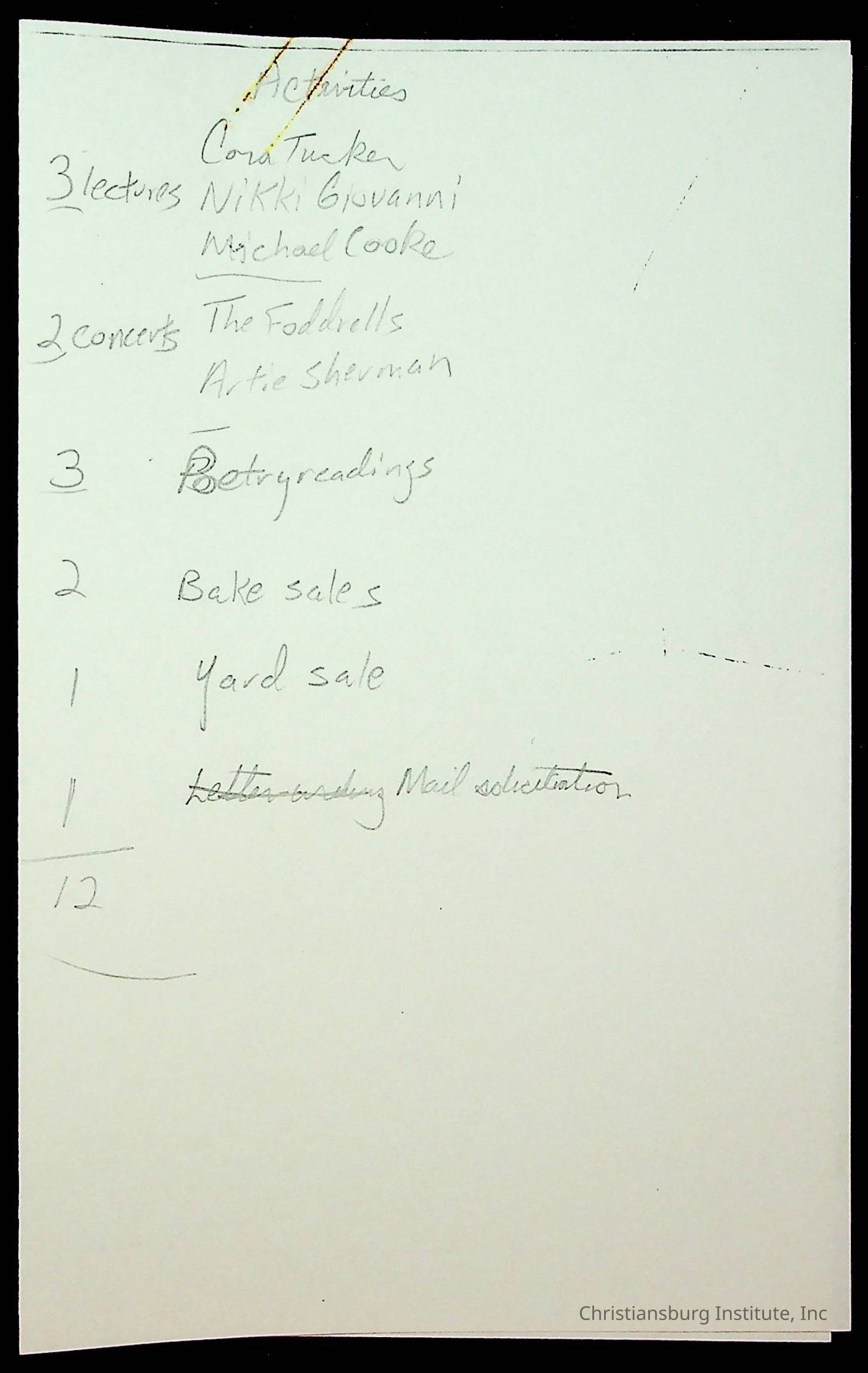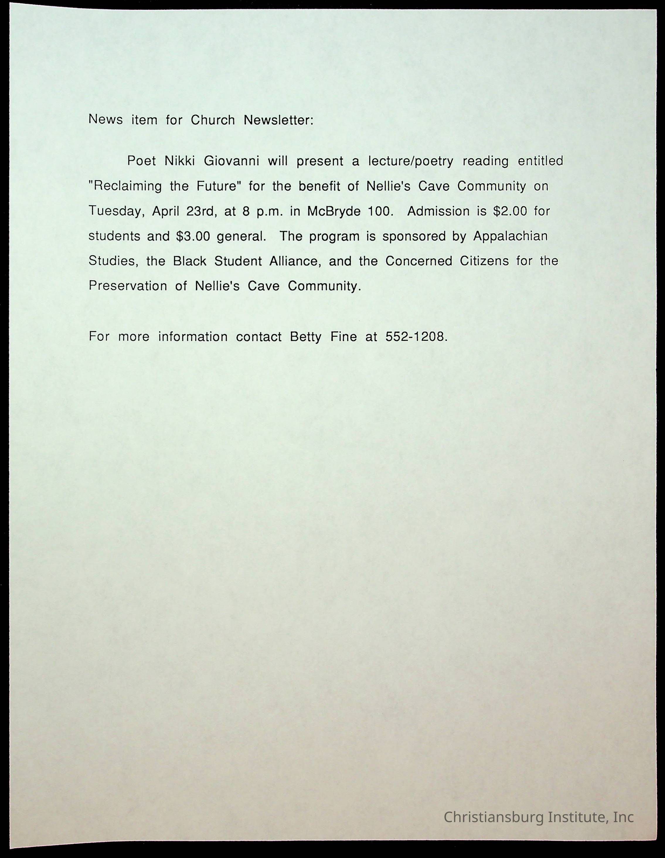 Copyright has been assigned to Christiansburg Institute Museum & Archives by Elizabeth Fine. For permission to publish materials created by the donor, contact CIMA@christiansburginstitute.com. Materials not created by Elizabeth Fine may still be under copyright.