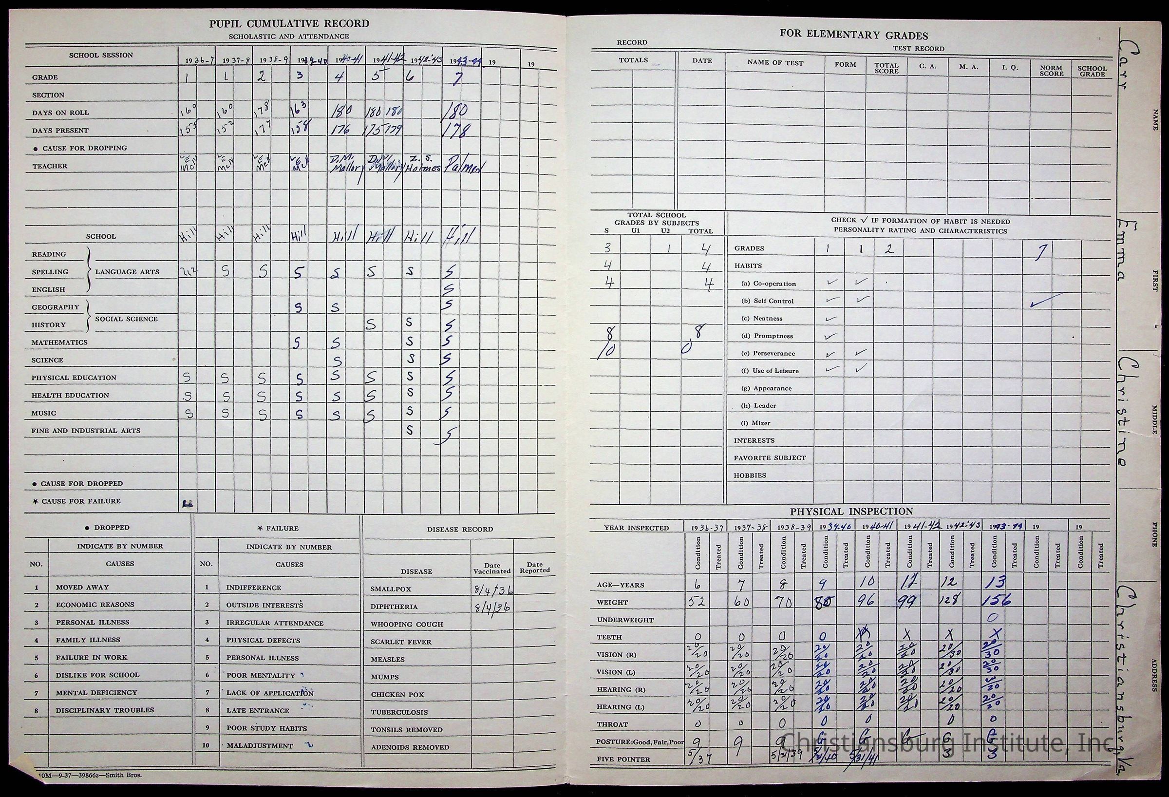 The student file for the Christiansburg Institute student, Emma Christine Carr circa 1930s-1940s.