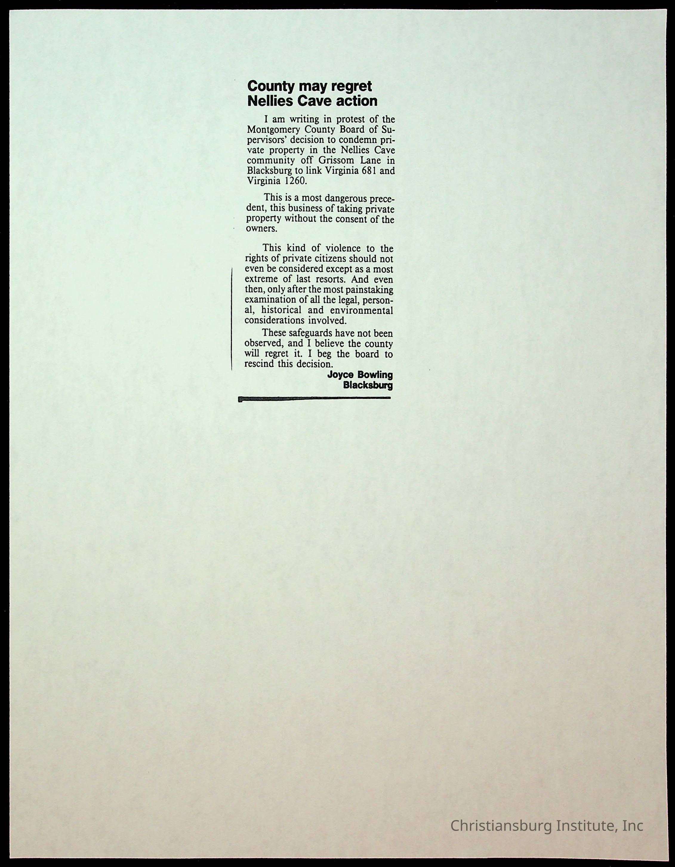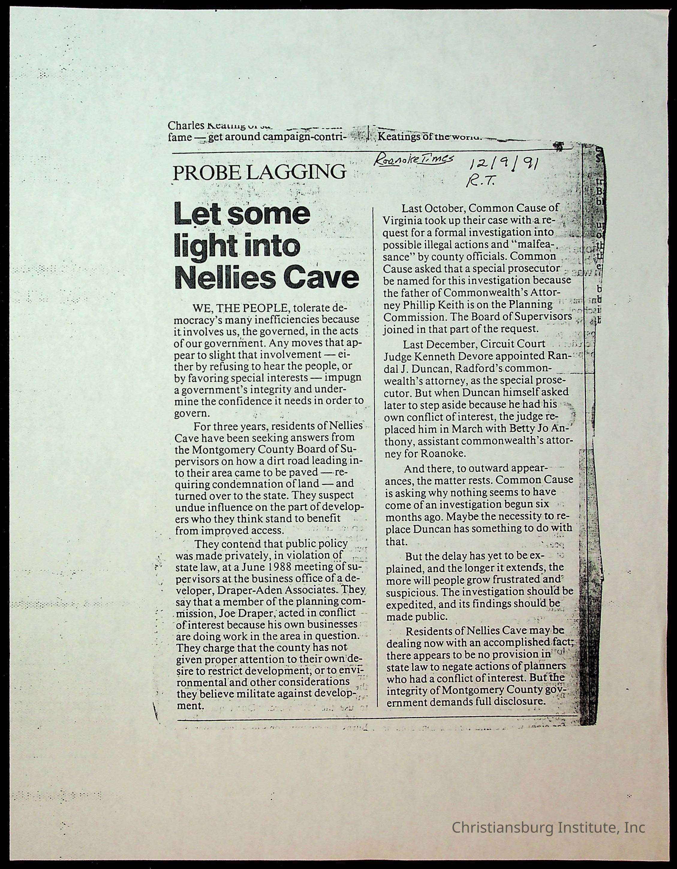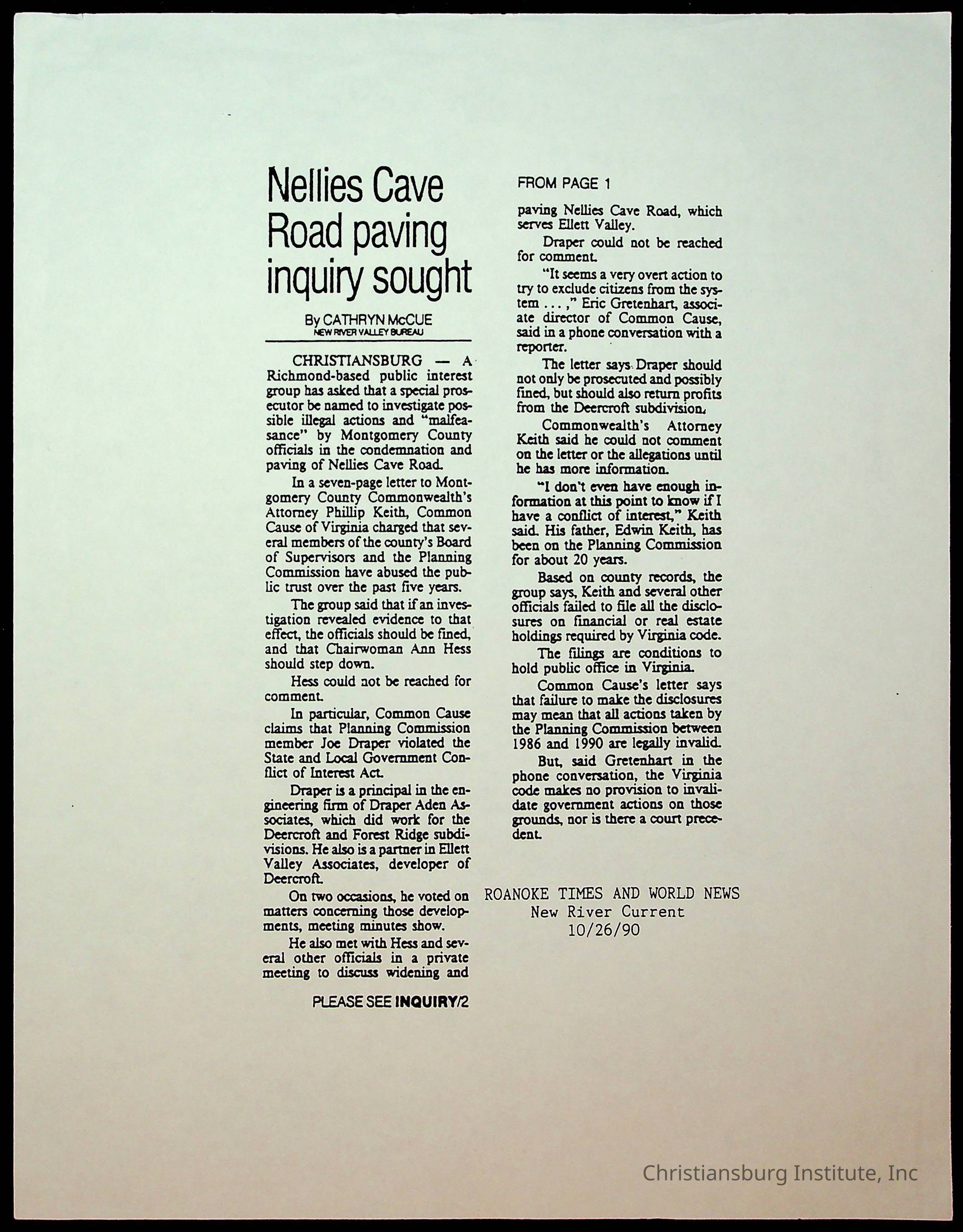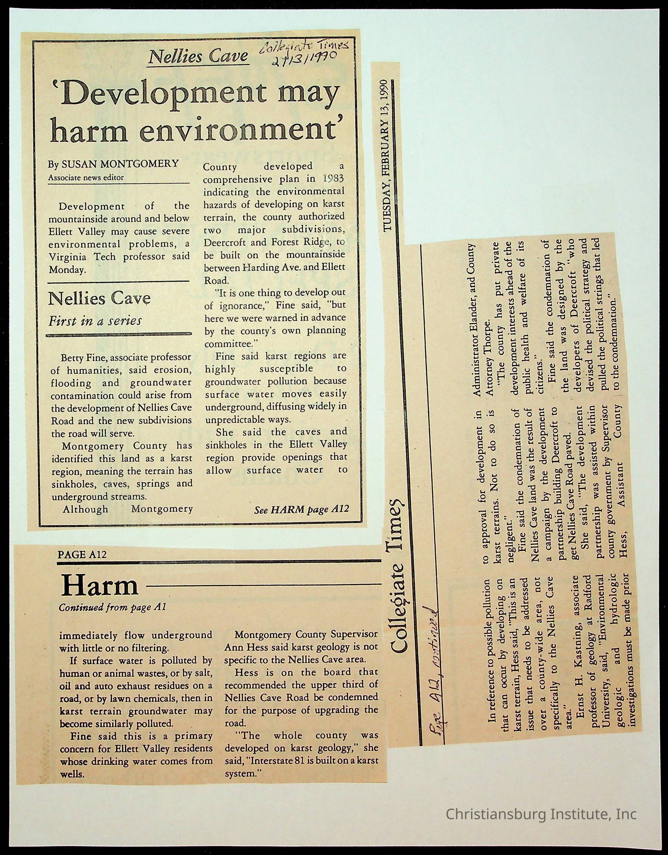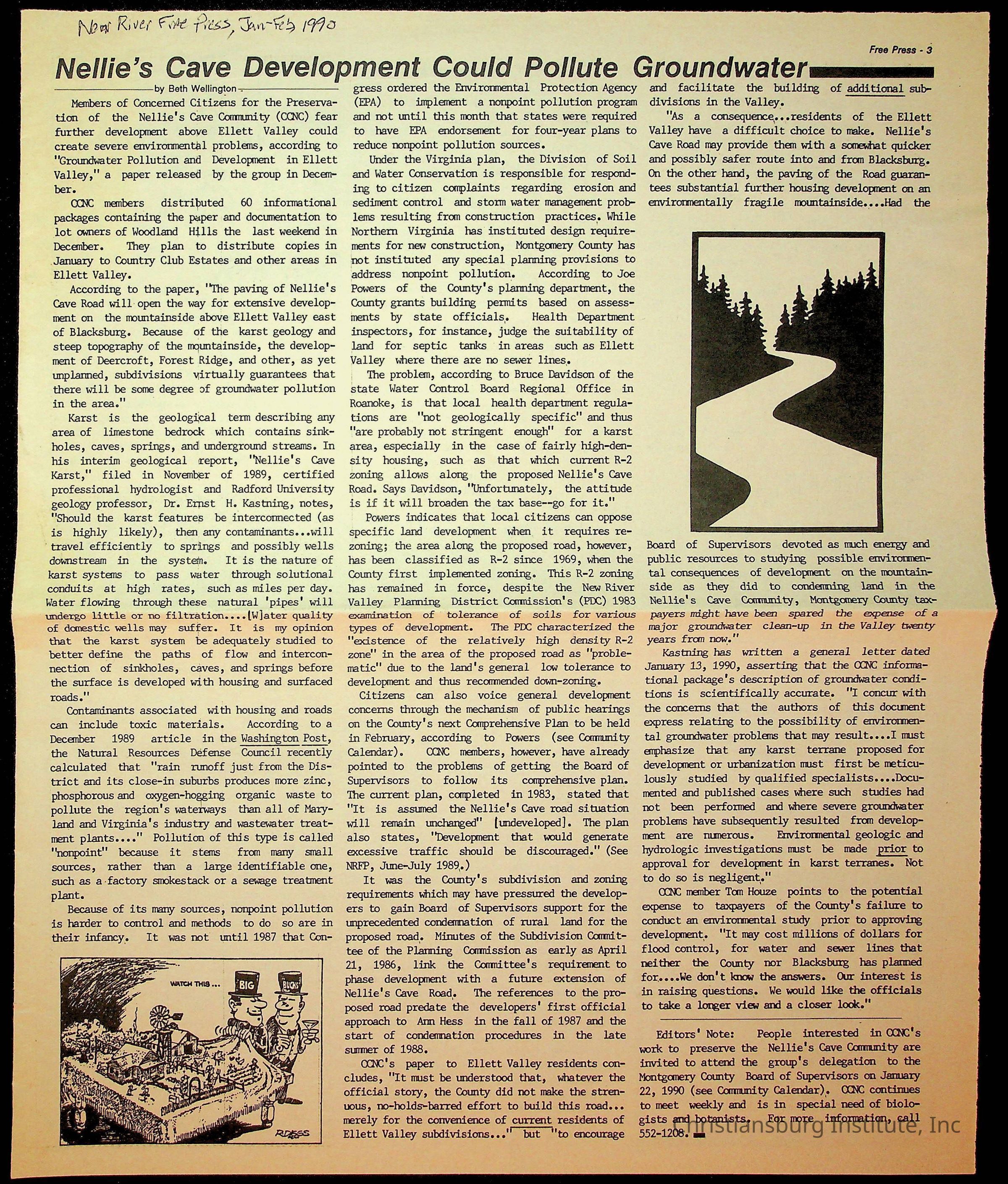 Fine, Elizabeth C., Concerned Citizens For Nellies Cave Community, Montgomery County, The Roanoke Times, The News Messenger, NRV Current