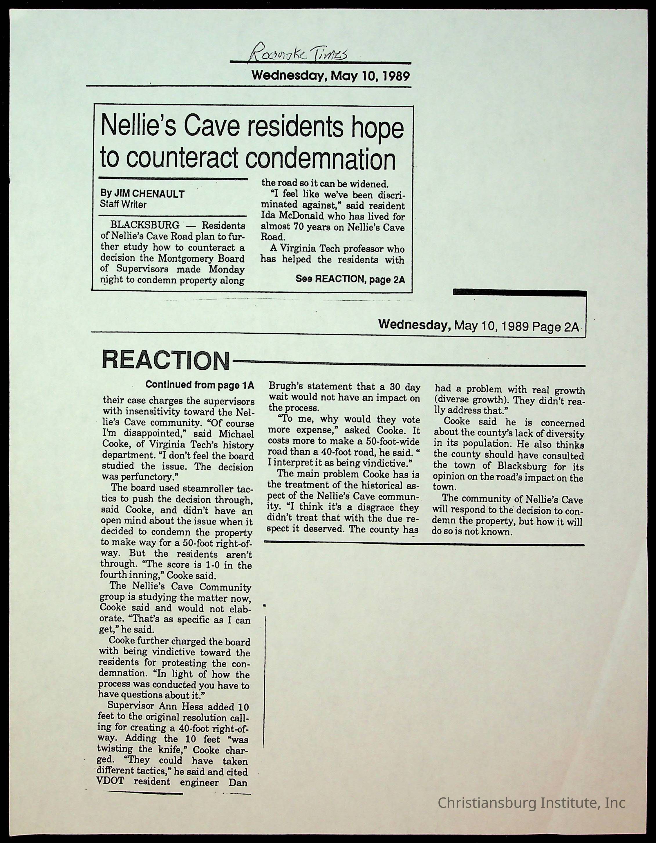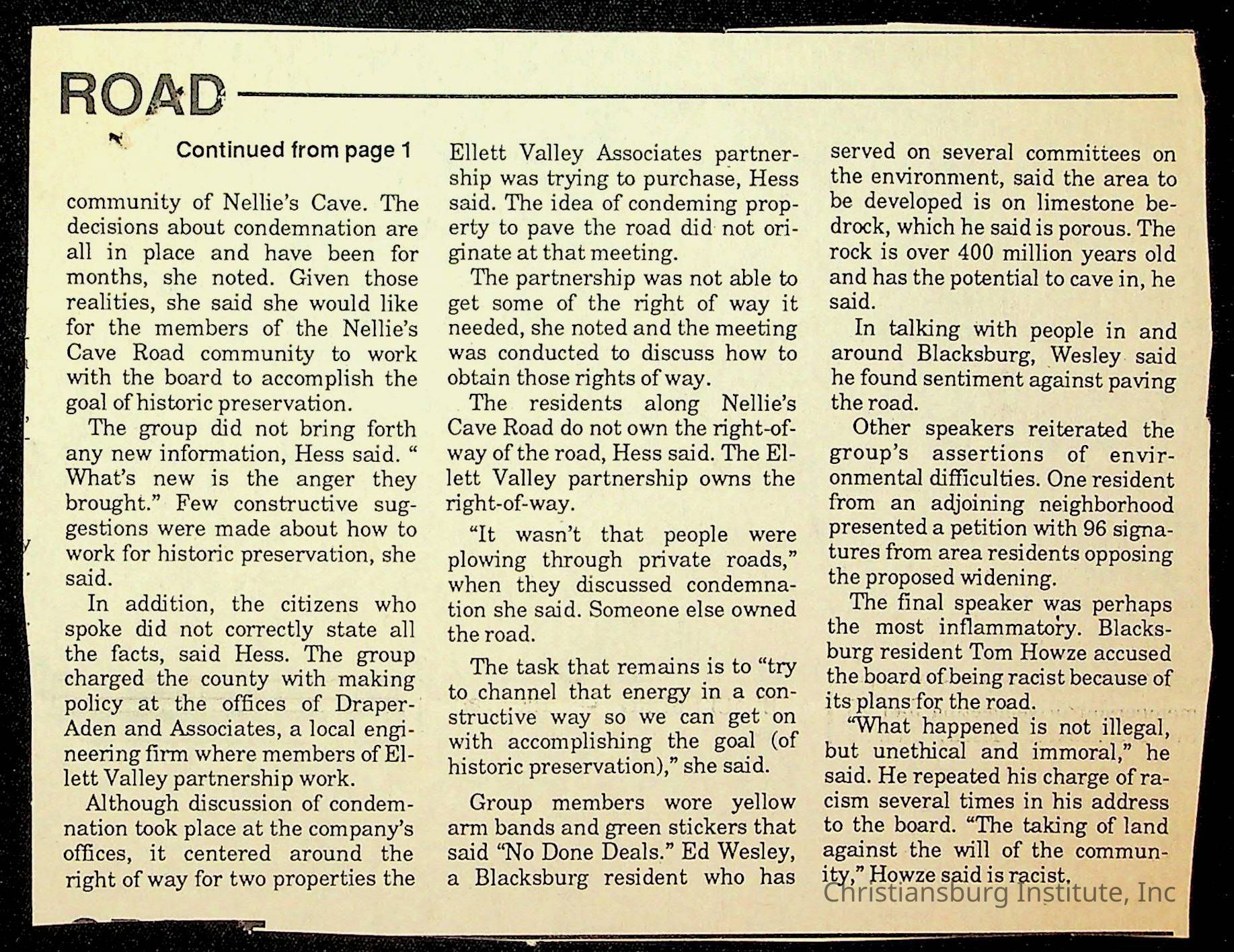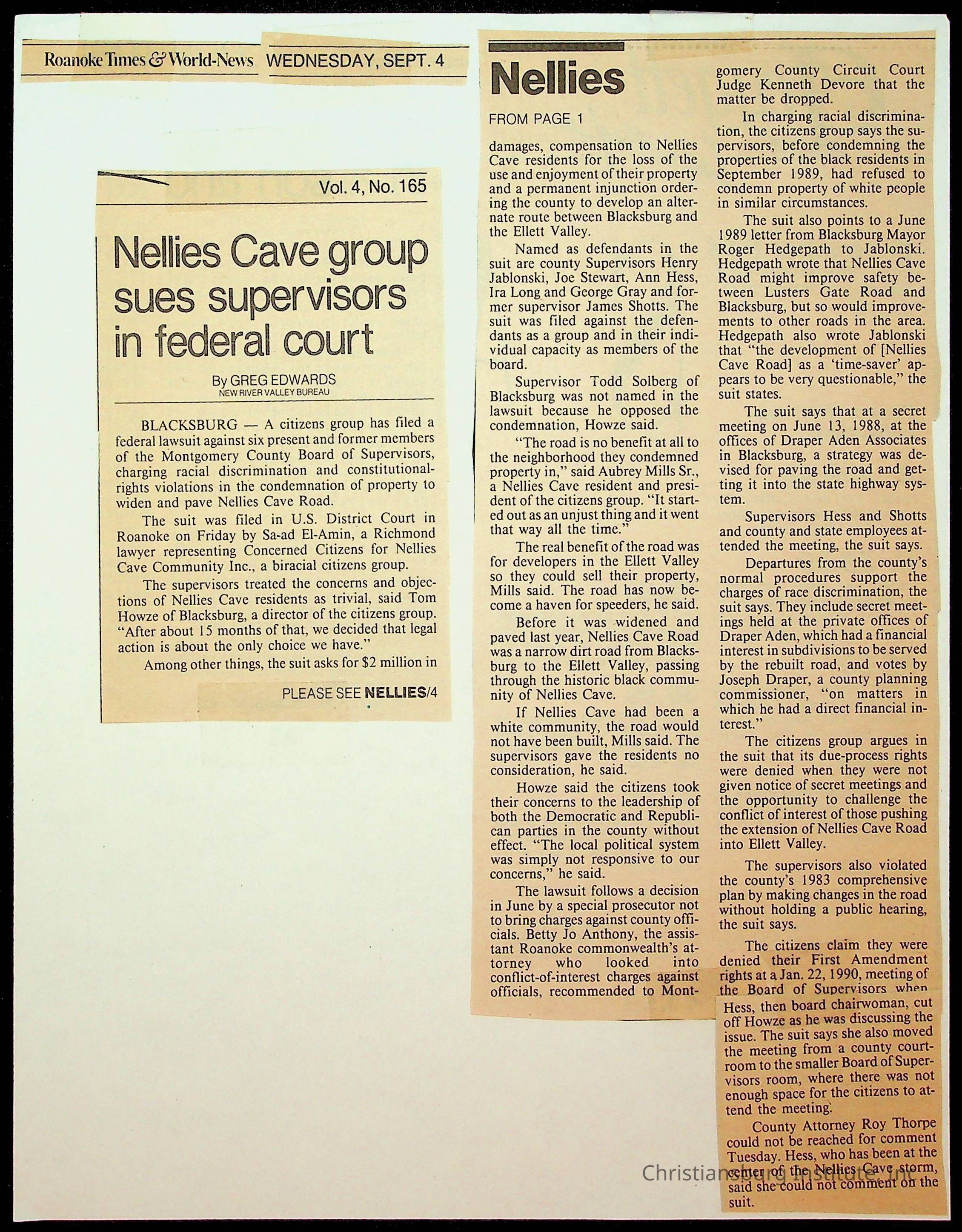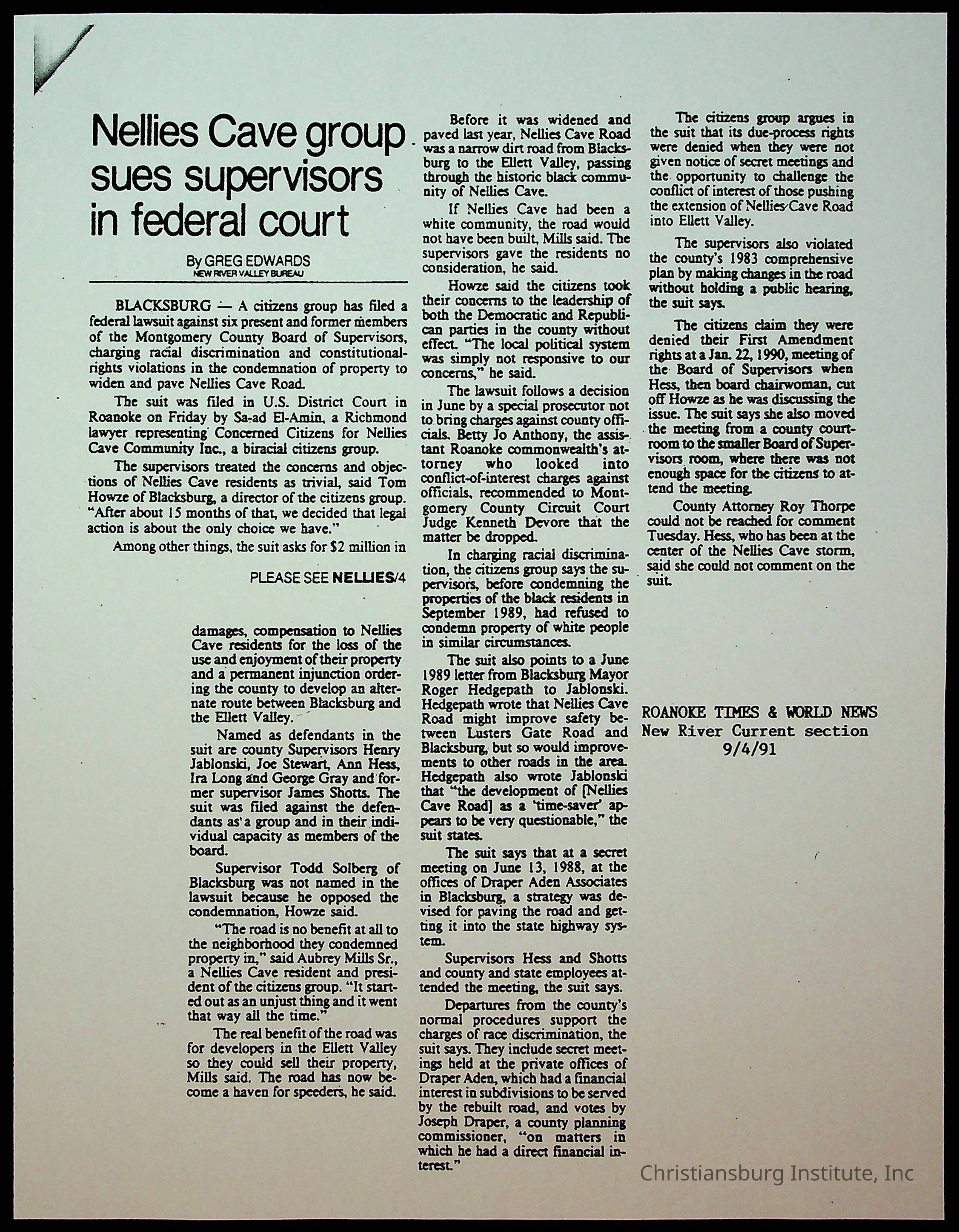 Fine, Elizabeth C., Concerned Citizens For Nellies Cave Community, Montgomery County, The Roanoke Times, The News Messenger, NRV Current