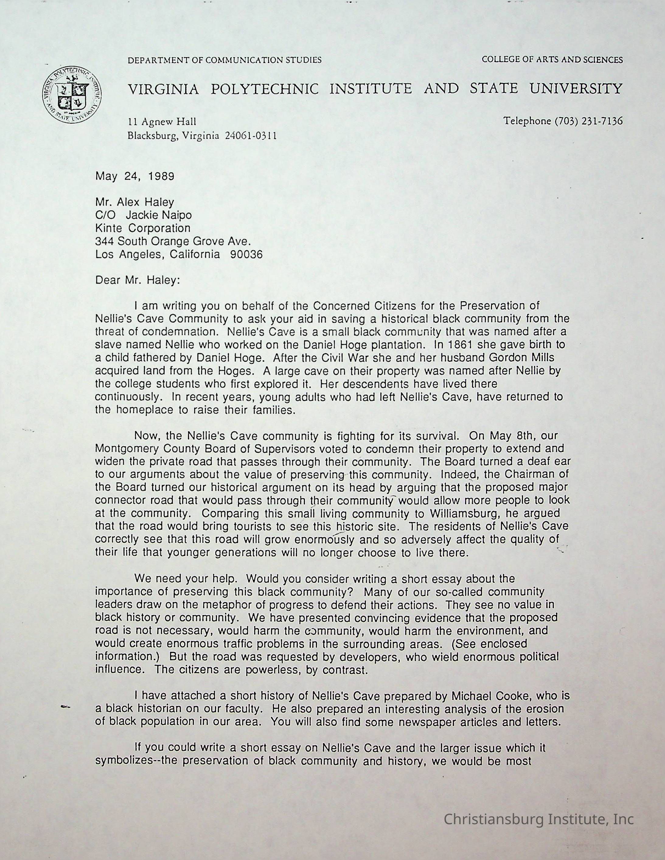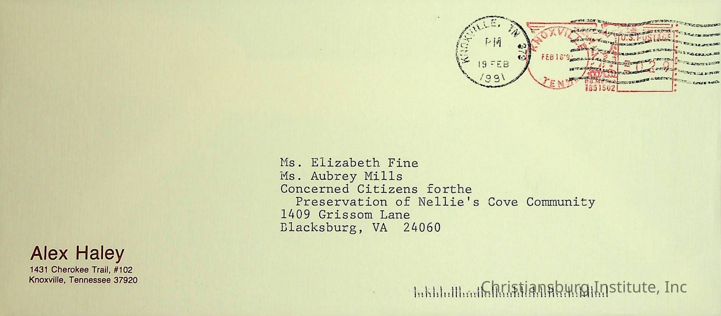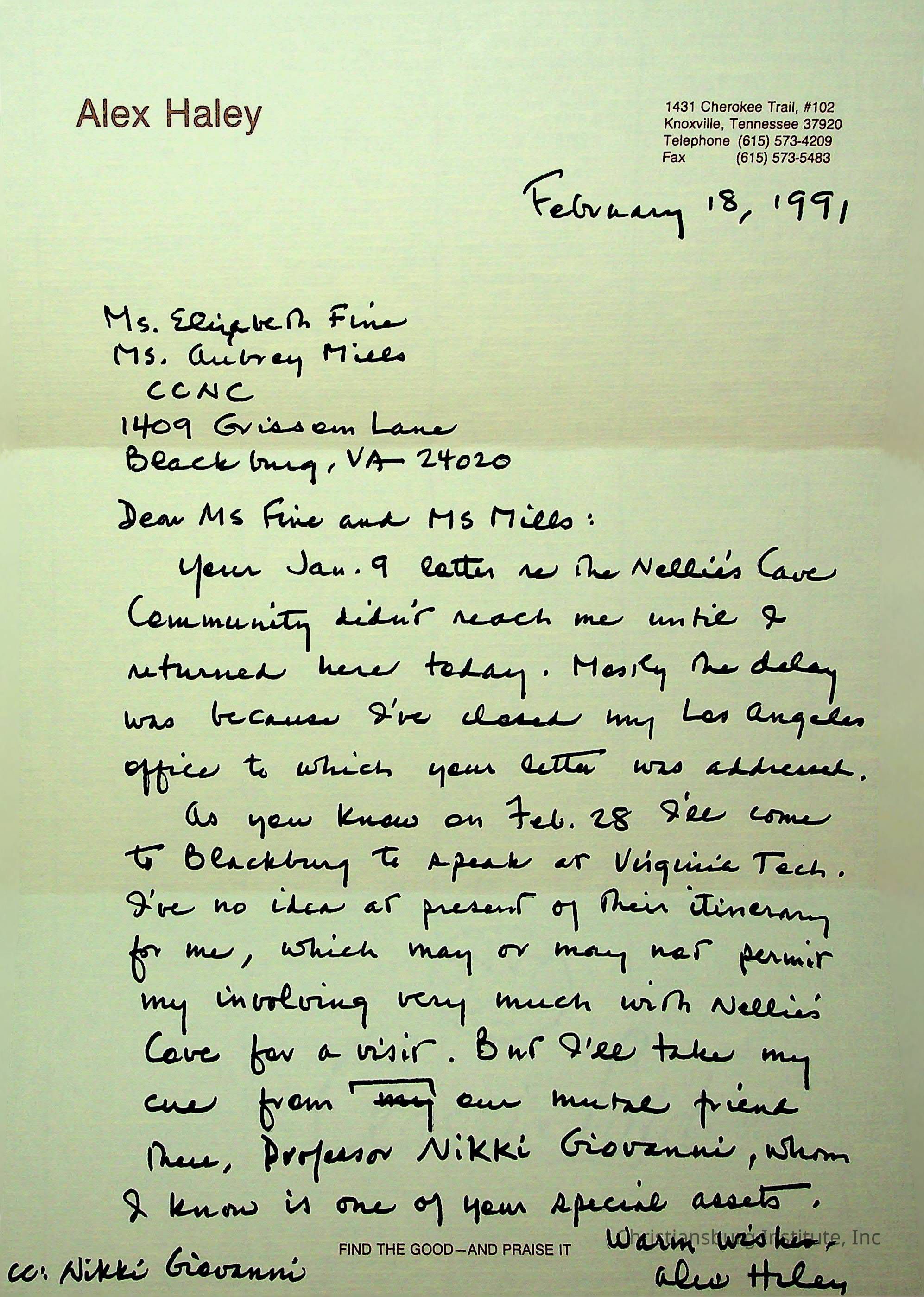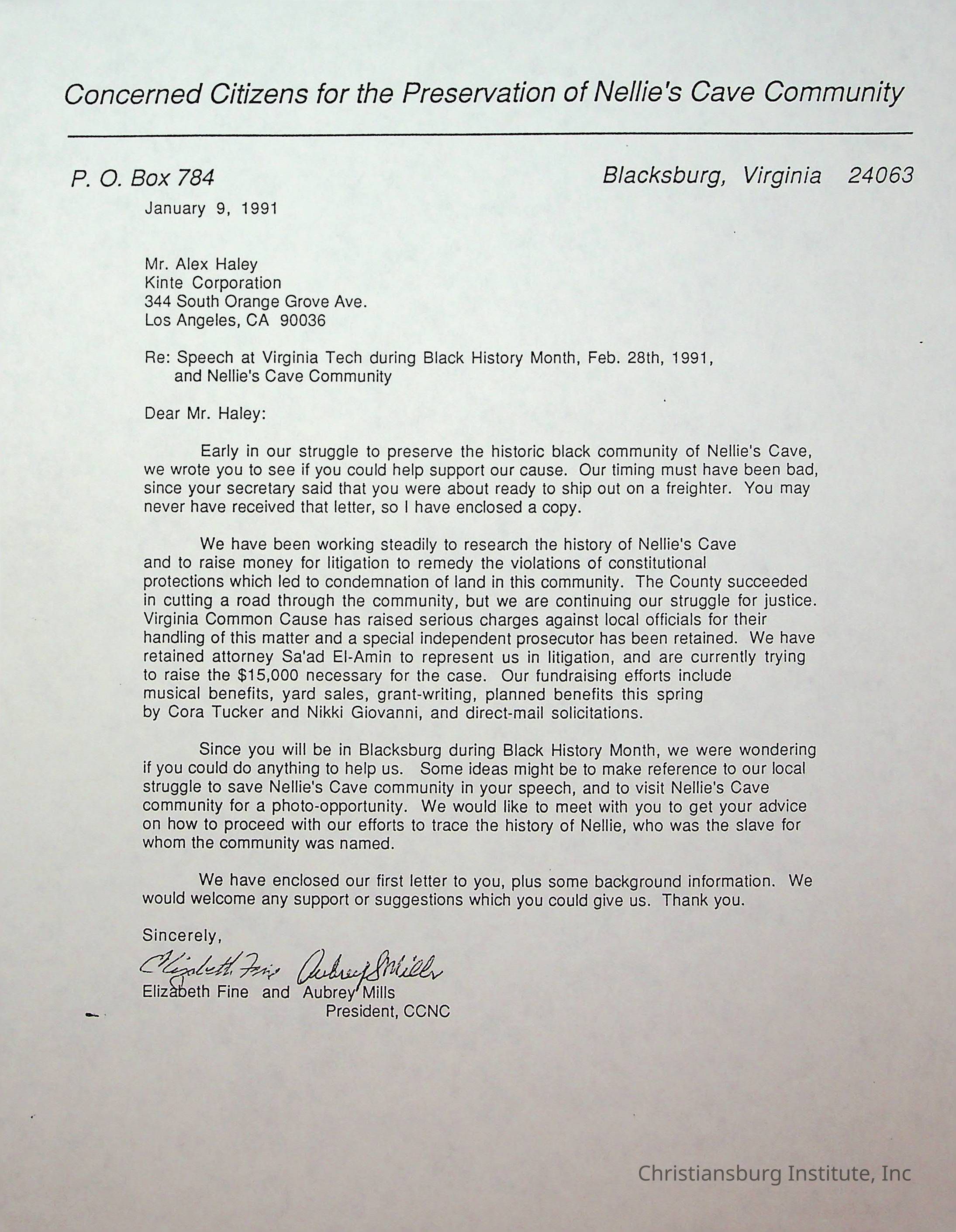 An archive of correspondence between Alex Haley and Elizabeth Fine and Aubrey Mills regarding Nellies Cave, circa 1990s.