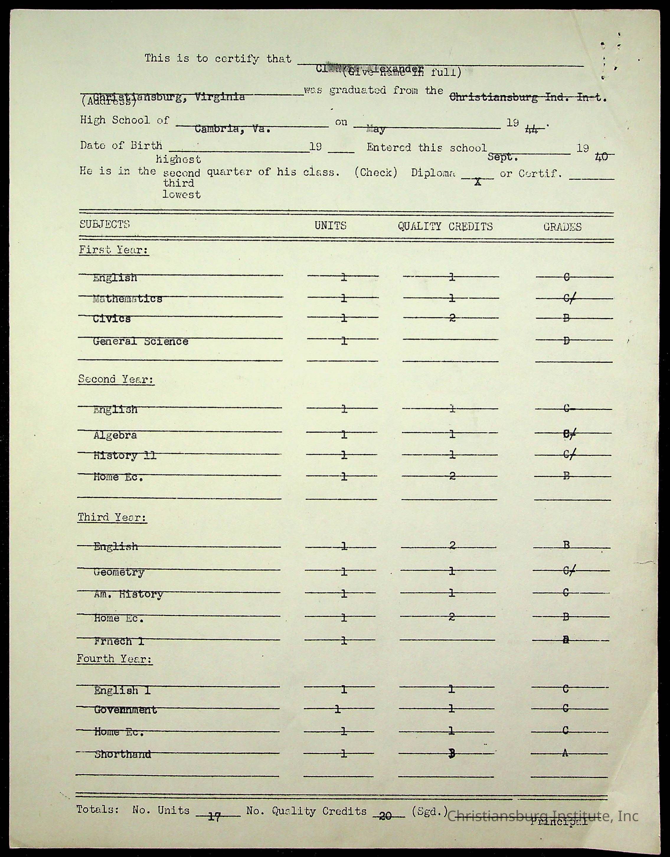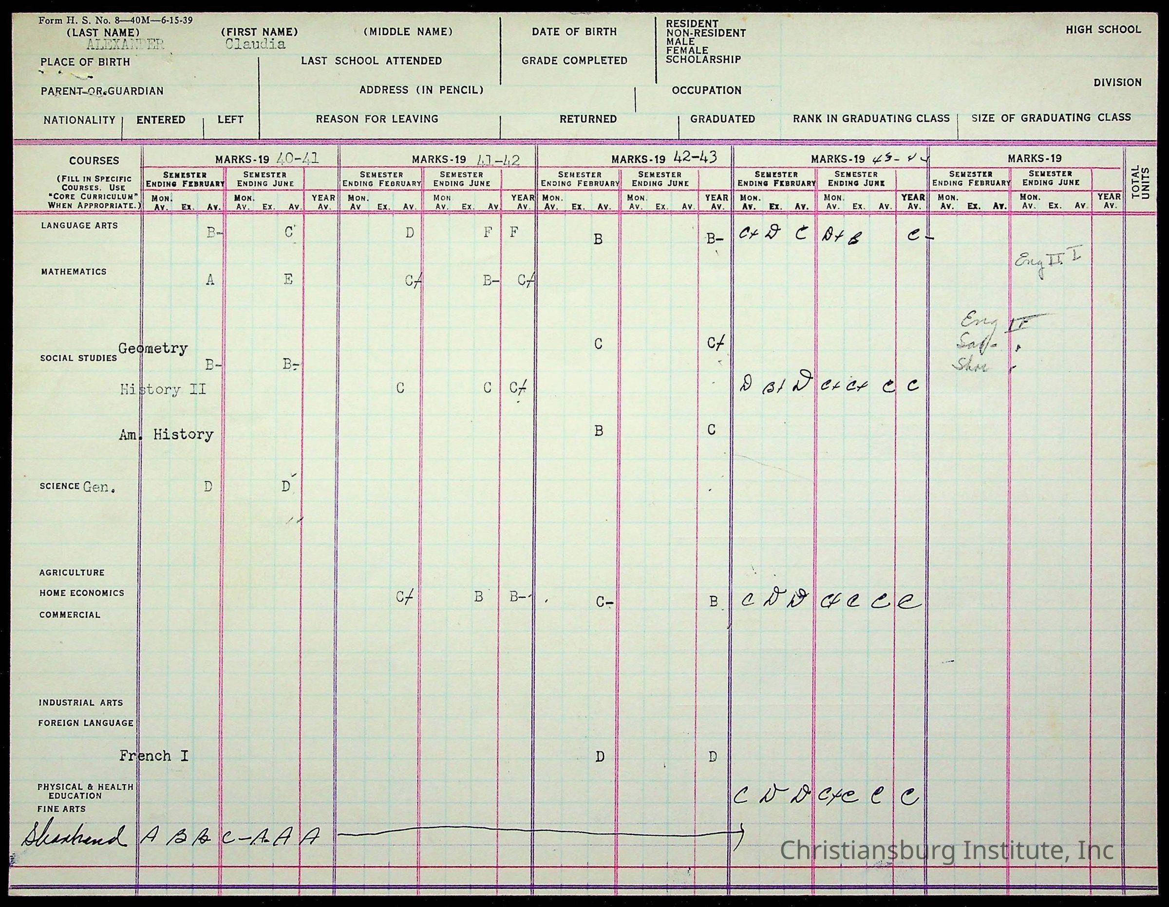 The student file for the Christiansburg Institute student, Claudia Alexander circa 1940s.