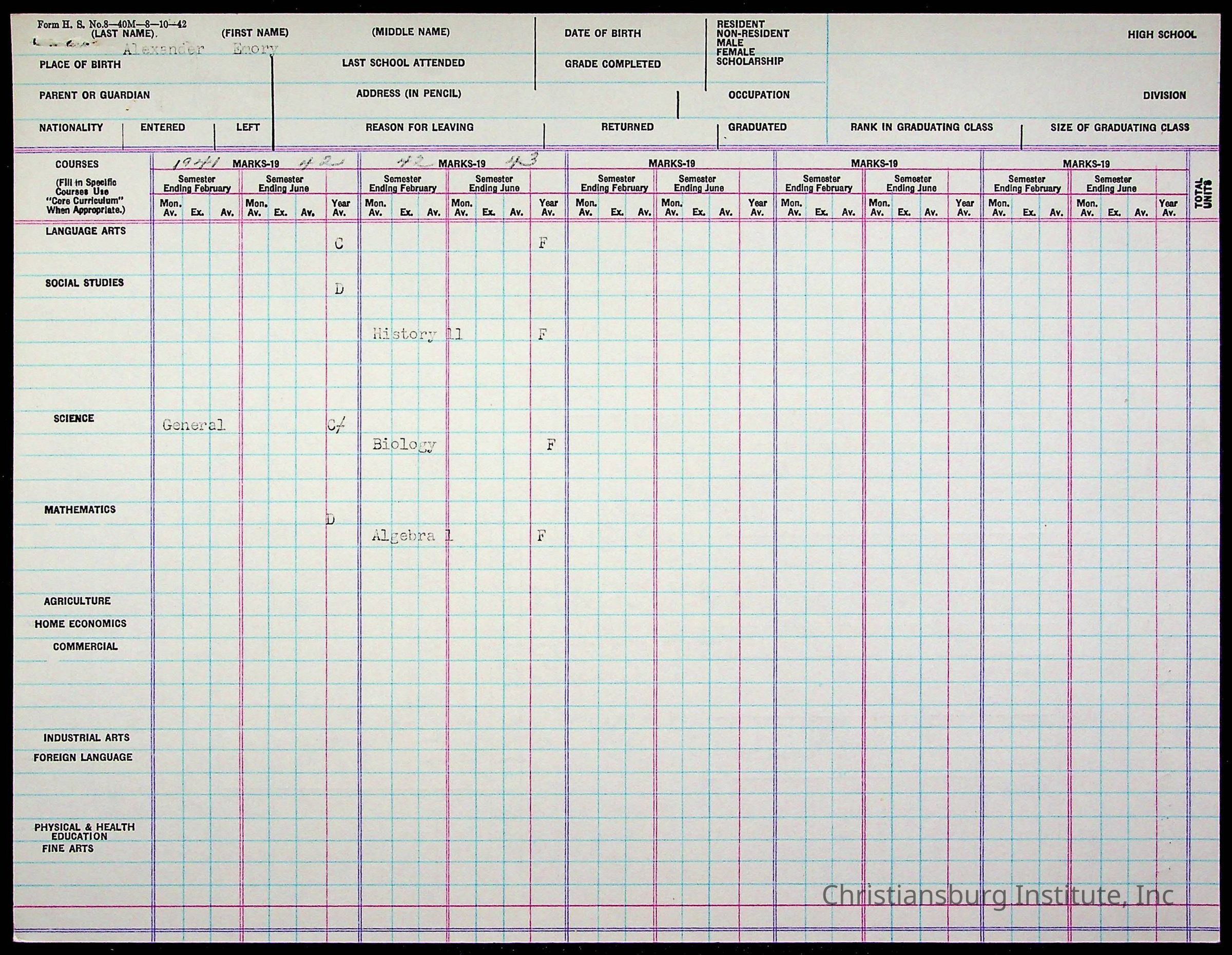 The student file for the Christiansburg Institute student, Emory Alexander circa 1940s.