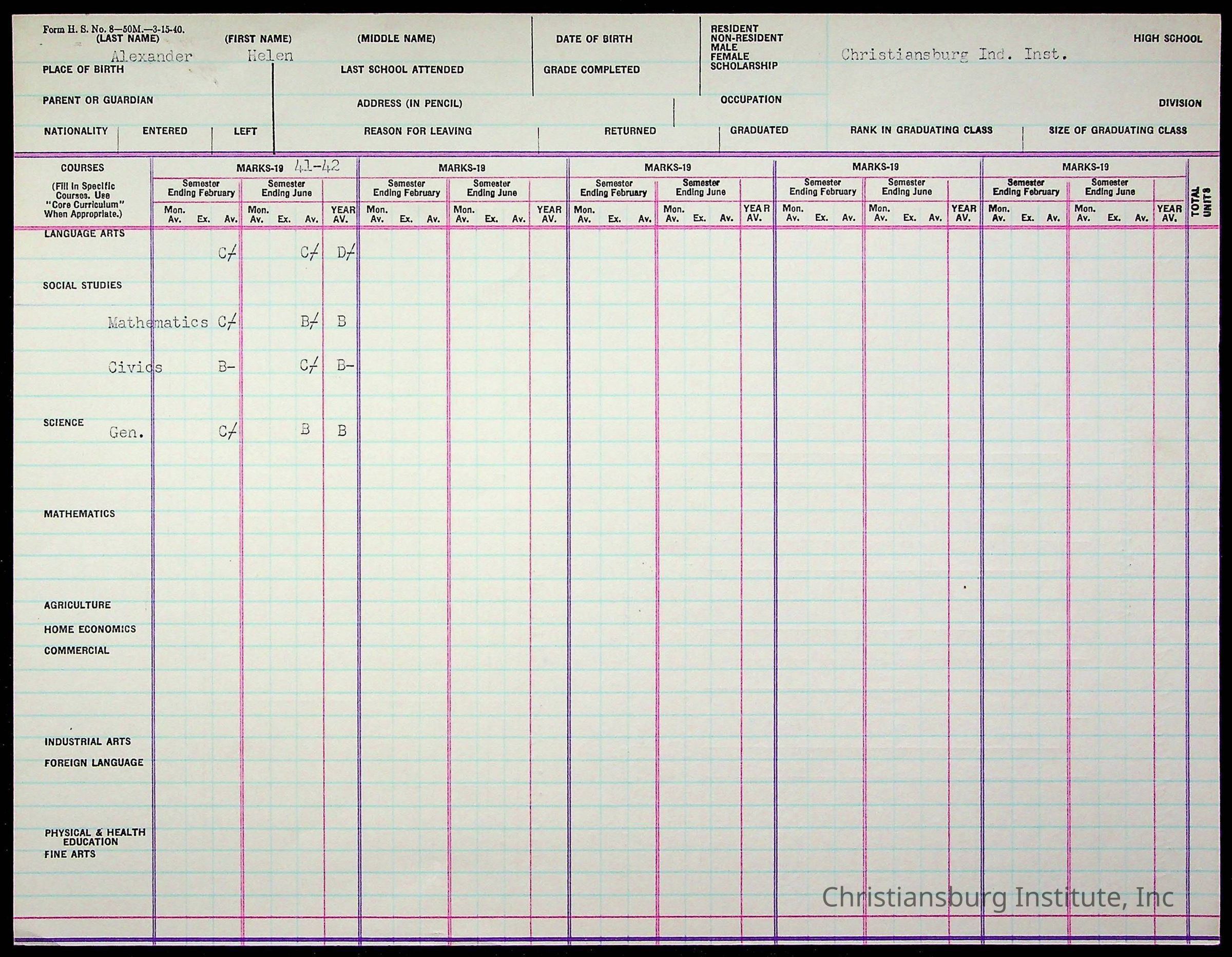The student file for the Christiansburg Institute student, Helen Alexander dated 1941-1942.