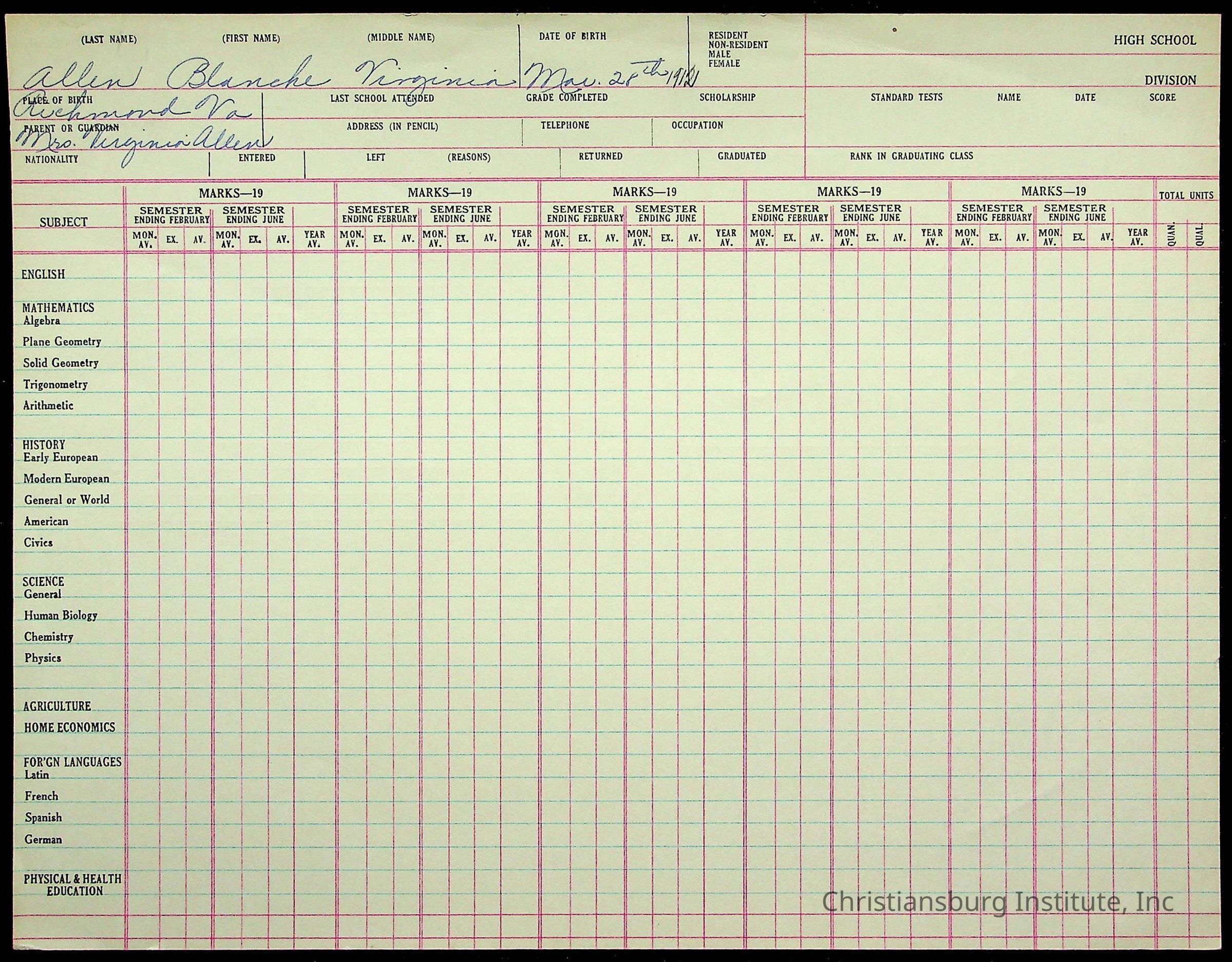 Montgomery County Public Schools, Christiansburg Institute, Allen, Blanche
