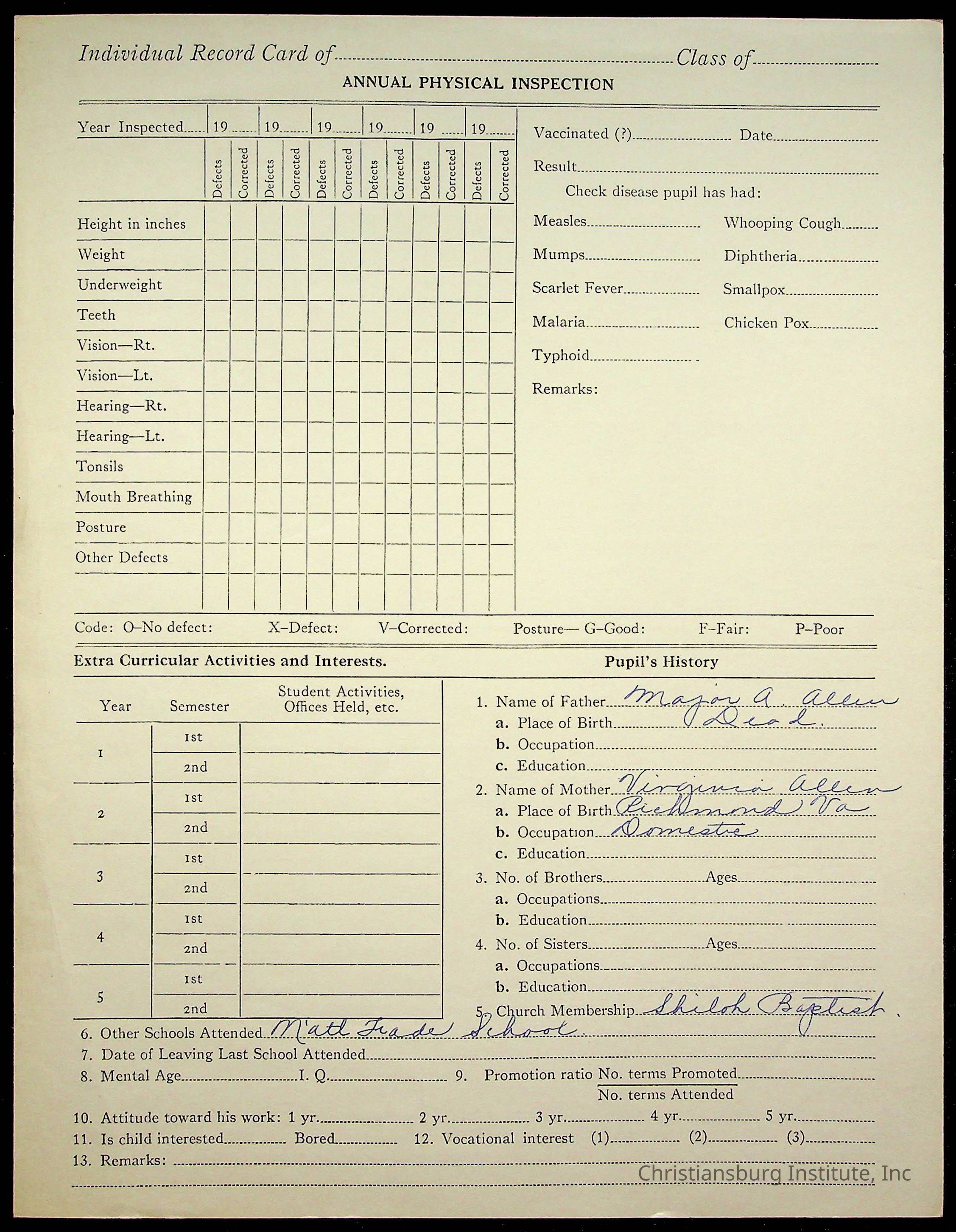 The student file for the Christiansburg Institute student, Blanche Allen circa 1920s.