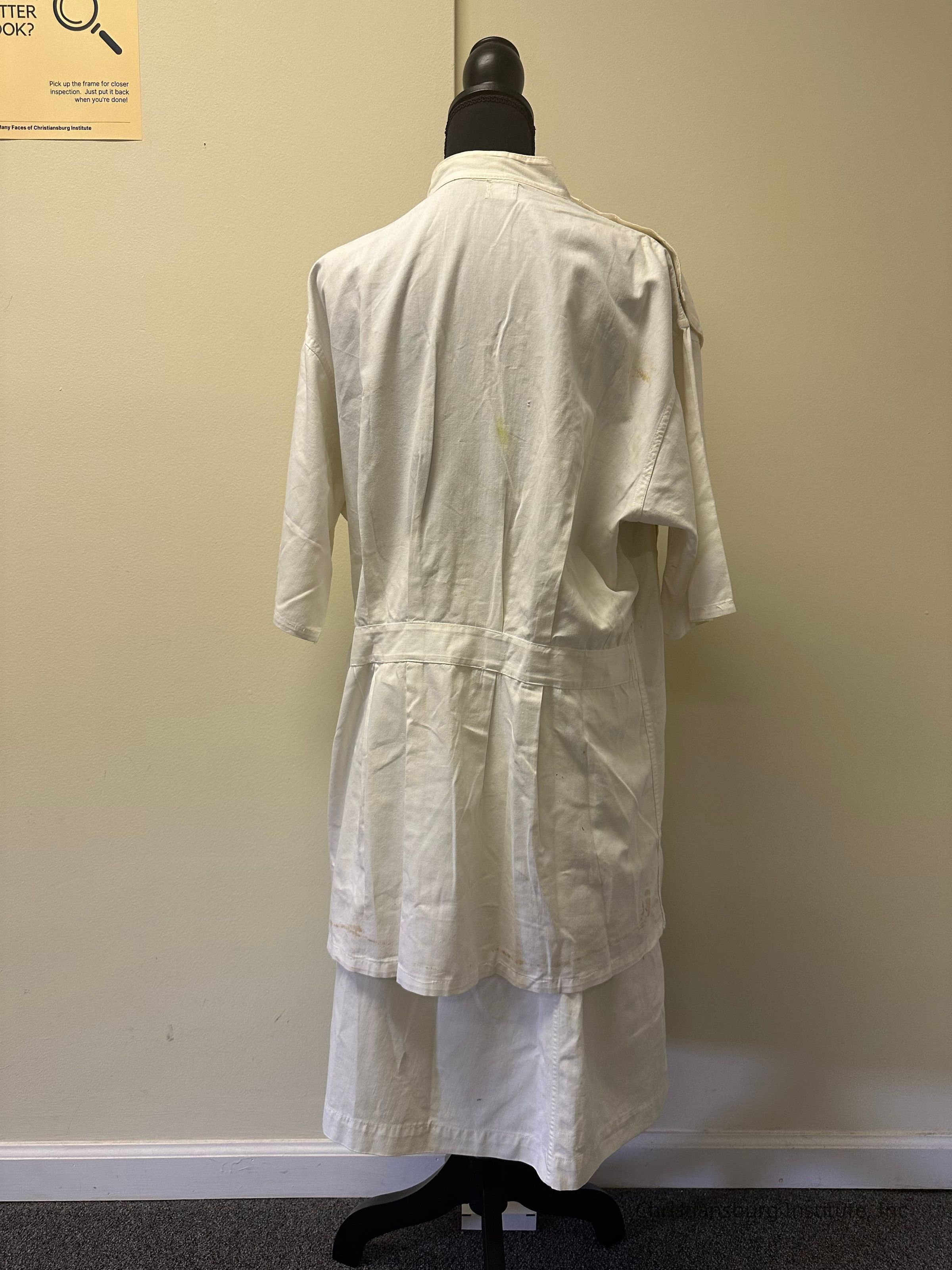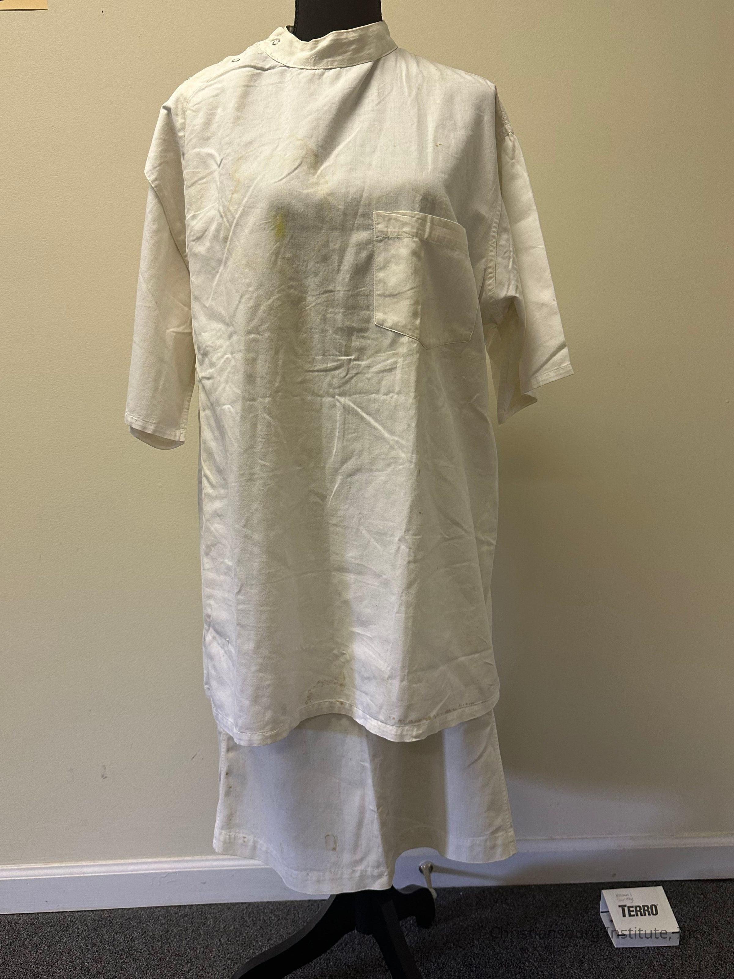 Amanda DeHart's cosmetology uniform; tunic and apron, made of white cotton, undated. There is some damage including some staining.Collection
