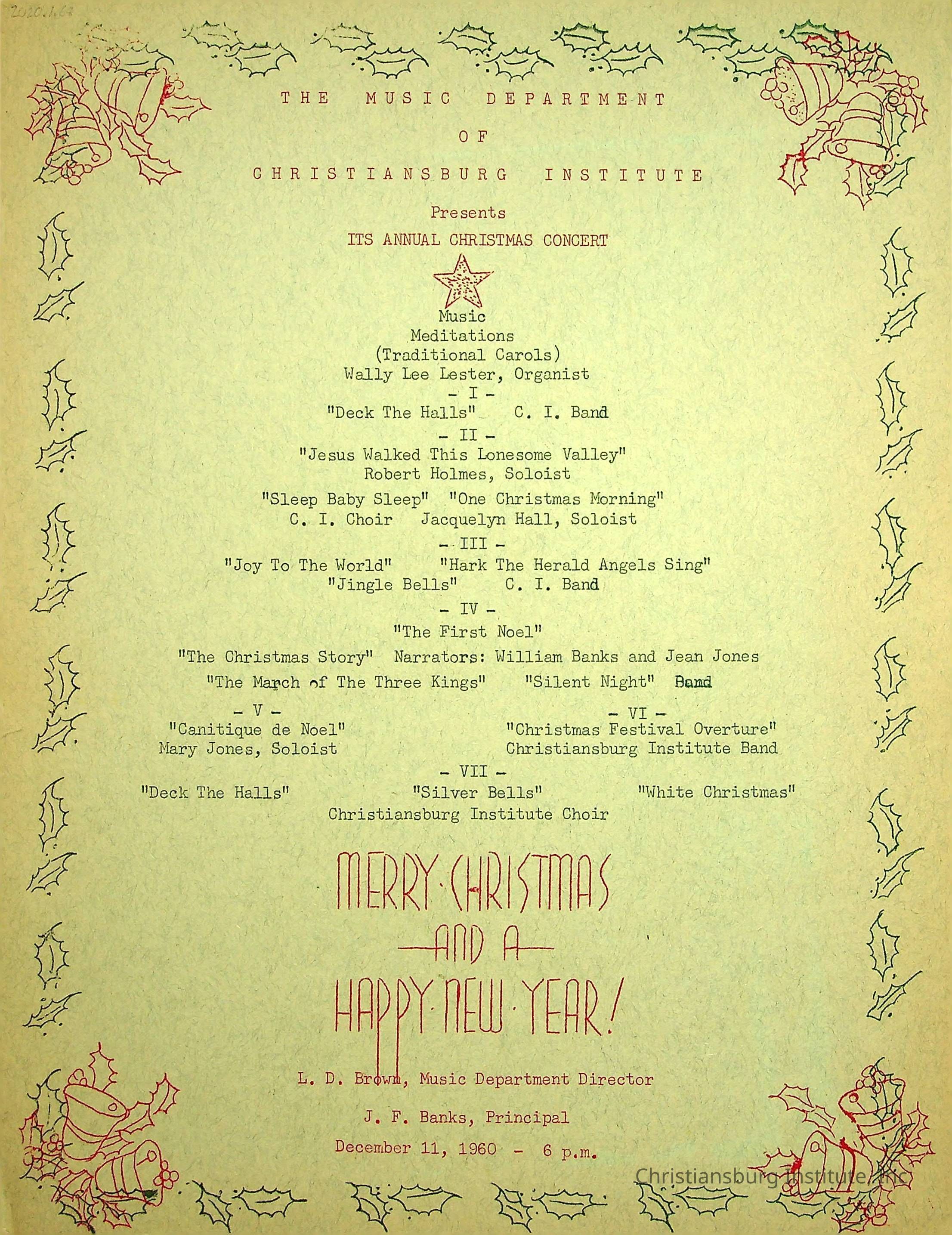 An event program from the Christiansburg Institute annual Christmas Concert held on December 11th, 1960.