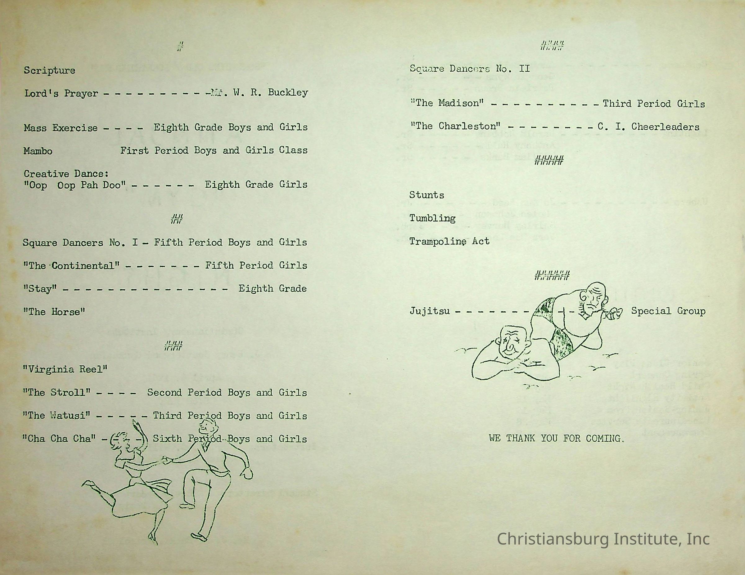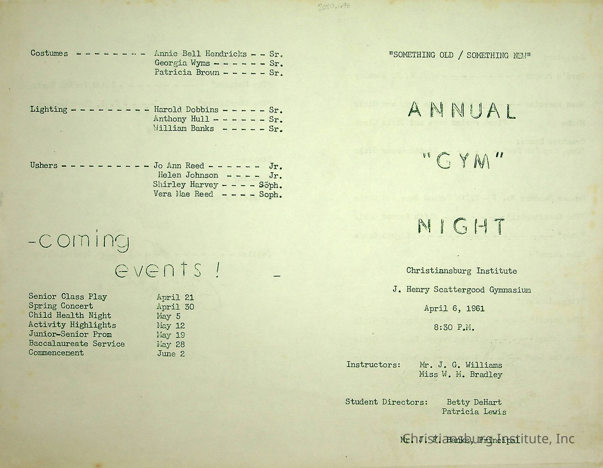 An event program for the annual gym night at Christiansburg Institute on April 6th, 1961.