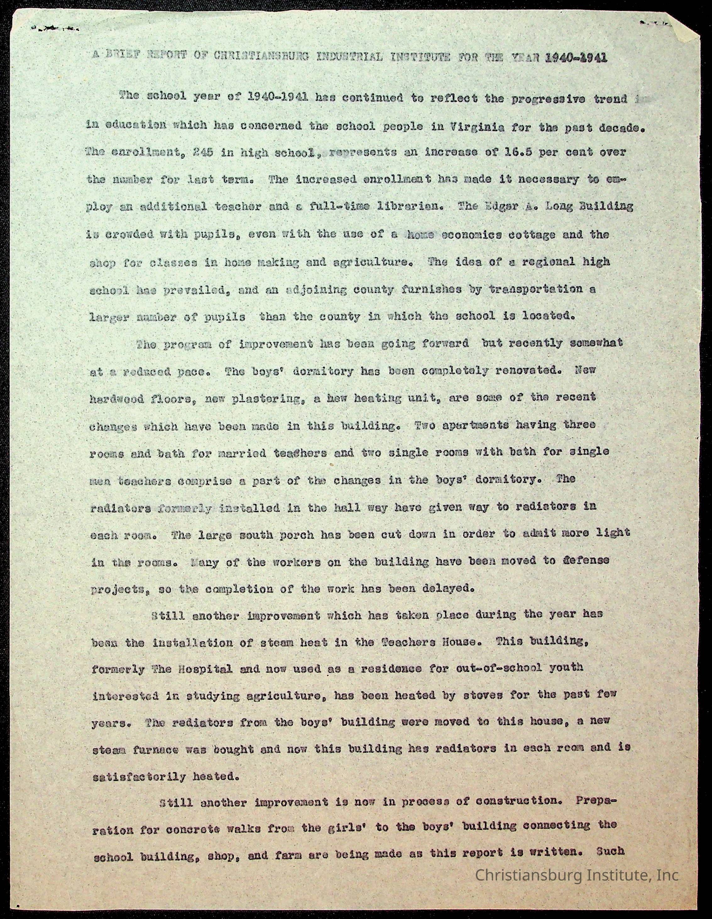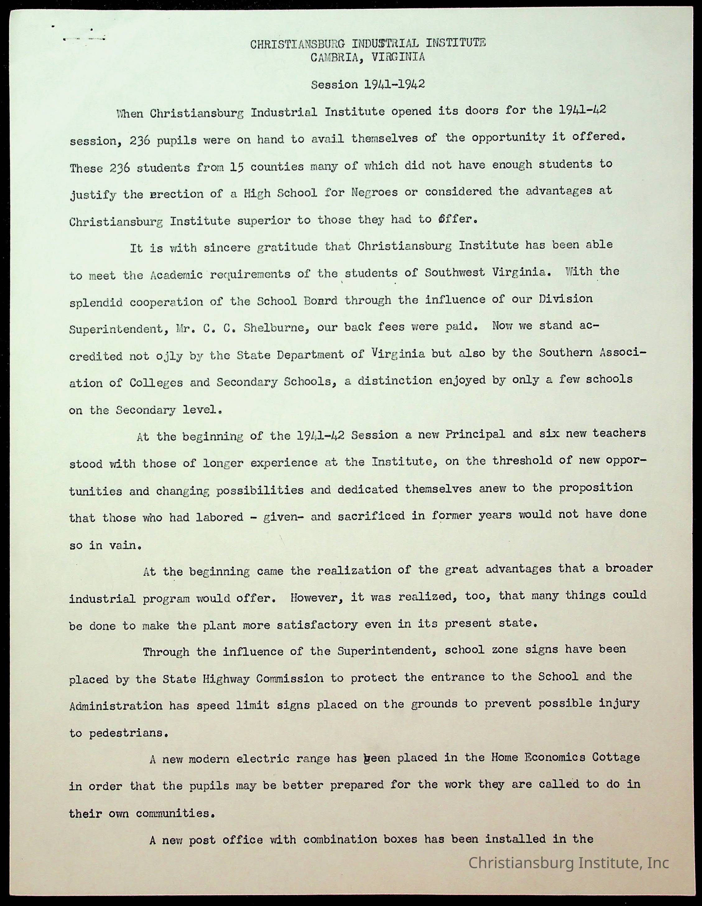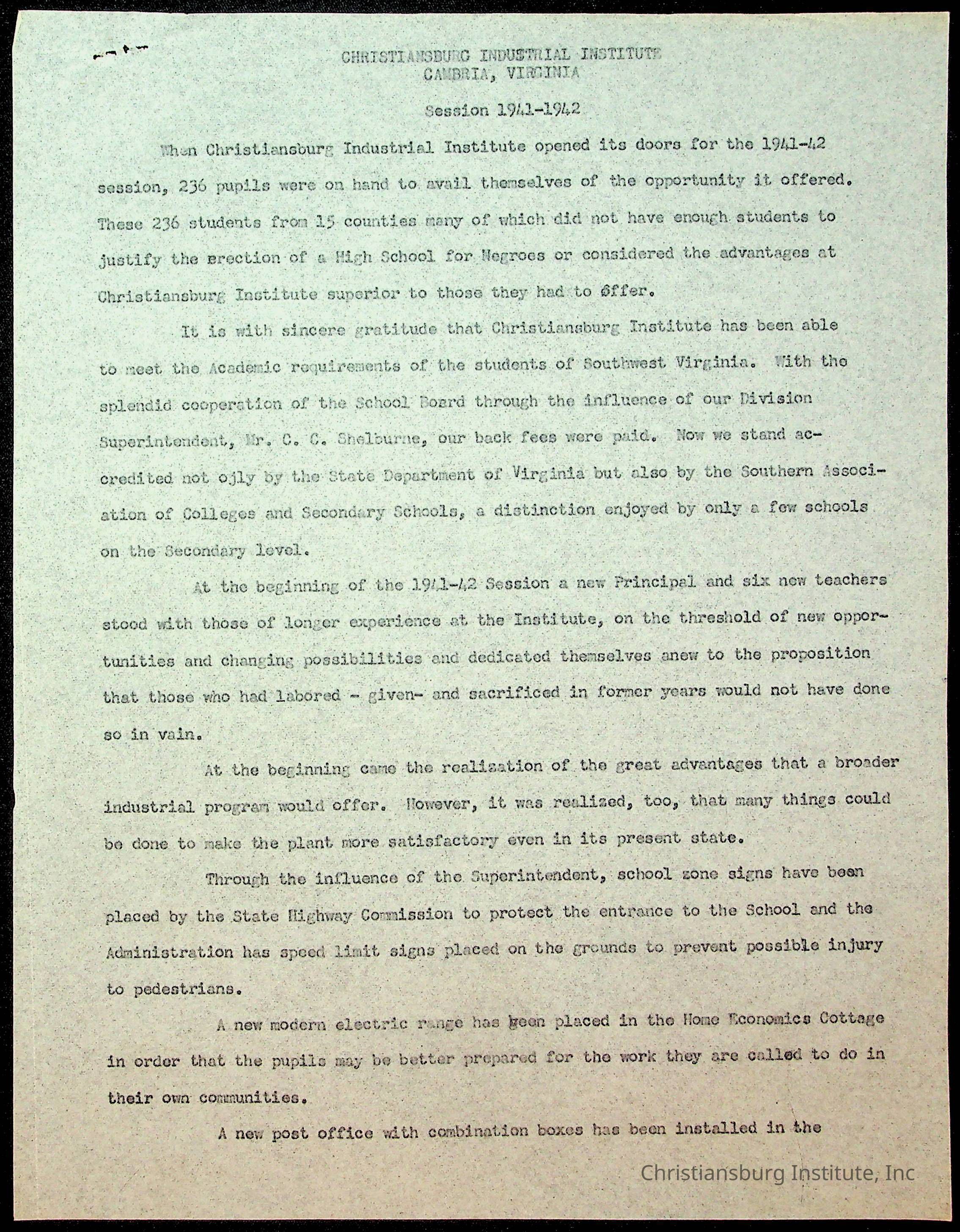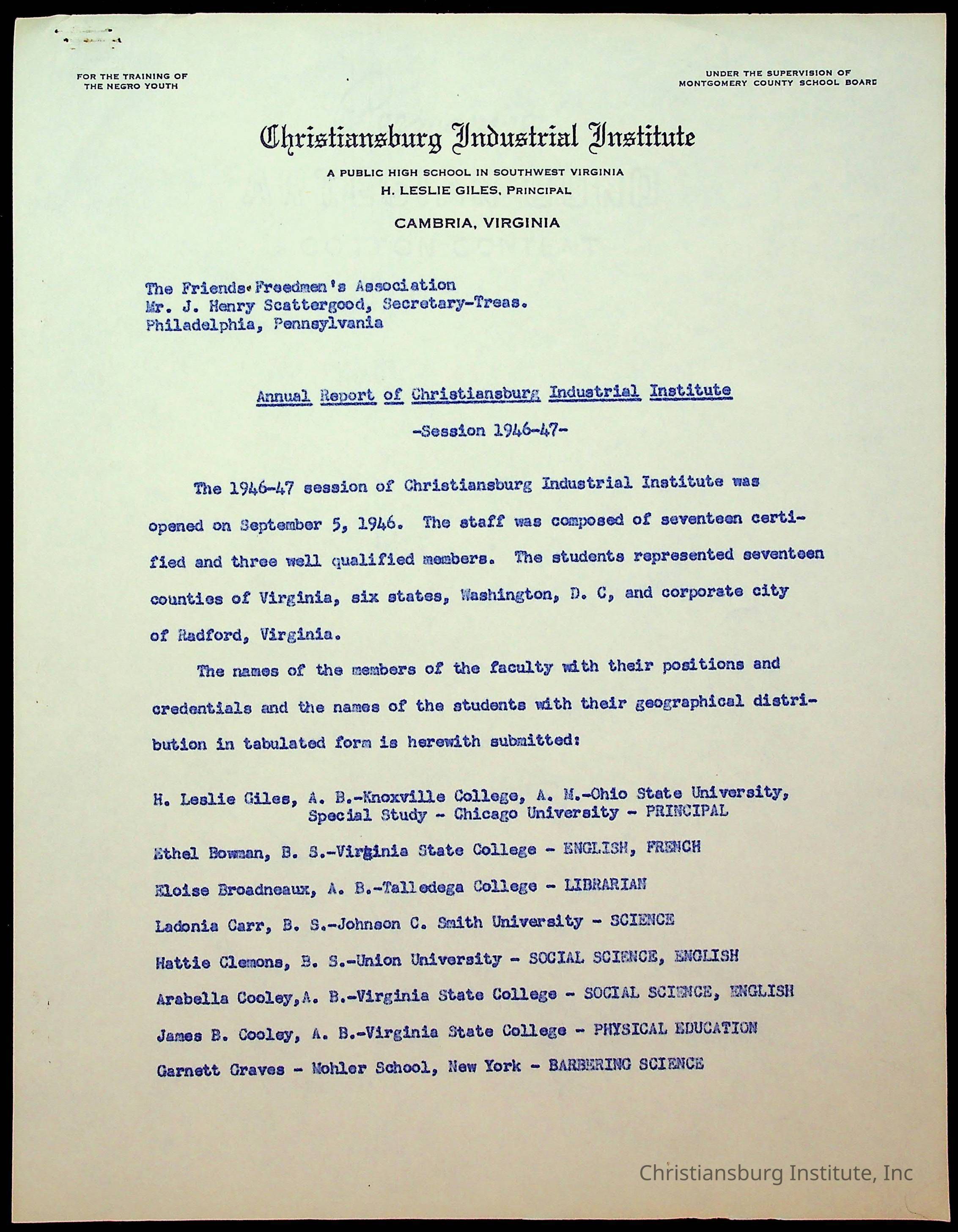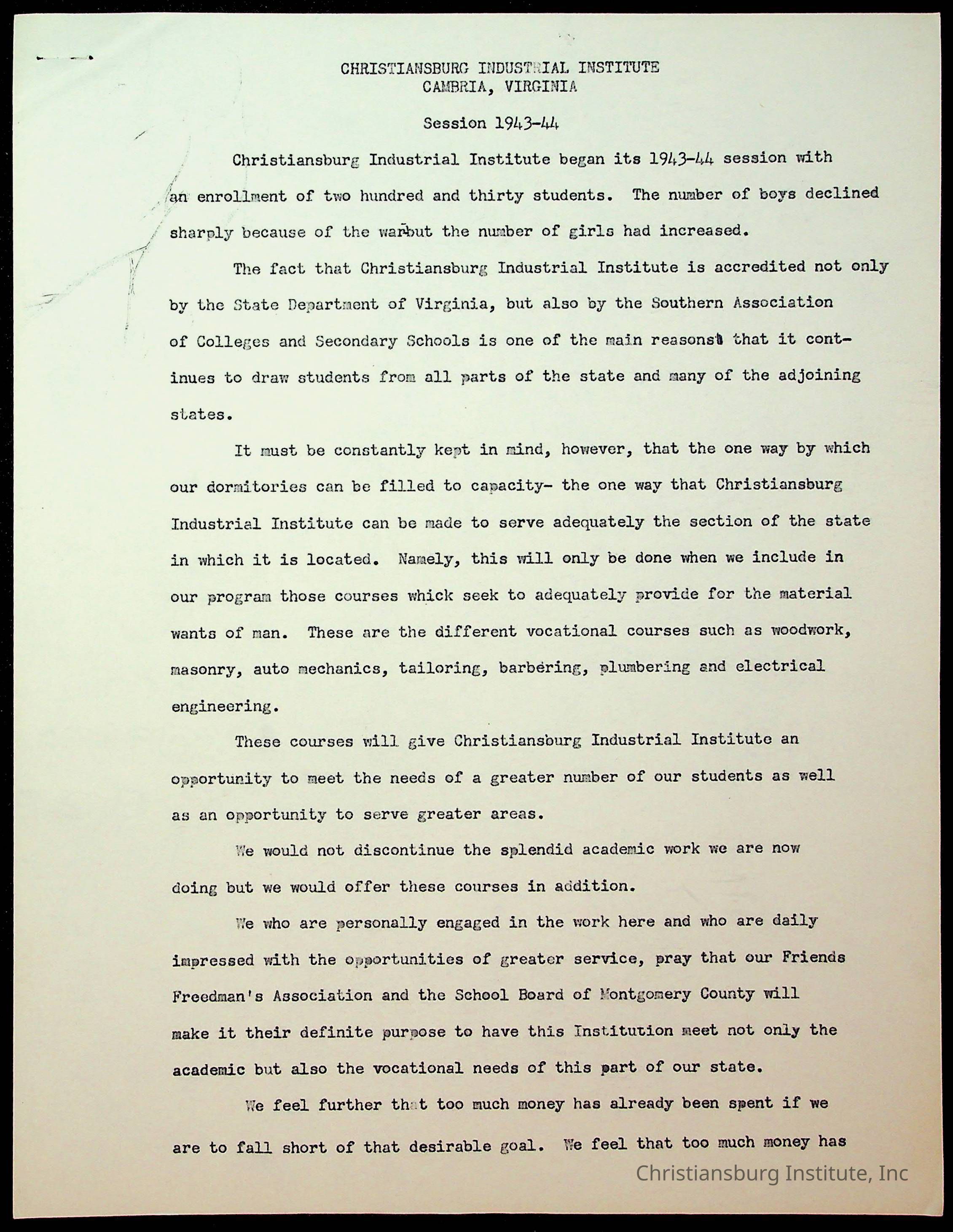 Copyright has been assigned to Christiansburg Institute Museum & Archives by Montgomery County Public Schools. For permission to publish materials created by the donor, contact CIMA@christiansburginstitute.com. Materials not created by Christiansburg Industrial Institute may still be under copyright.