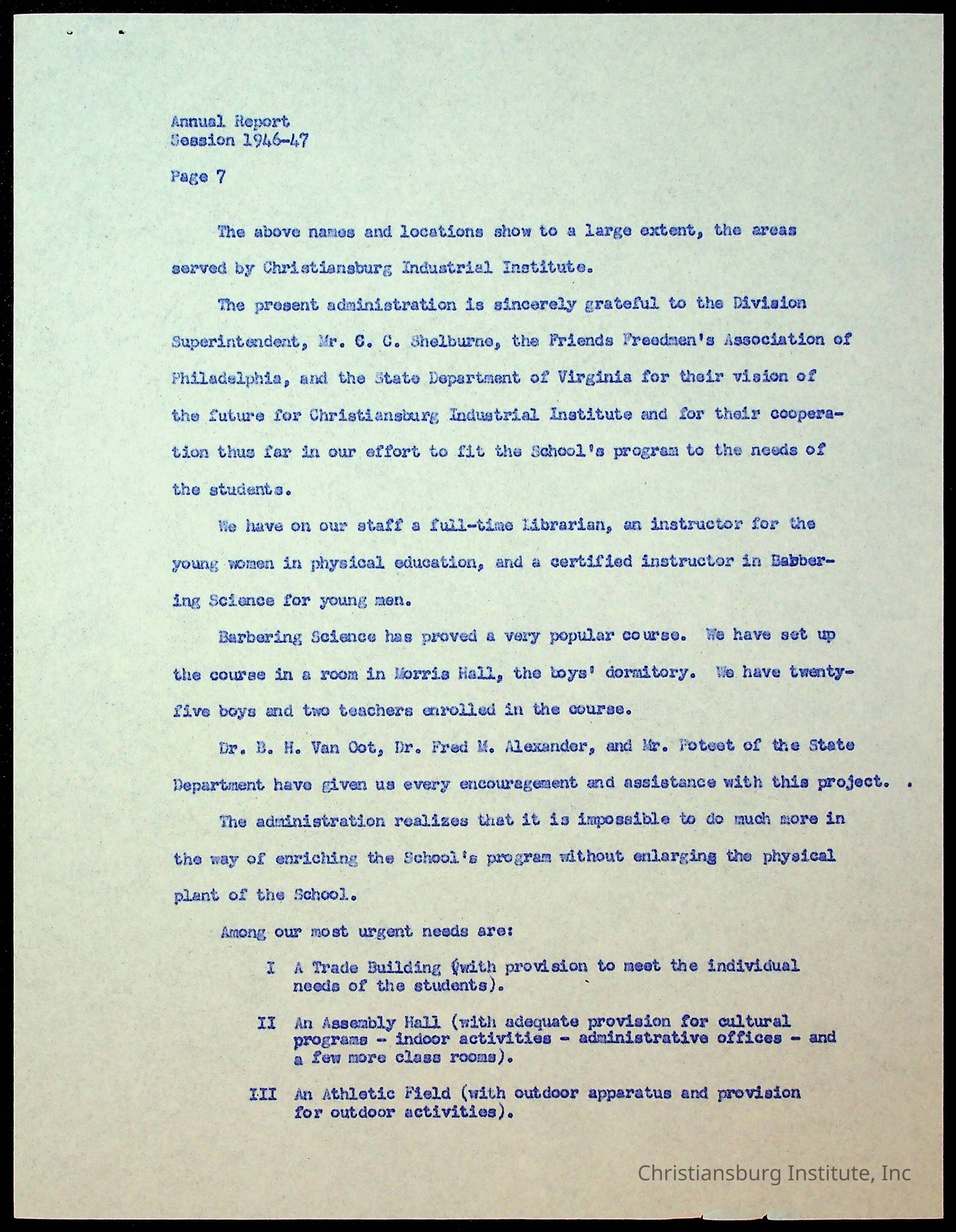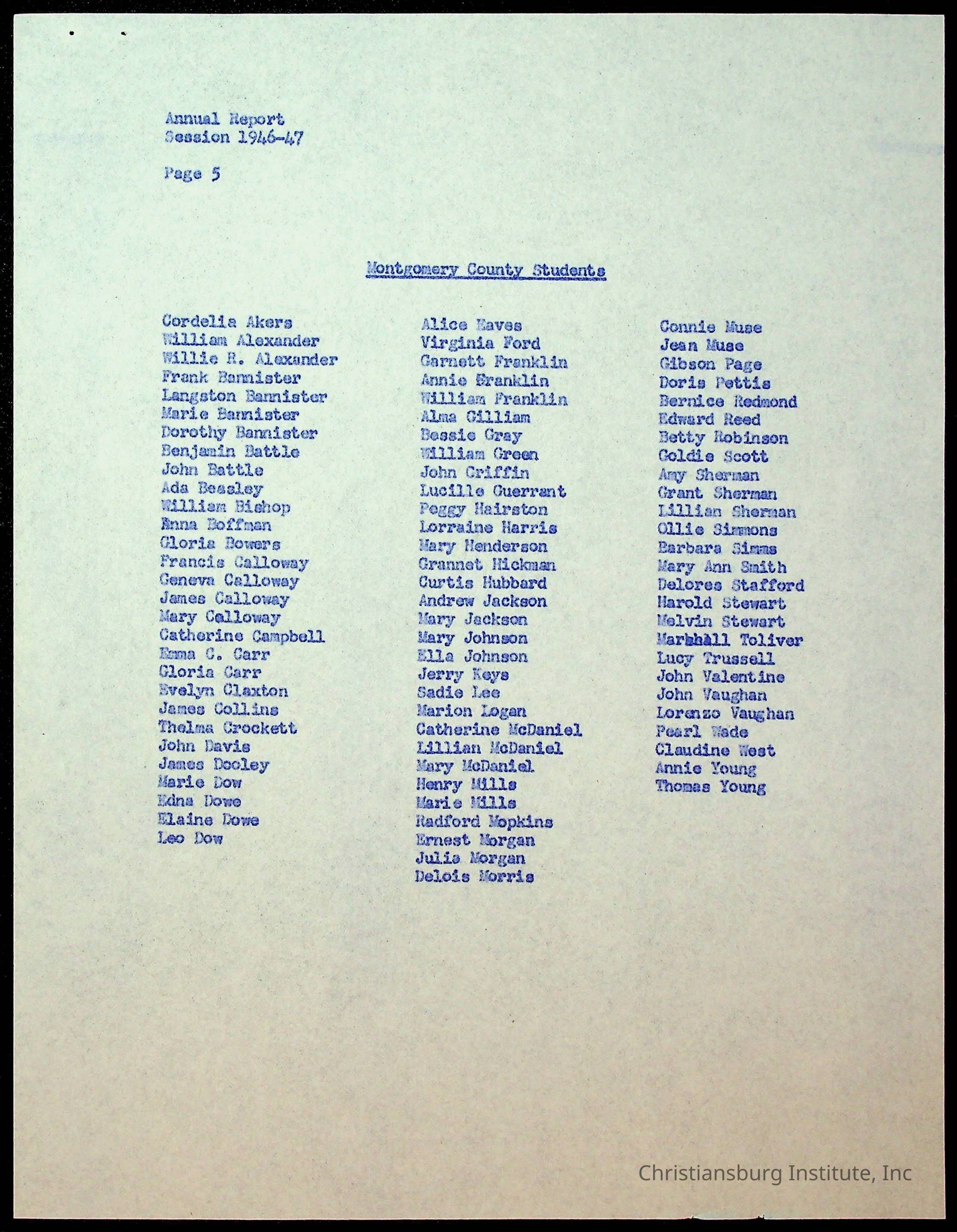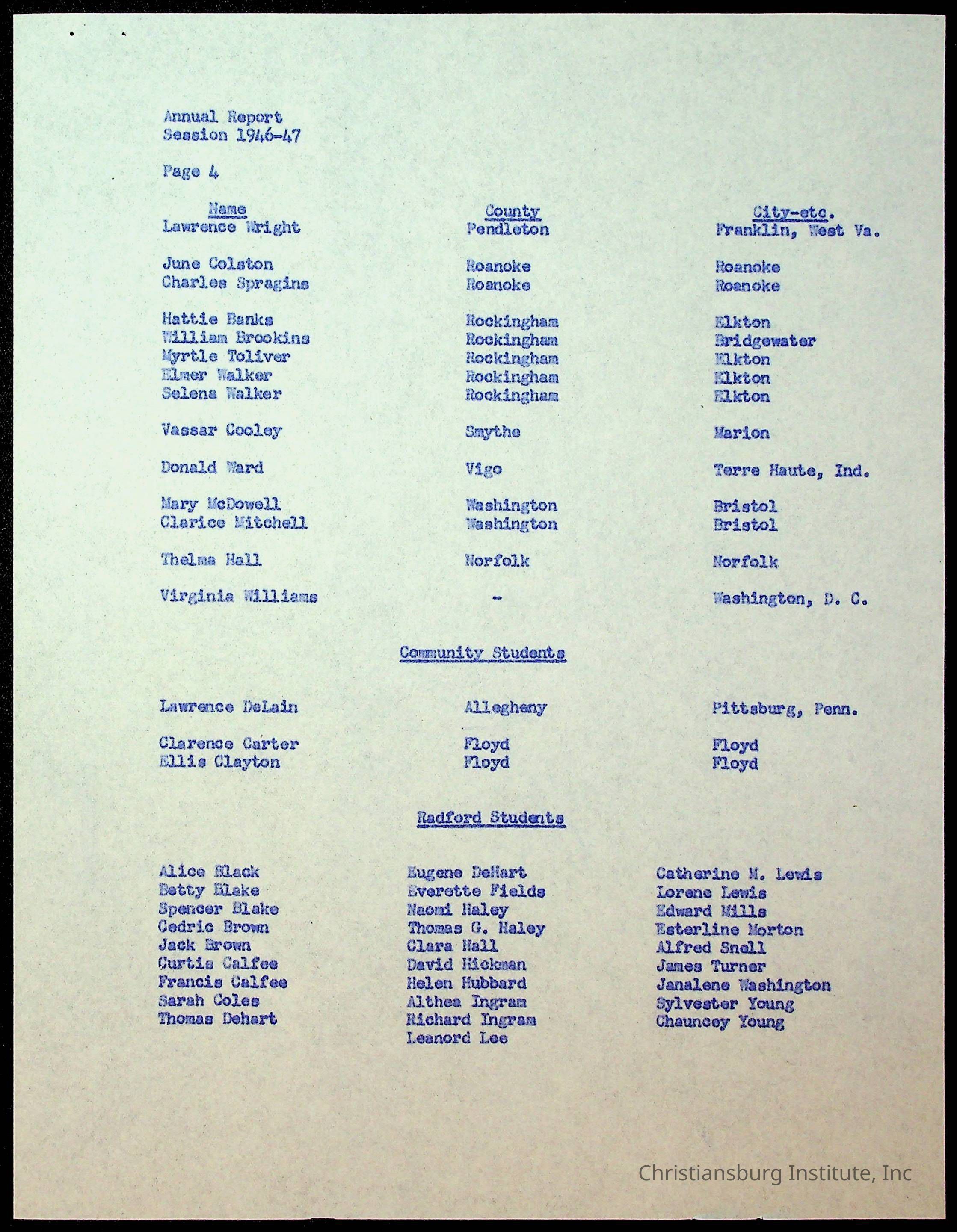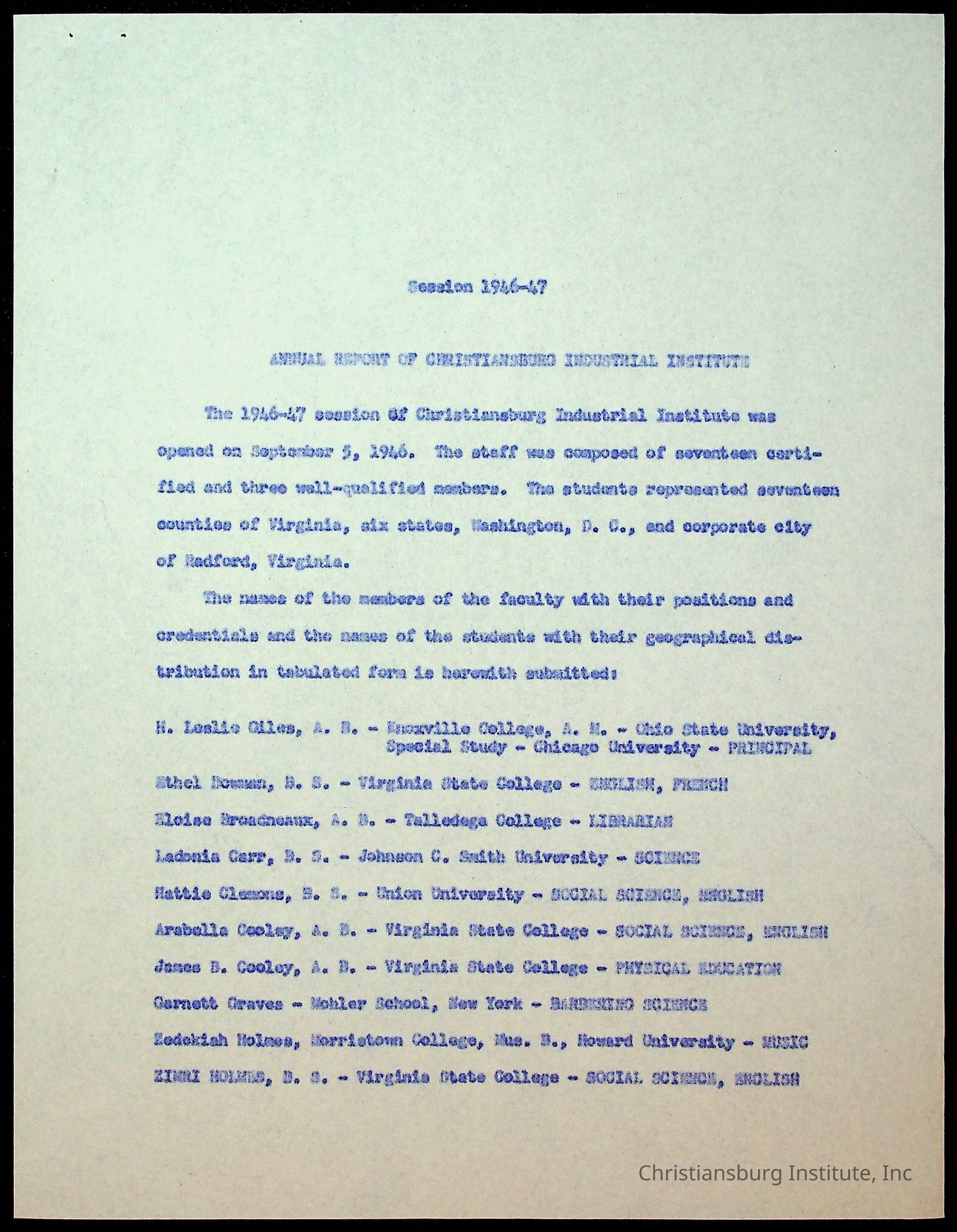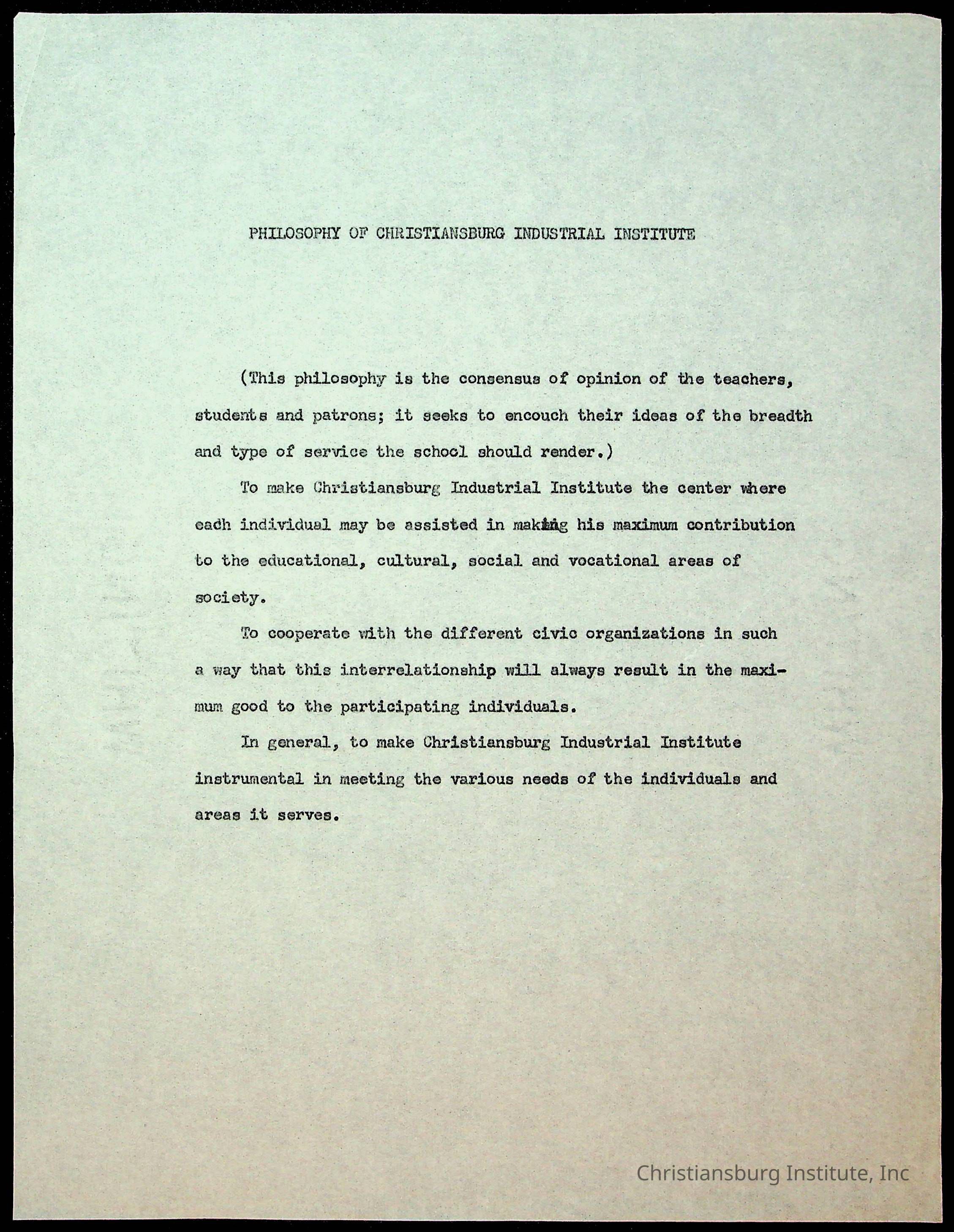 Copyright has been assigned to Christiansburg Institute Museum & Archives by Montgomery County Public Schools. For permission to publish materials created by the donor, contact CIMA@christiansburginstitute.com. Materials not created by Christiansburg Industrial Institute may still be under copyright.