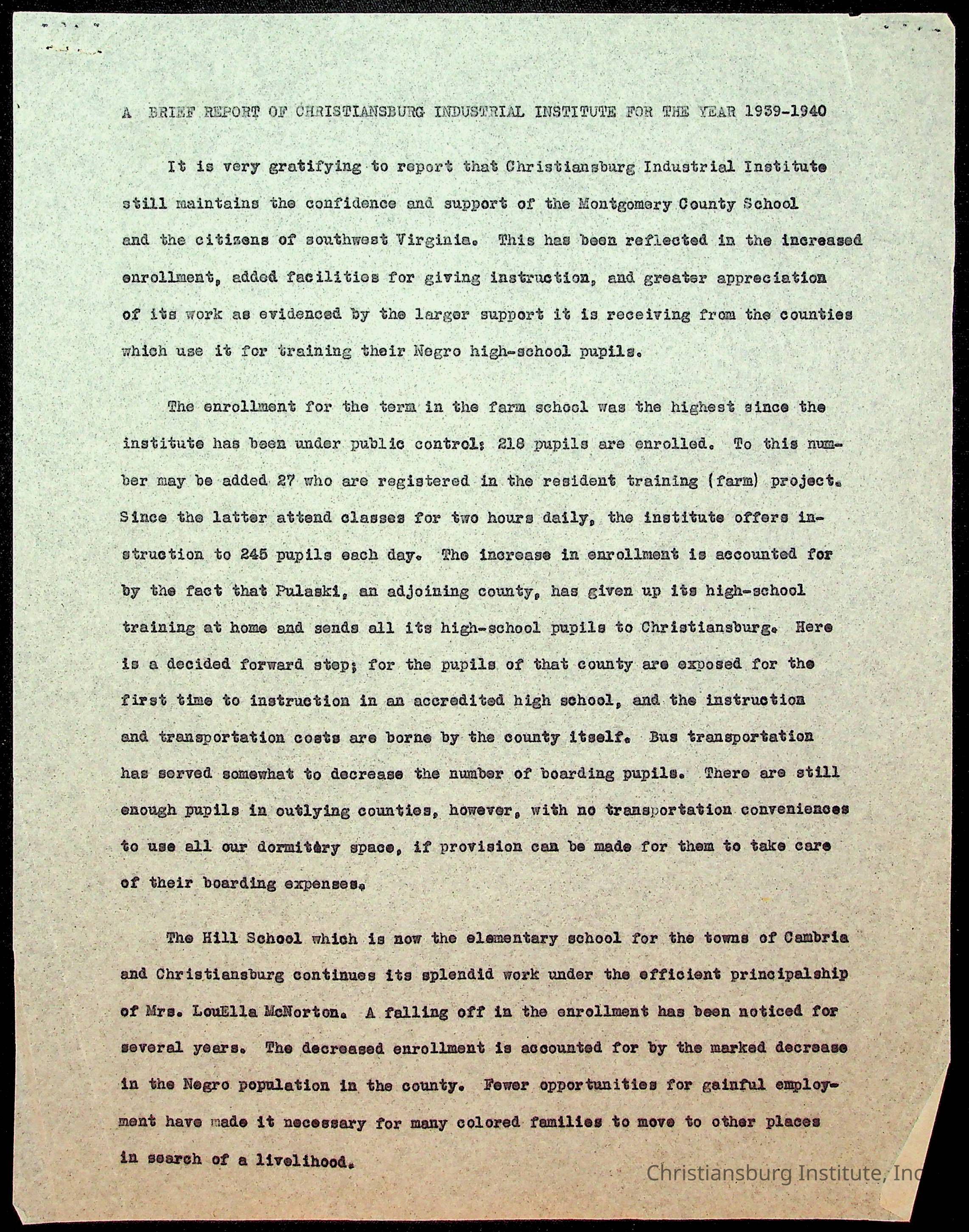 An archive of annual reports from Christiansburg Industrial Institute from the year 1939 through 1949.