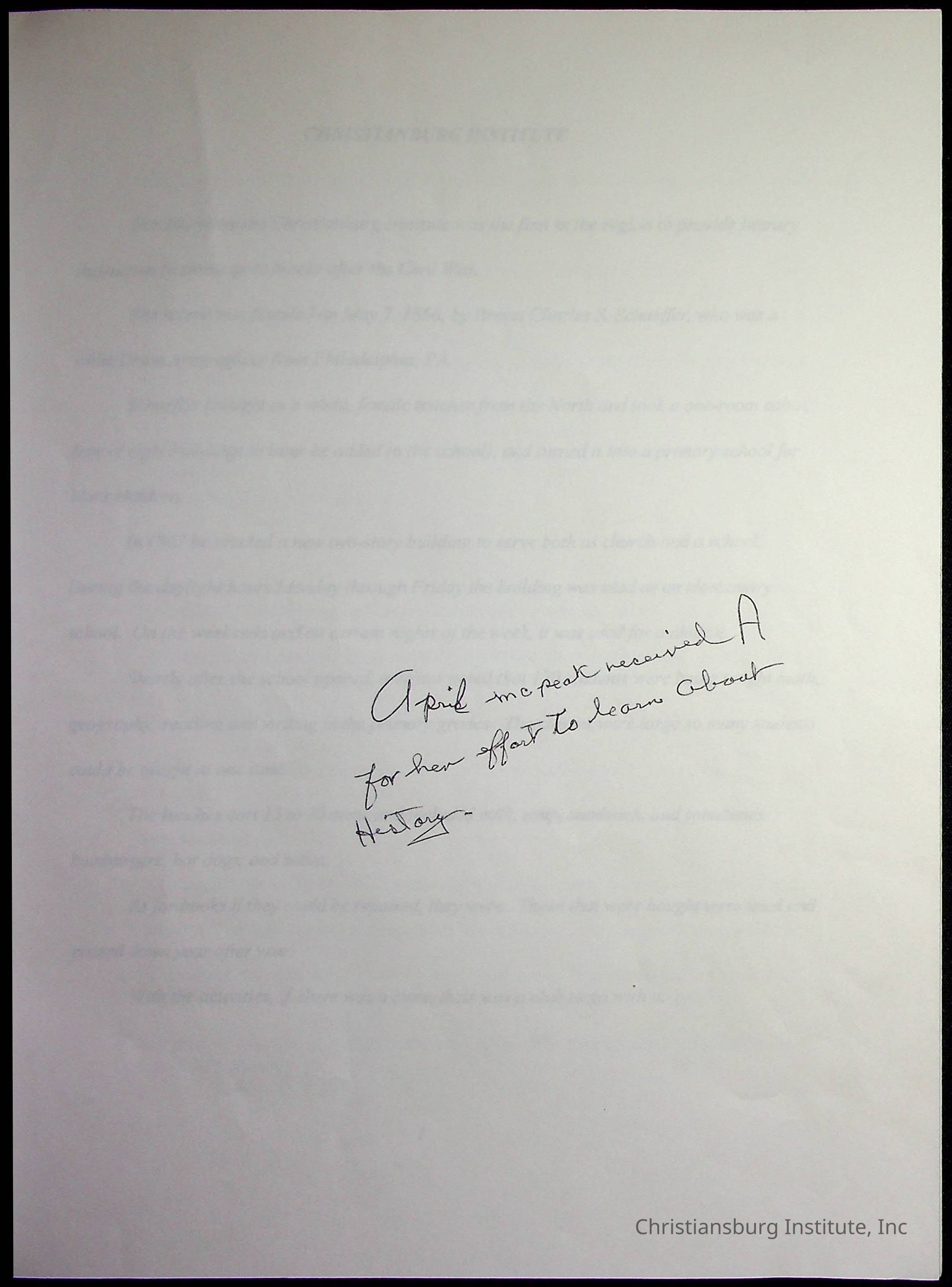 A research paper about the history of Christiansburg Institute written by April McPack of Pulaski High School in 1996.Collection
