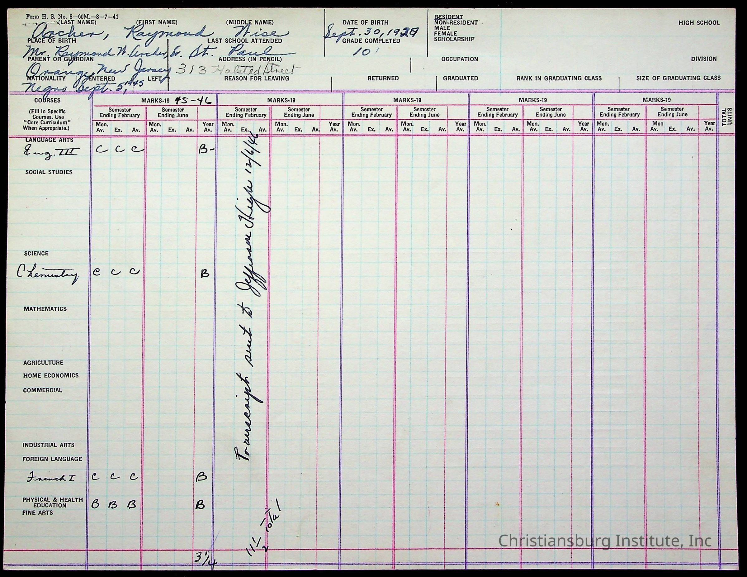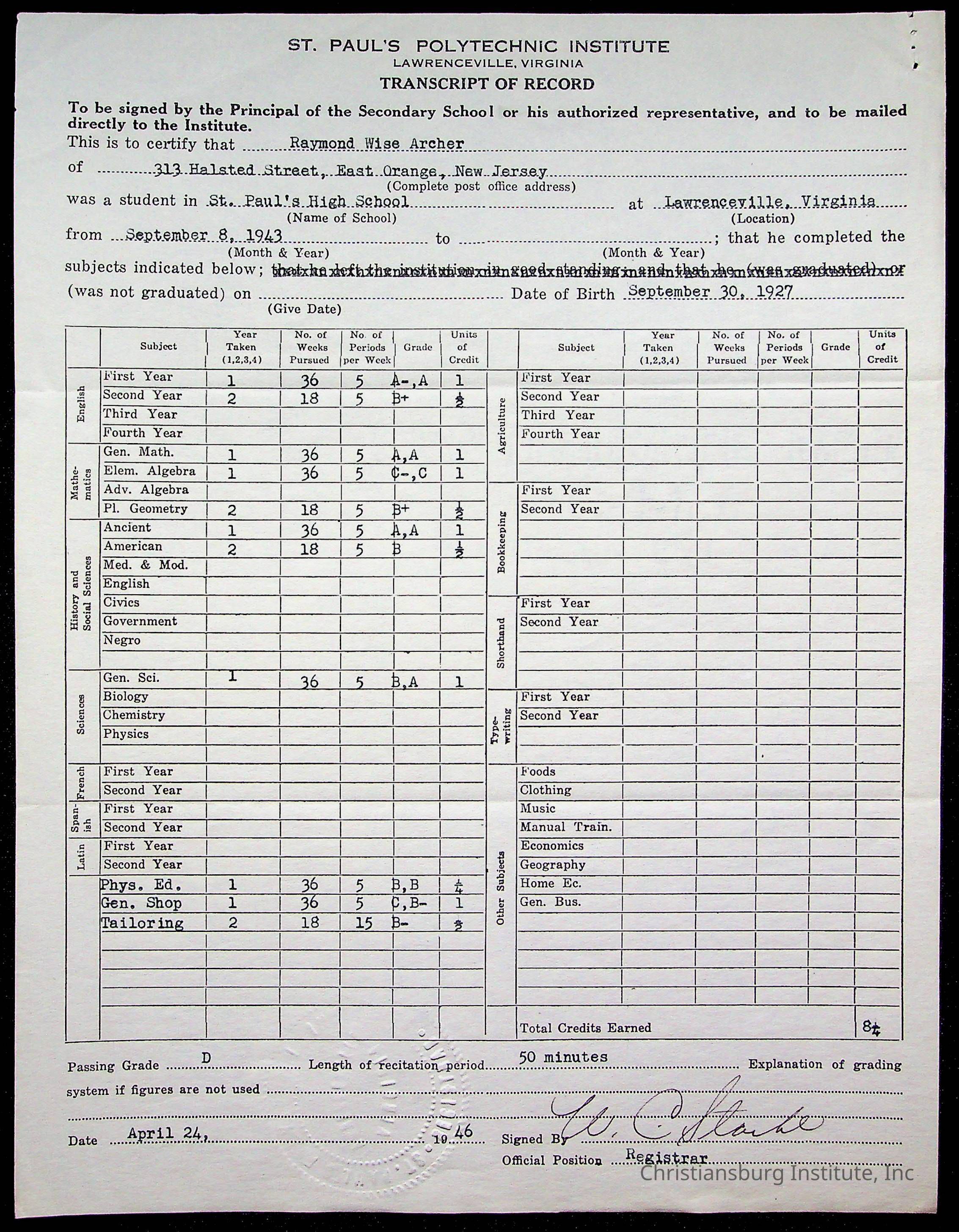 The student file for the Christiansburg Institute student, Raymond Archer circa 1940s.