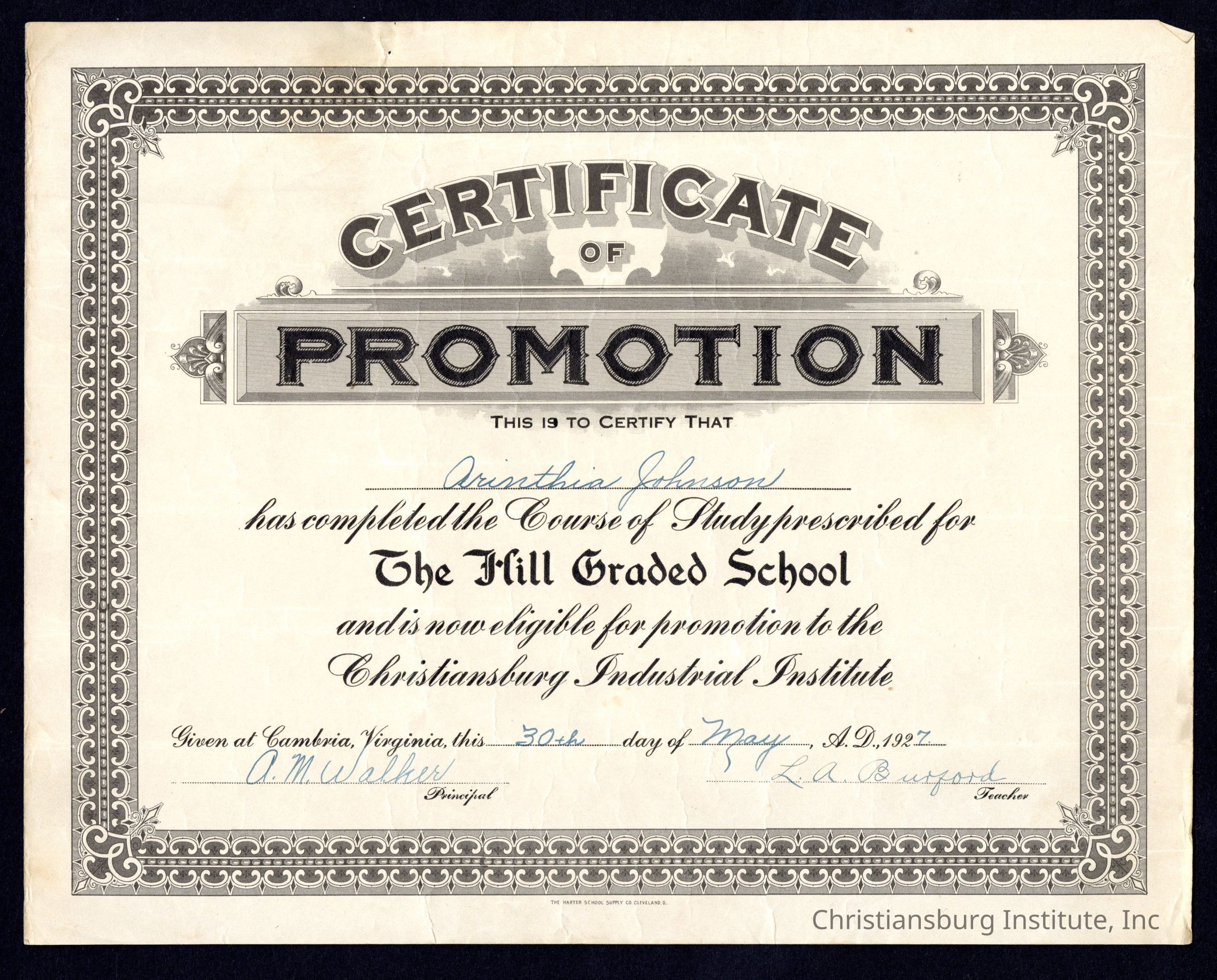 A grade school diploma issued to Arinthia Johnson on May 30th, 1927 for completing their course of study at the Hill Graded School and is eligible for promotion to Christiansburg Normal and Industrial Institute.Collection