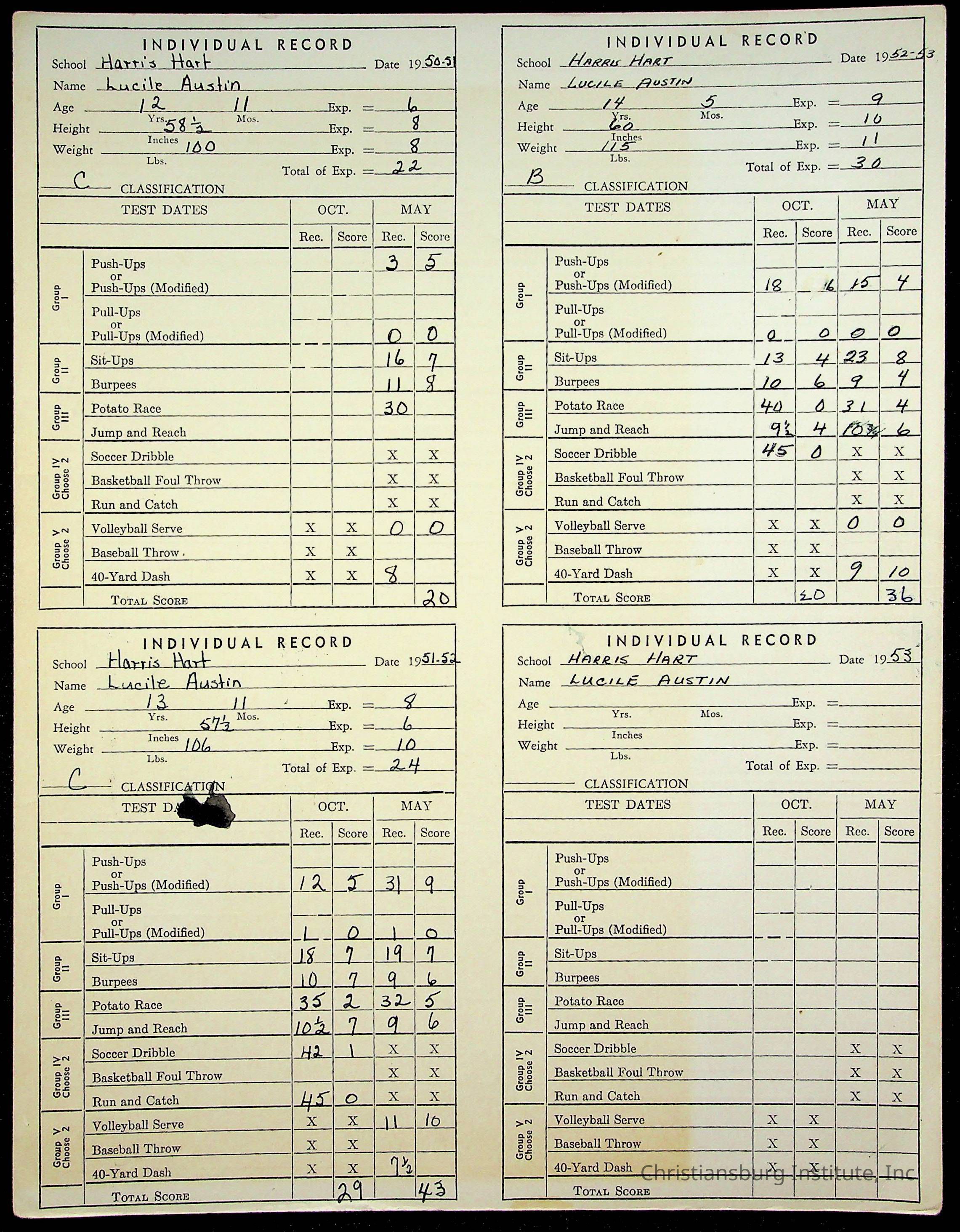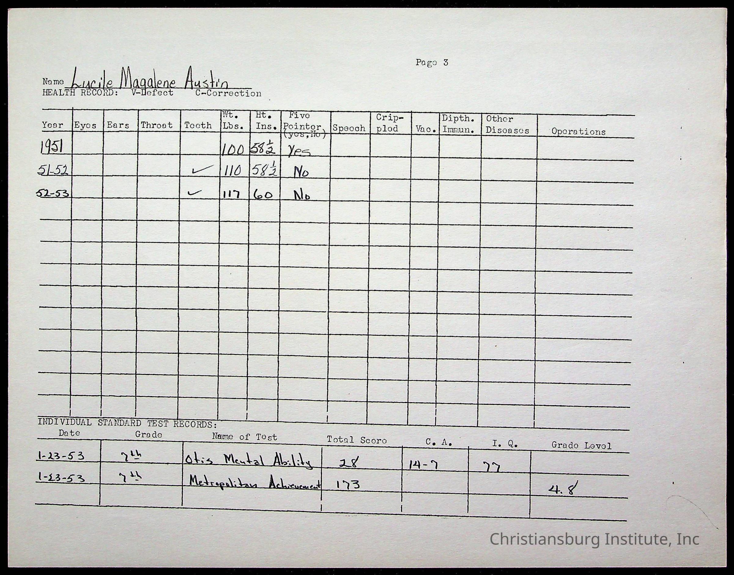 The student file for the Christiansburg Institute student, Lucile Austin circa 1940s.