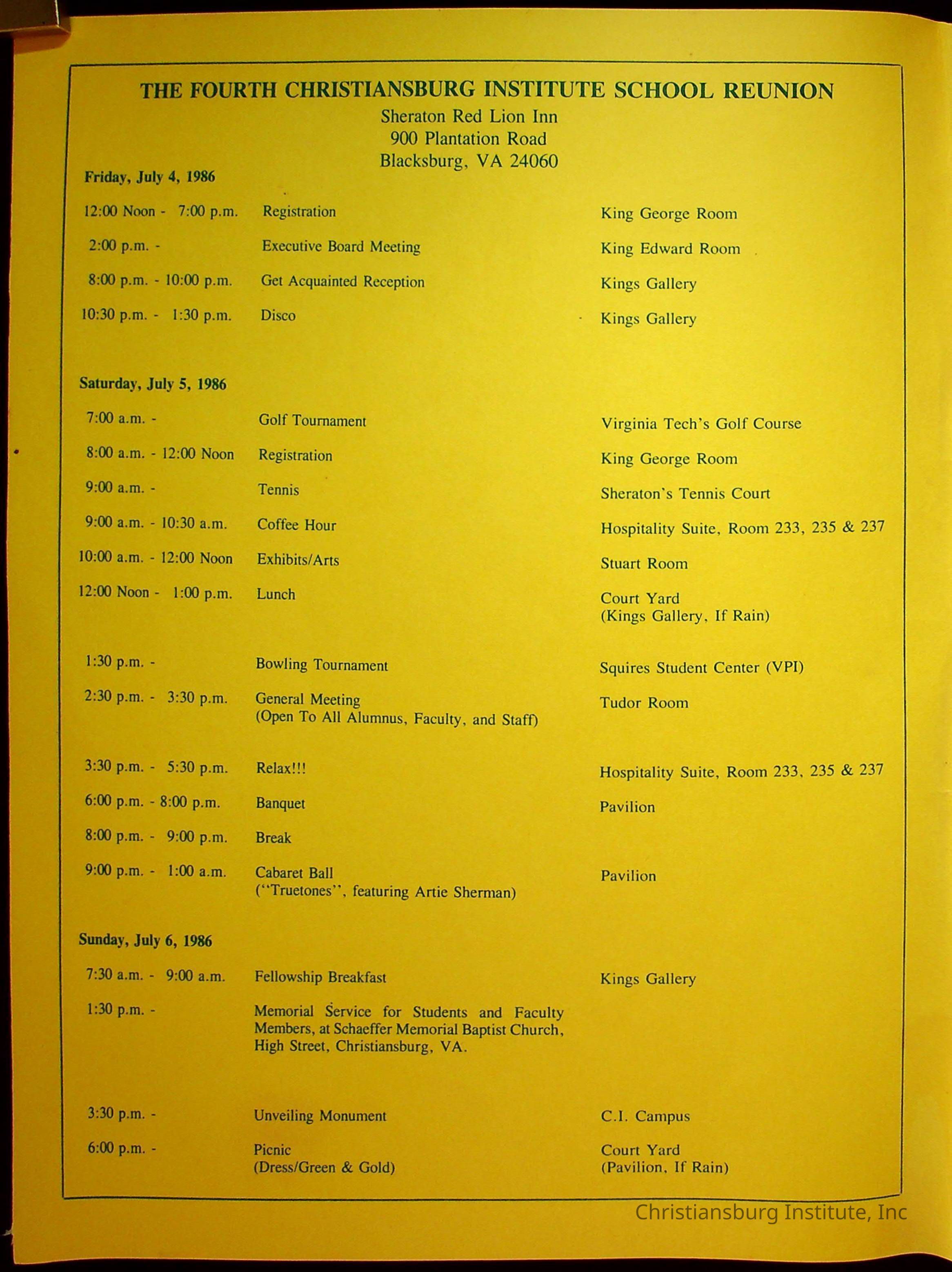 The official program booklet for the fourth Christiansburg Institute reunion on July 4th-6th 1986 that took place at the Sheraton Red Lion Inn in Blacksburg, Virginia.Collection