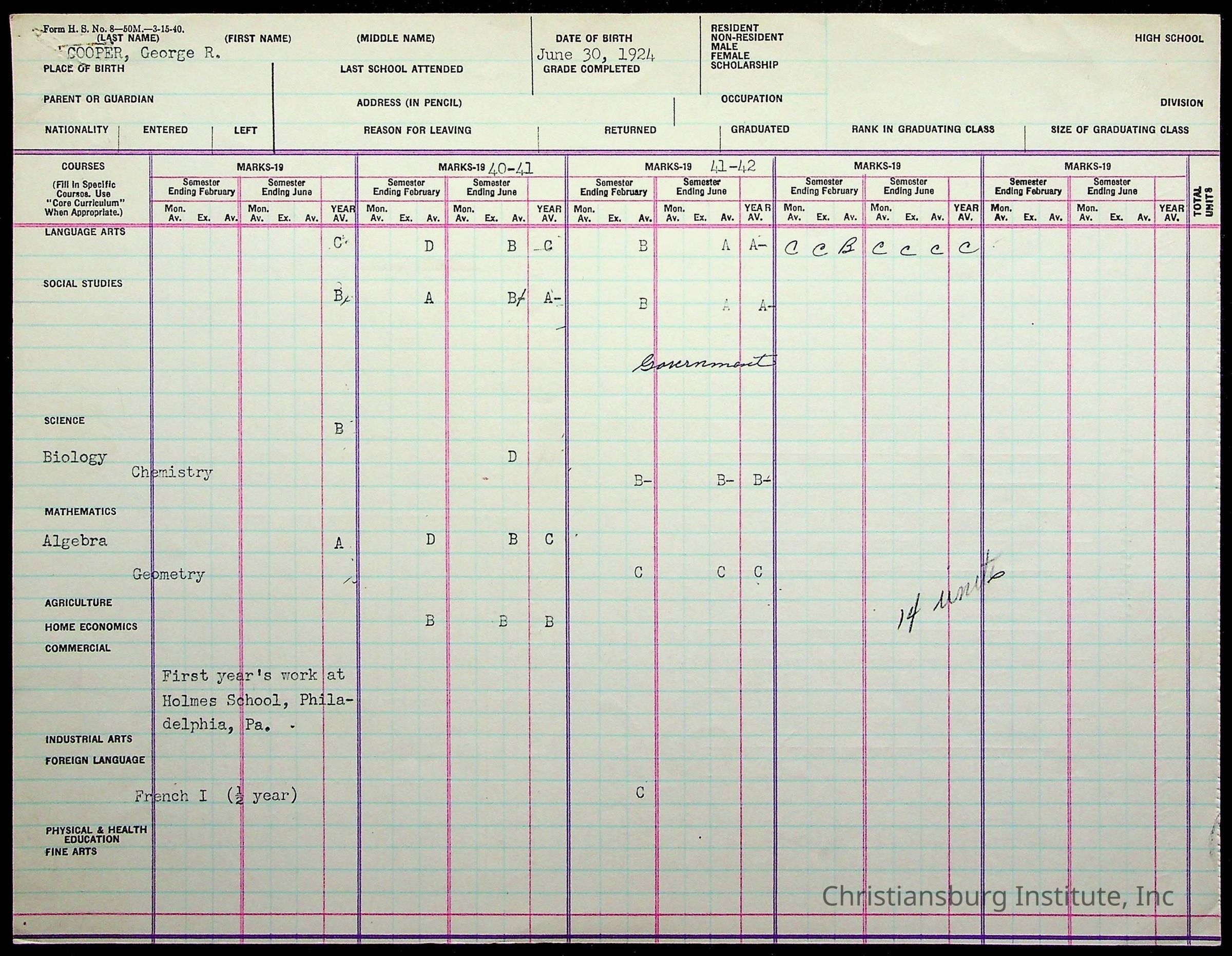 The student file for the Christiansburg Institute student, George R. Cooper circa 1940s.