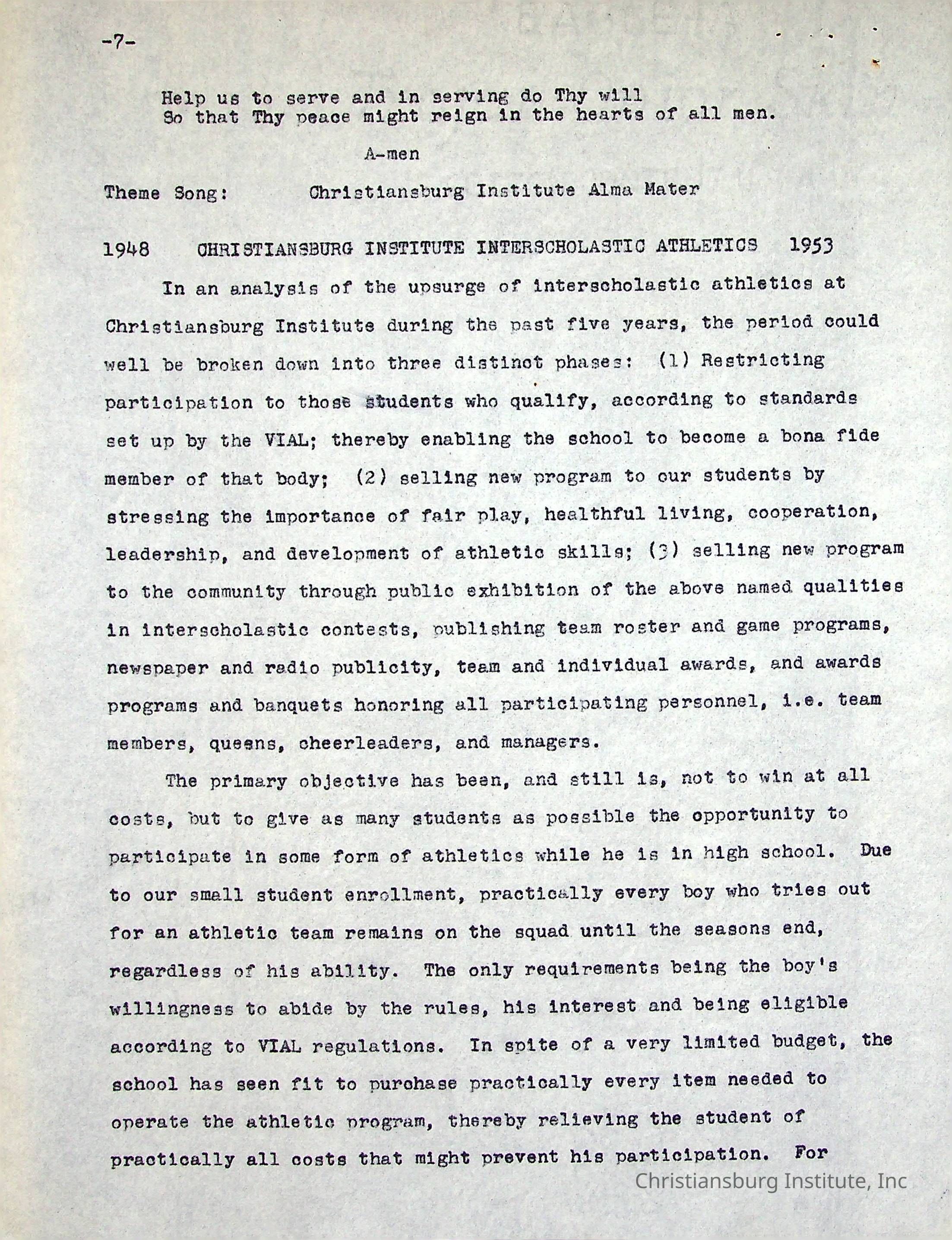 A Five Year Summary of Activities is a typed document written by Christiansburg Institute principal, John F. Banks in 1954.Collection