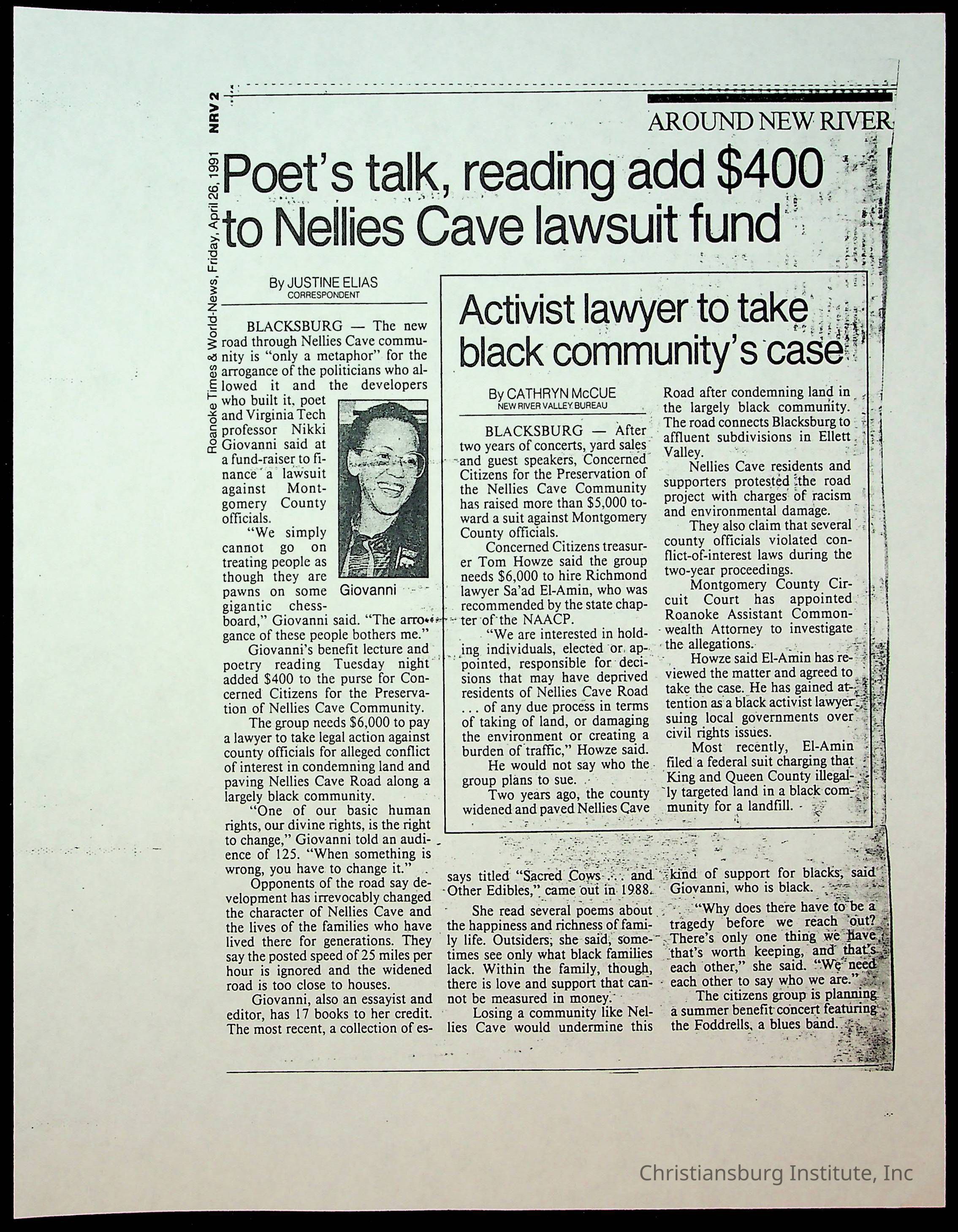 An archive of materials related to the Nikki Giovanni Benefit that raised $400 for the Nellies Cave lawsuit, compiled by Elizabeth Fine.