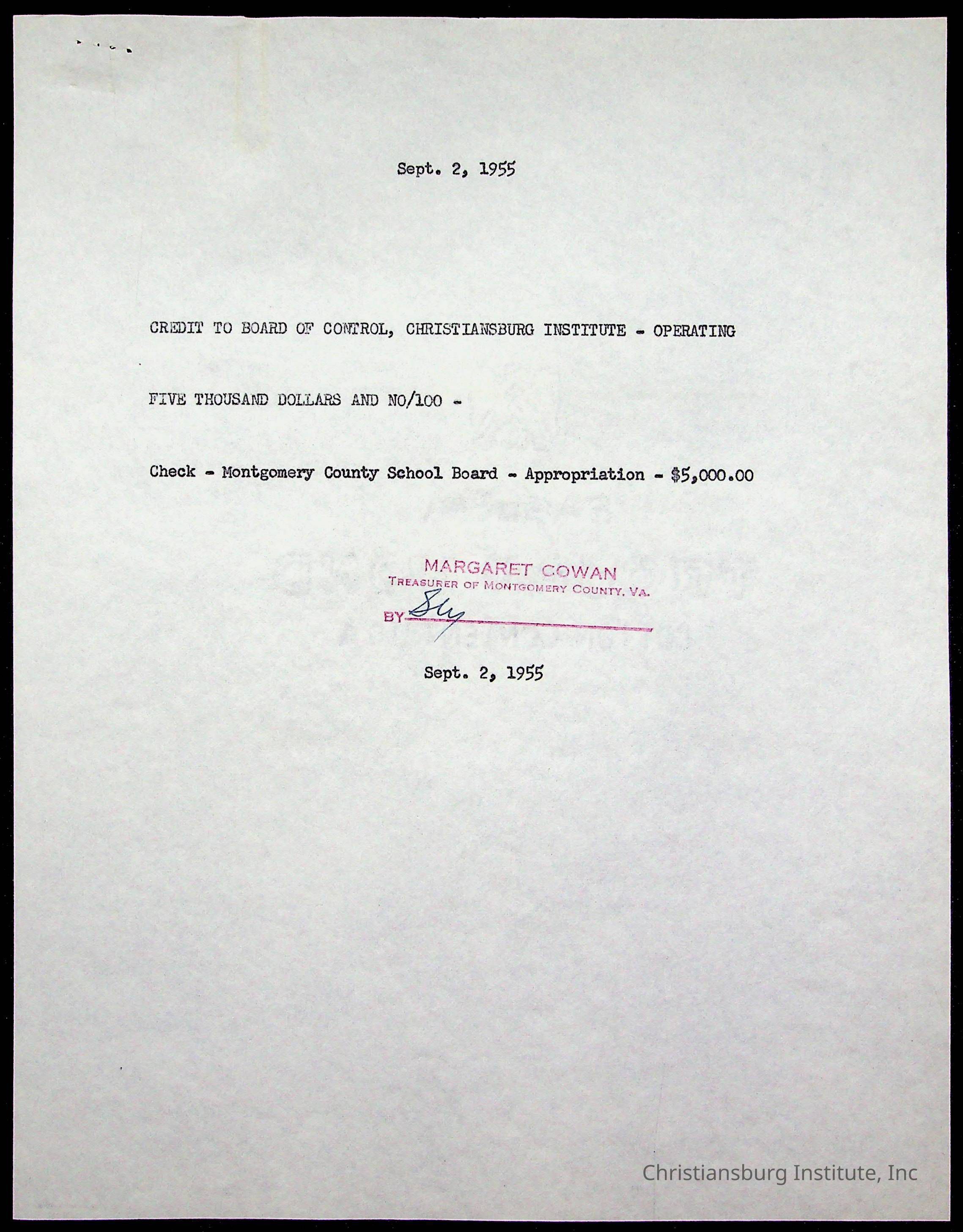 Christiansburg Institute, The Board of Control, Commonwealth of Virginia, Montgomery County School Board