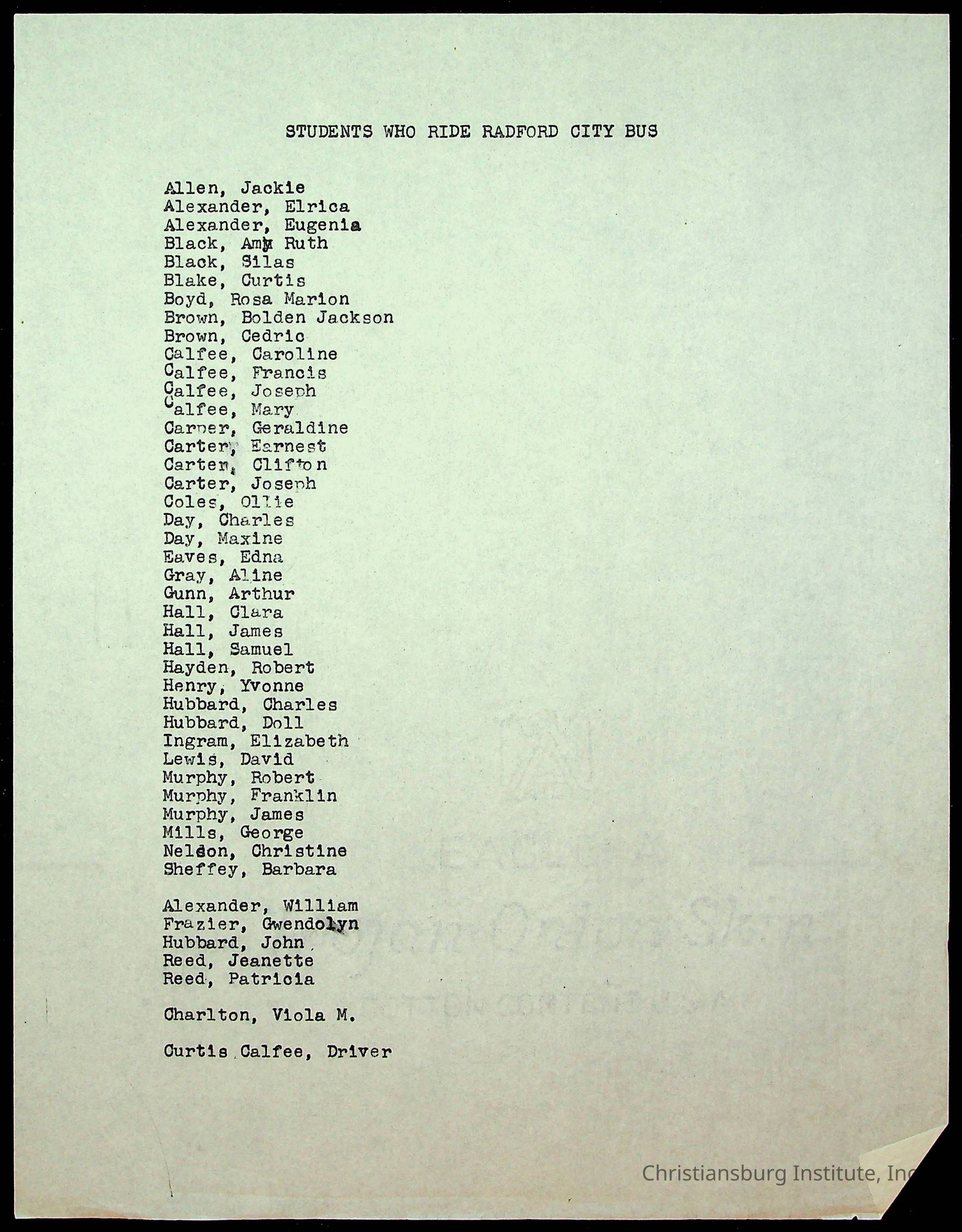 Copyright has been assigned to Christiansburg Institute Museum & Archives by Montgomery County Public Schools. For permission to publish materials created by the donor, contact CIMA@christiansburginstitute.com. Materials not created by Christiansburg Industrial Institute may still be under copyright.