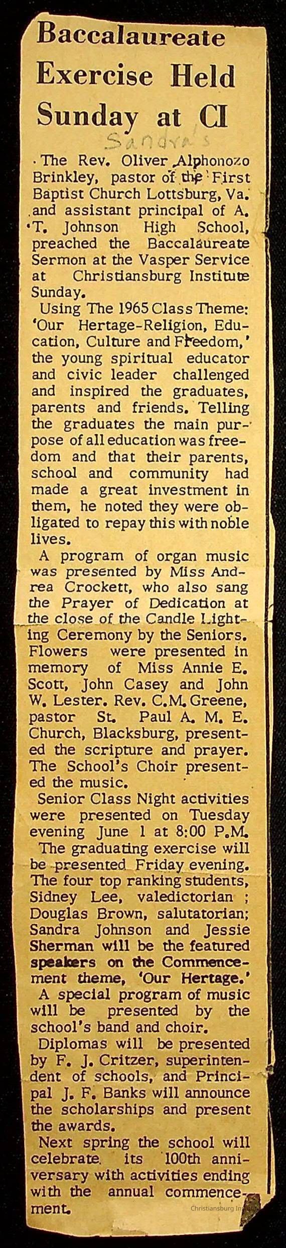 A newspaper clipping that features a story about a Baccalaureate exercise that was held at Christiansburg Institute, c. 1966.Creator