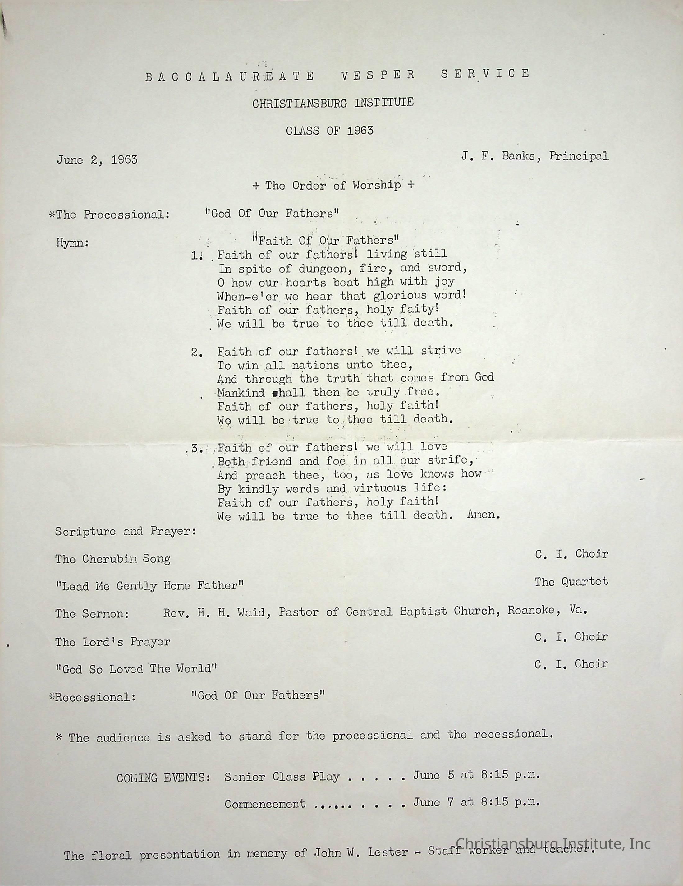 A Baccalaureate Vesper Service program that took place at Christiansburg Institute on June 2nd, 1963.Creator
