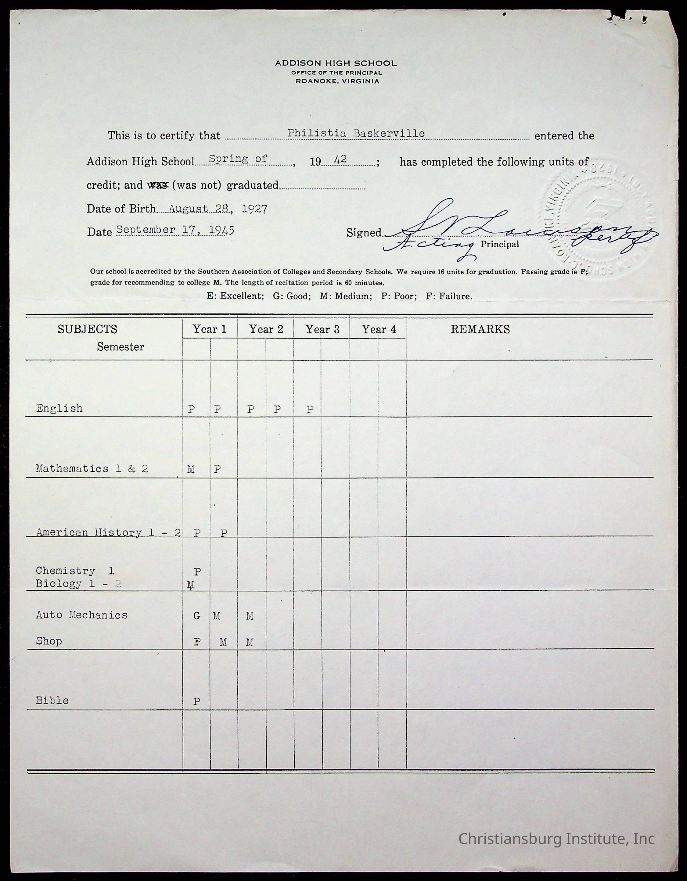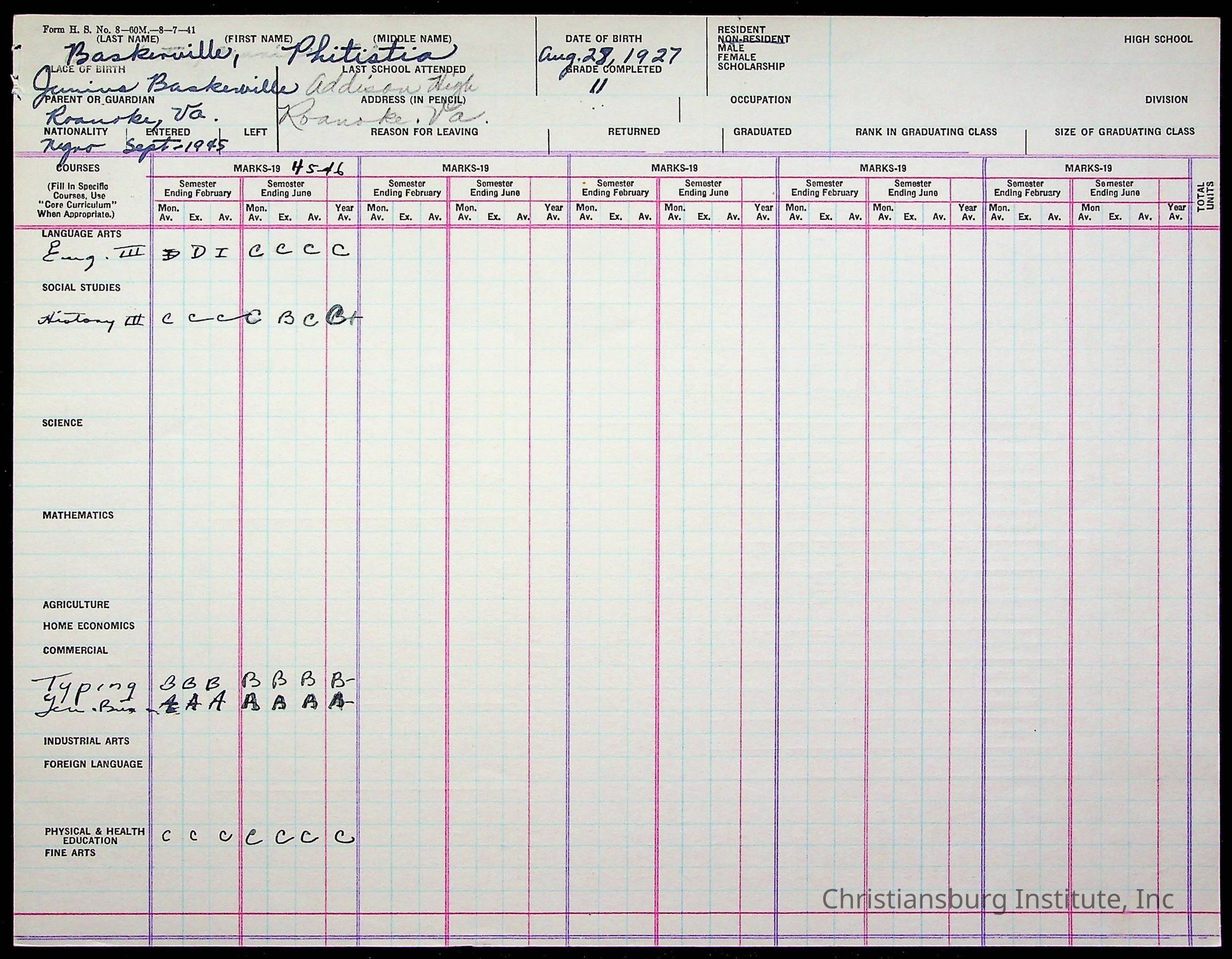 The student file for the Christiansburg Institute student, Philistia Bakersville circa 1940s.