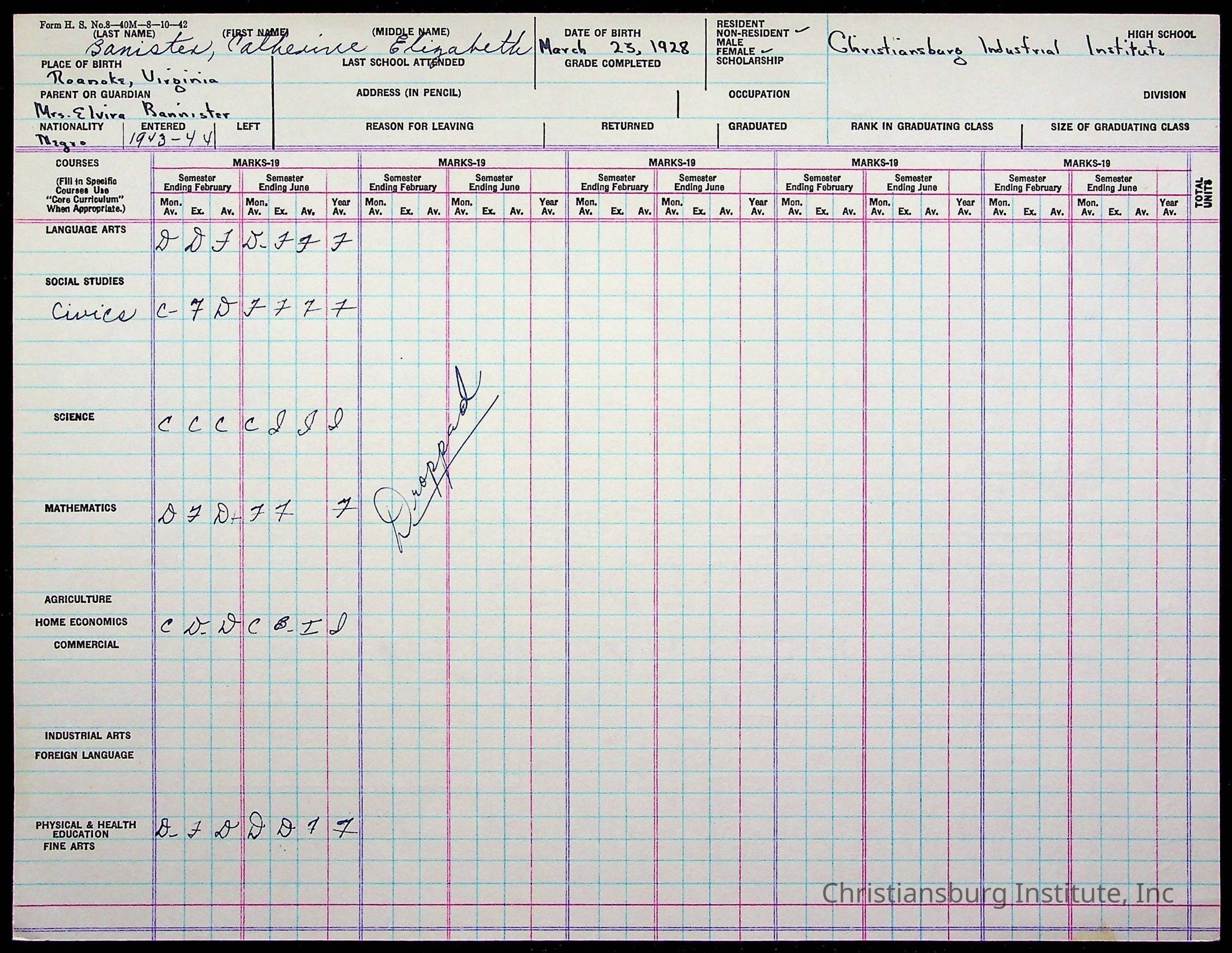 The student file for the Christiansburg Institute student, Catherine Bannister circa 1940s.
