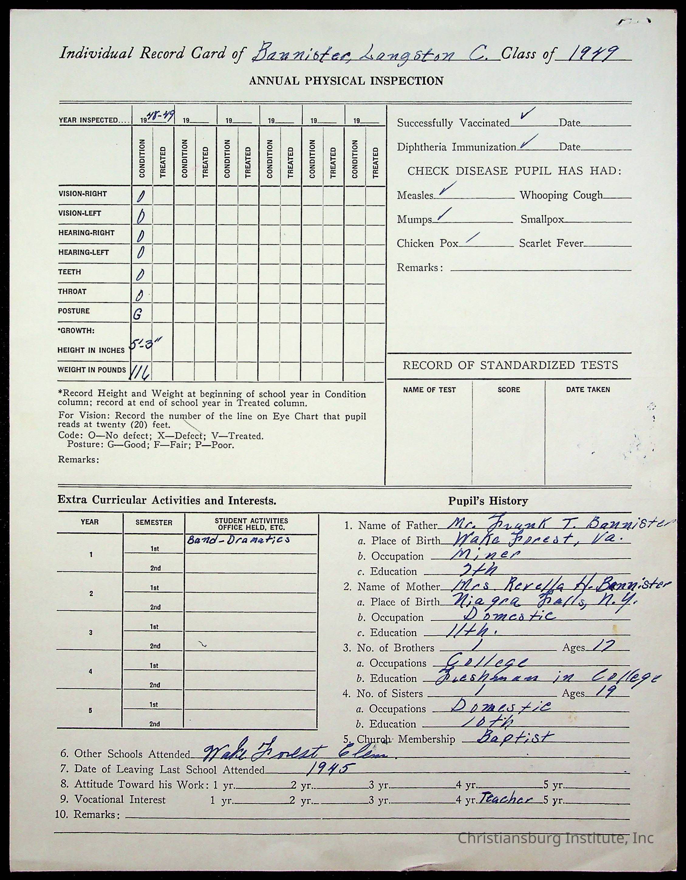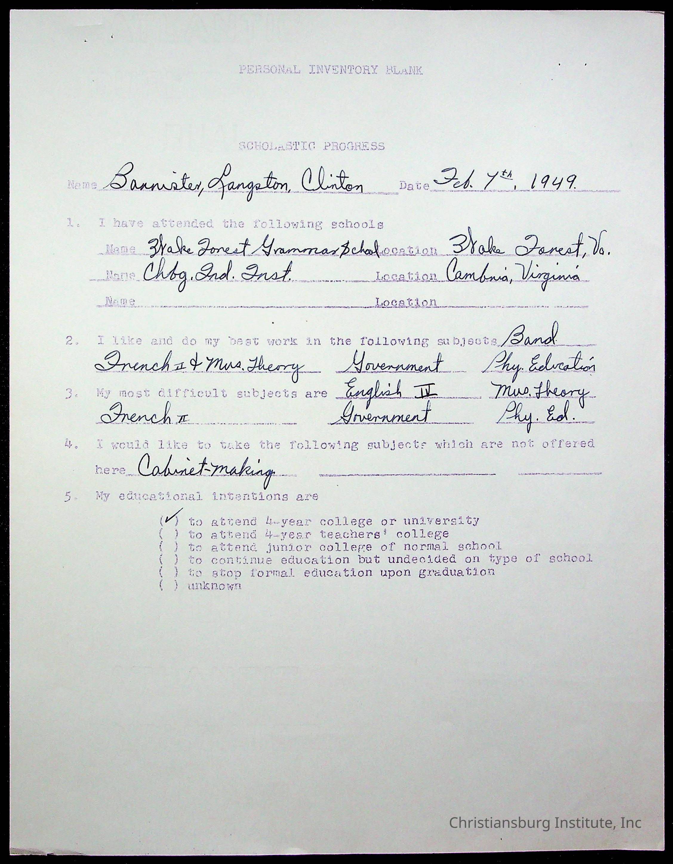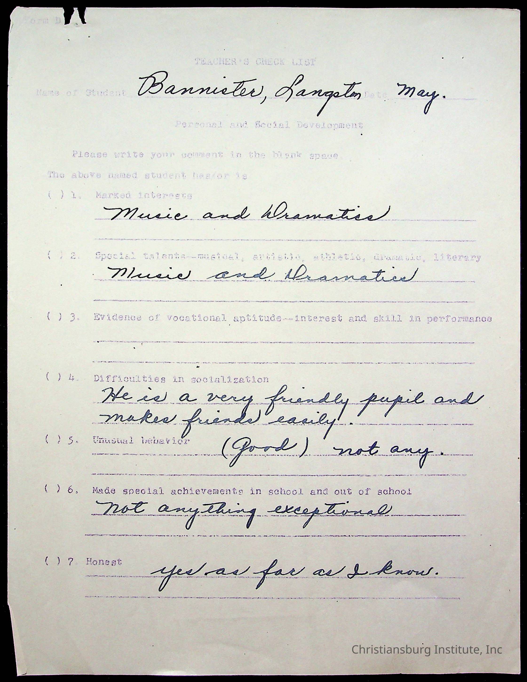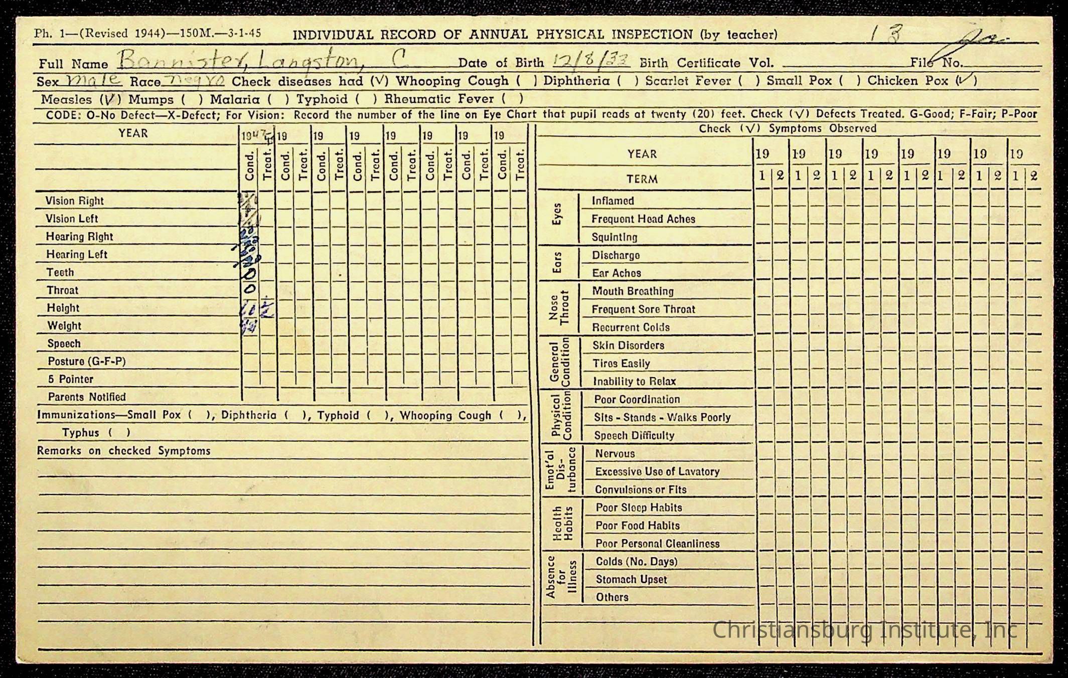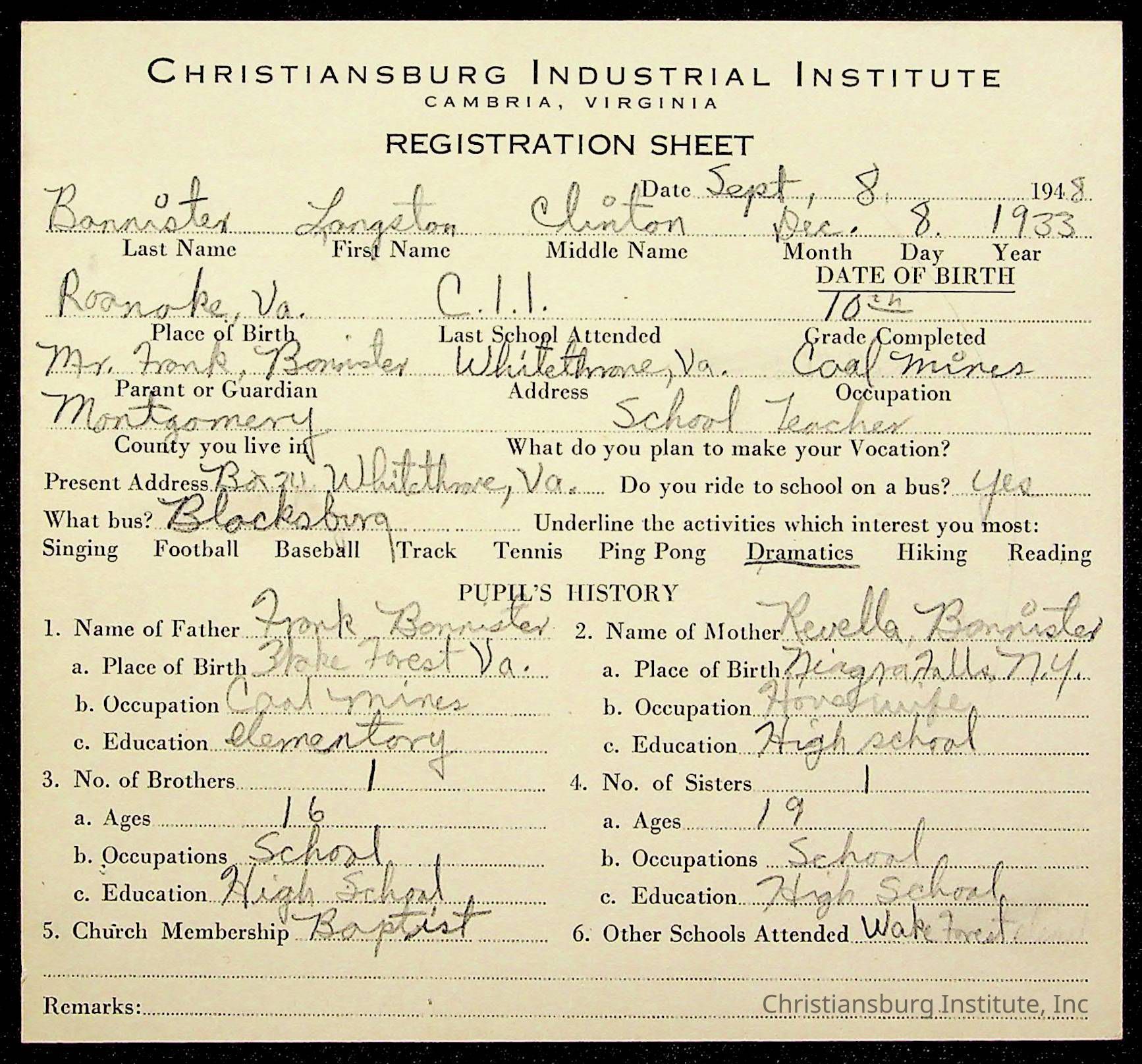 The student file for the Christiansburg Institute student, Langston Clinton Bannister circa 1940s.