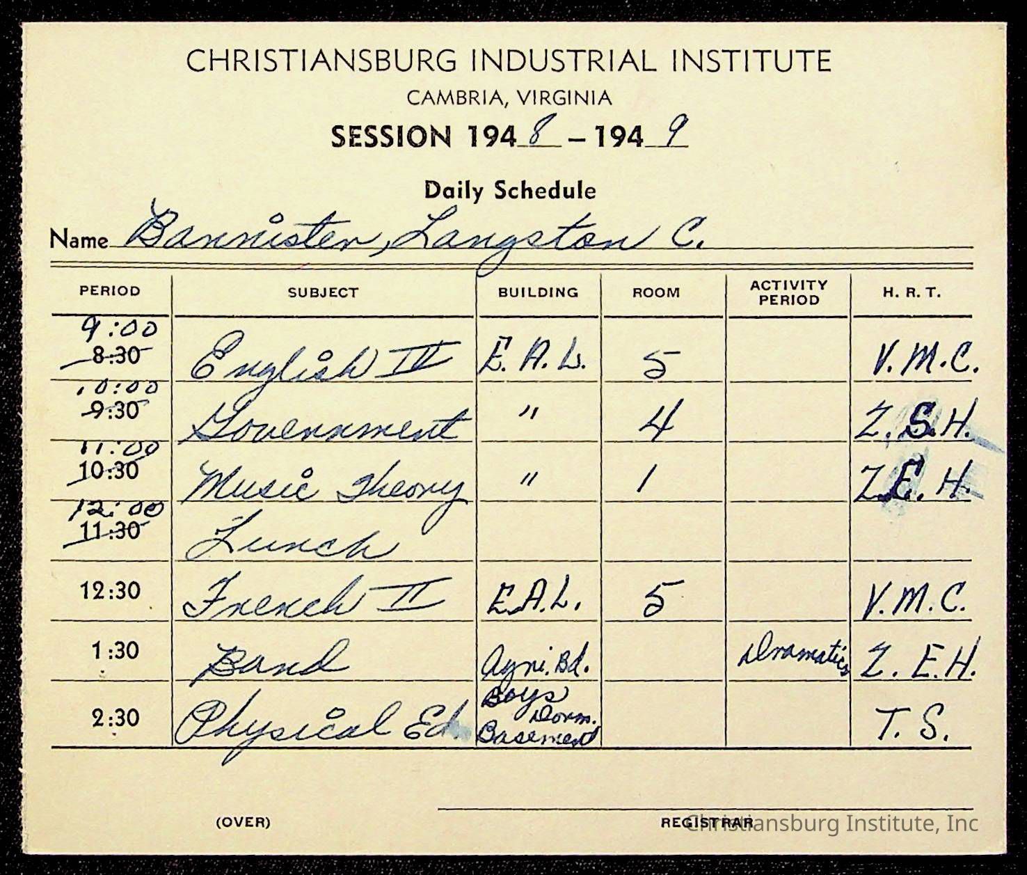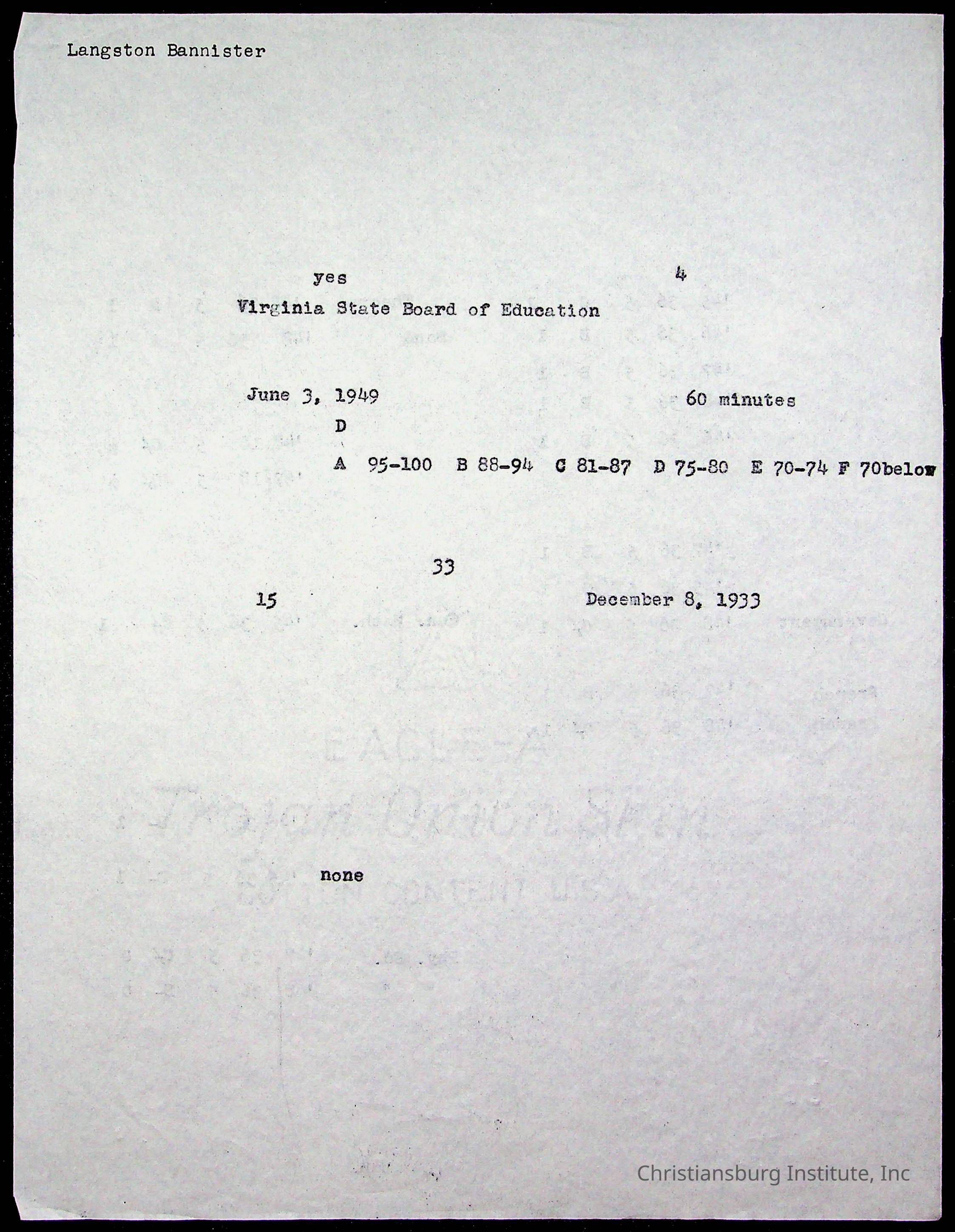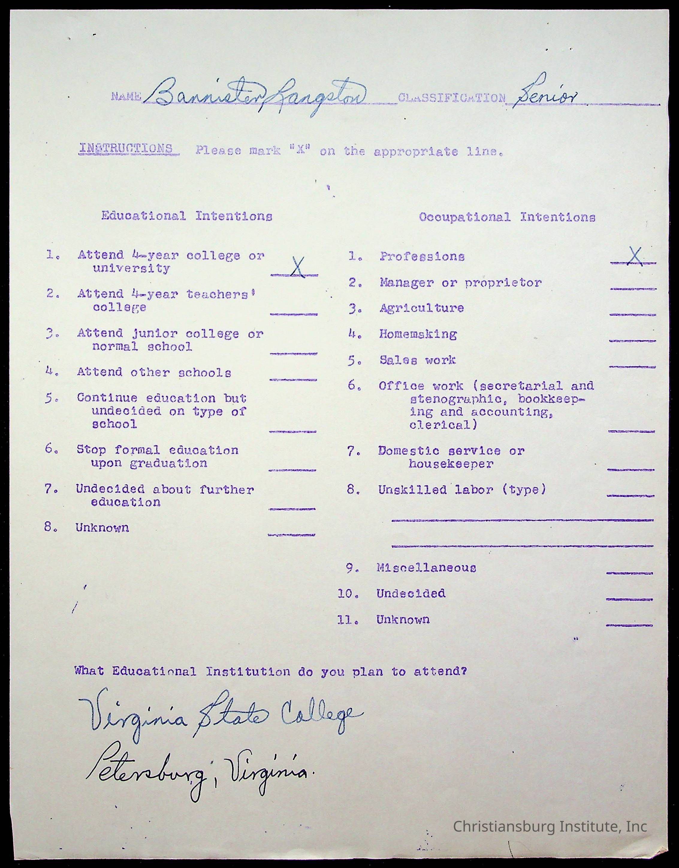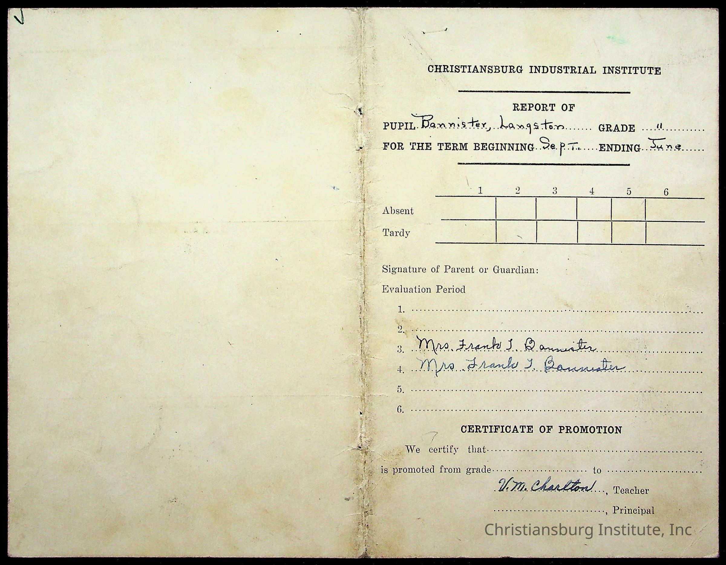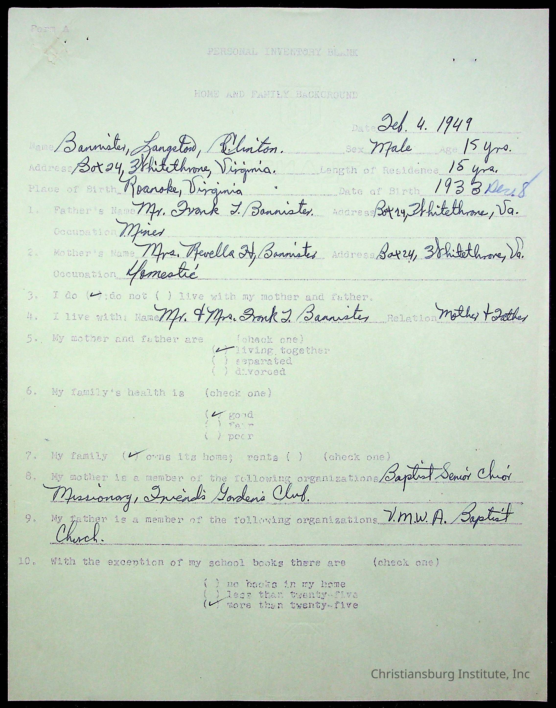 The student file for the Christiansburg Institute student, Langston Clinton Bannister circa 1940s.