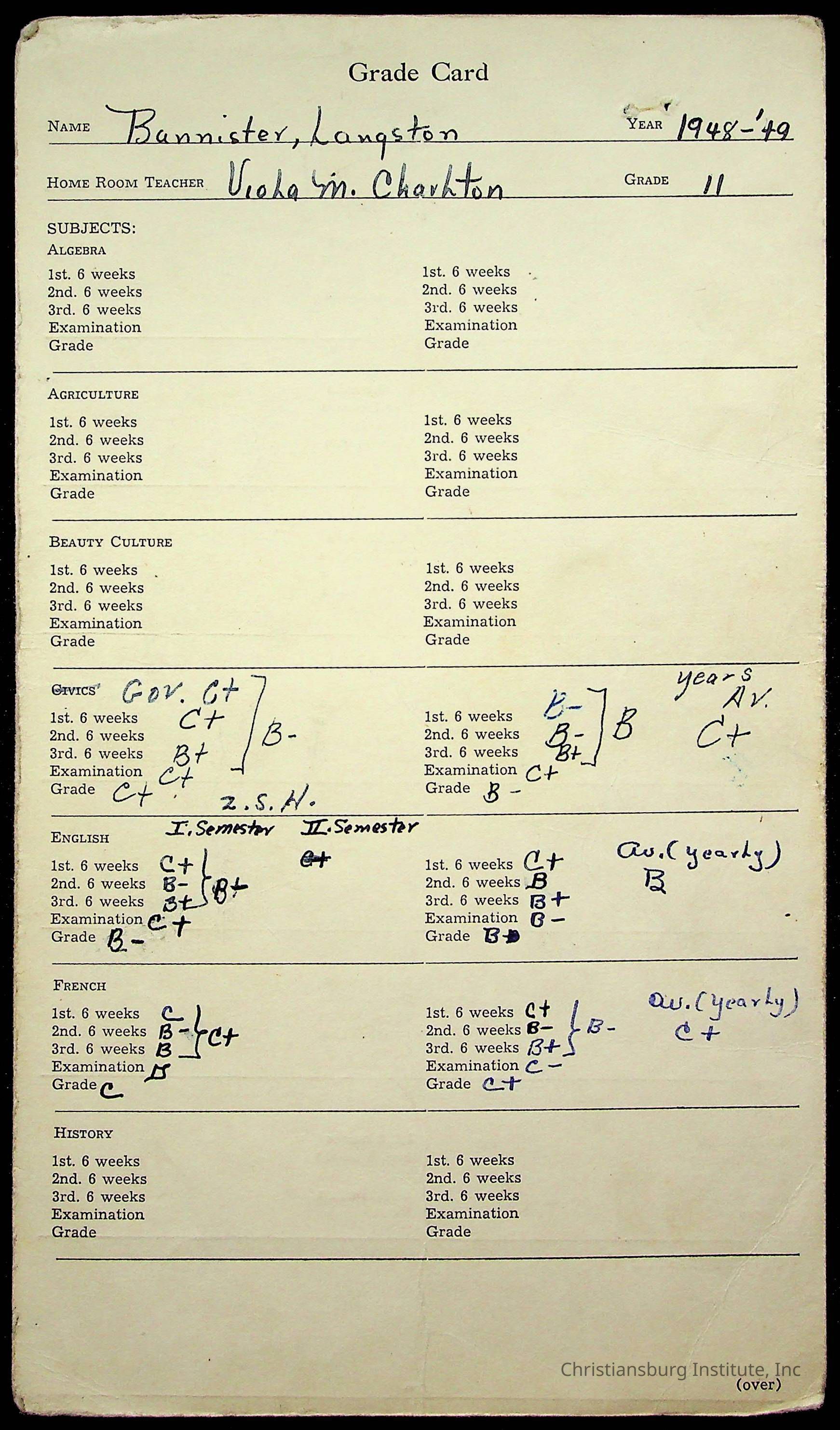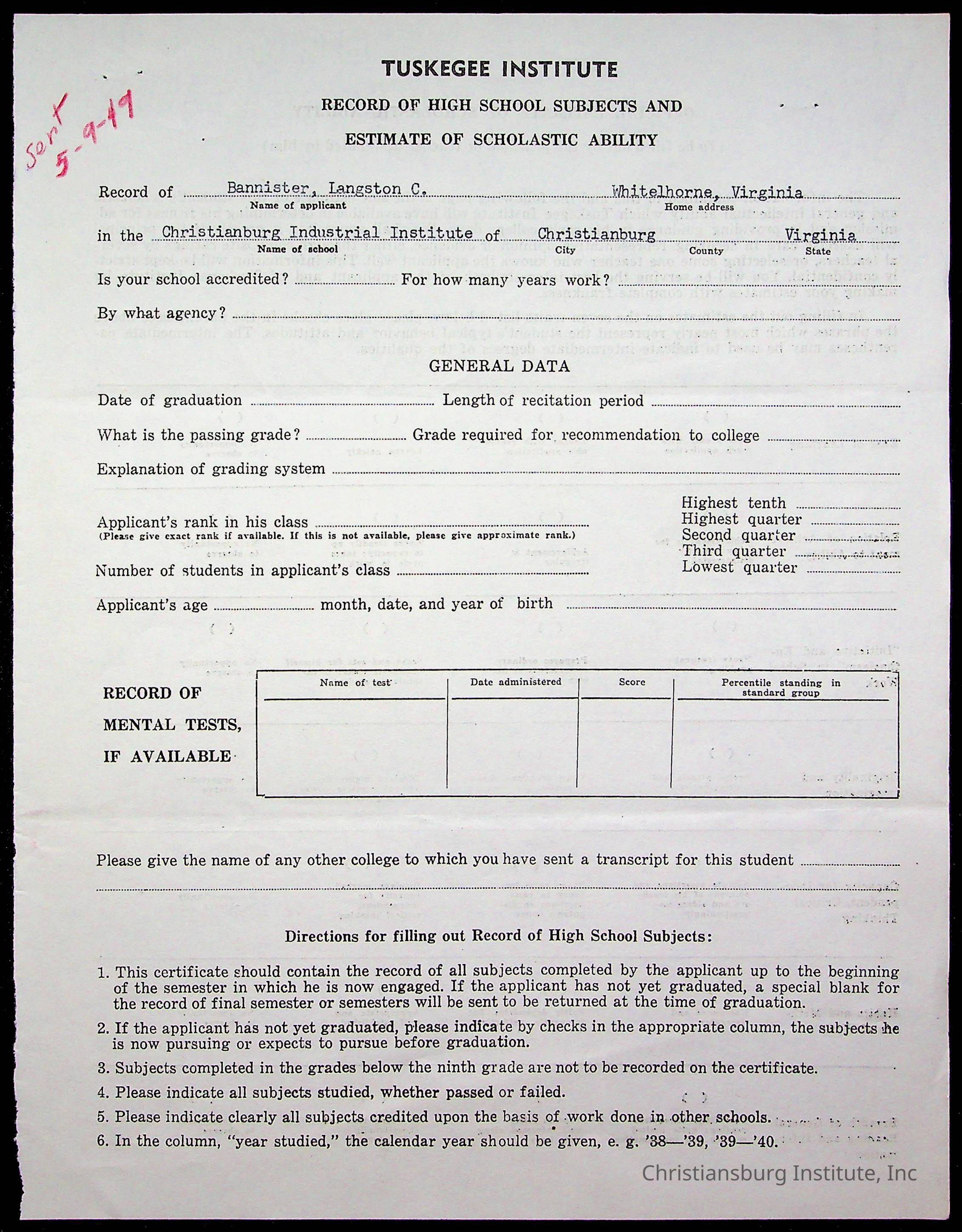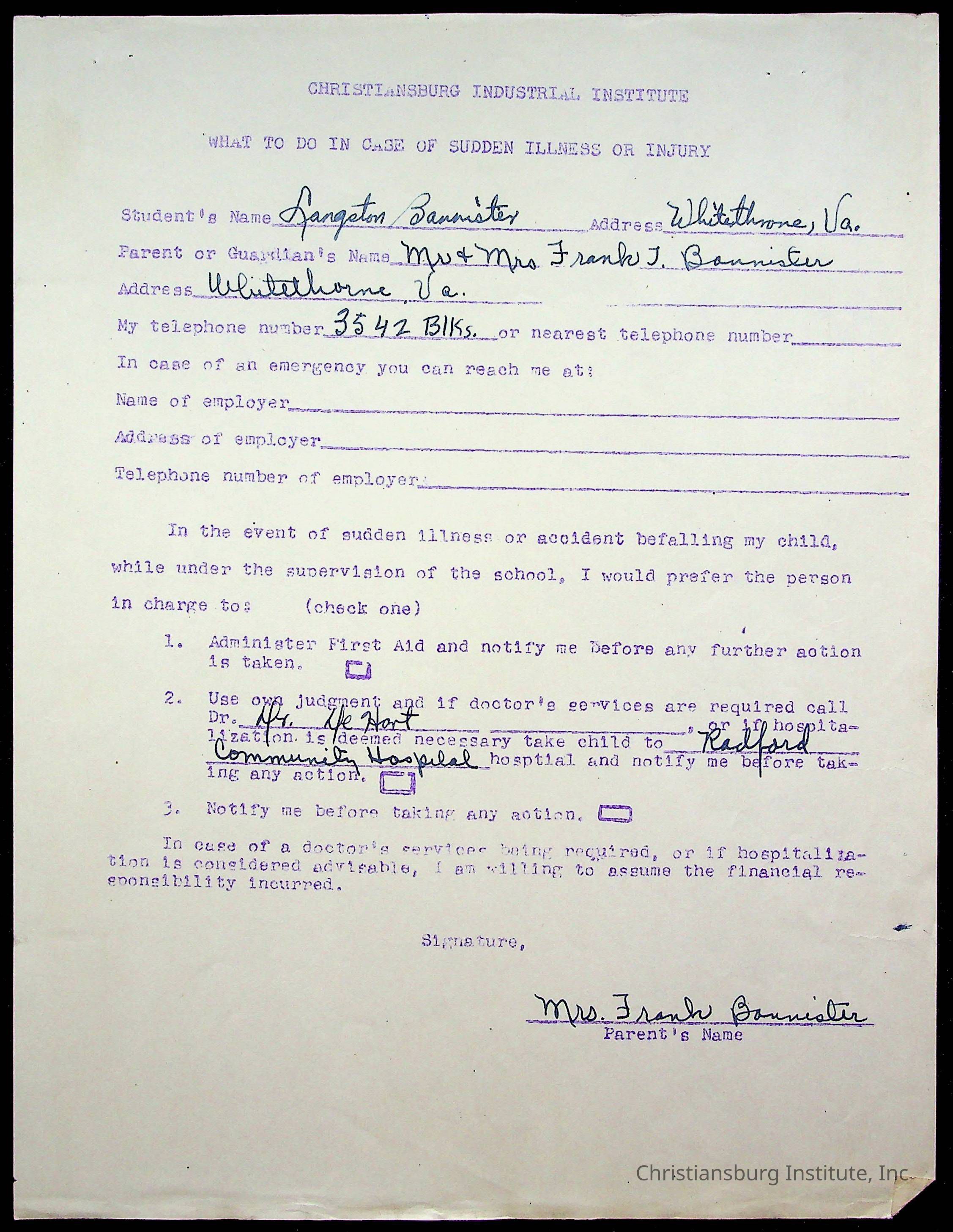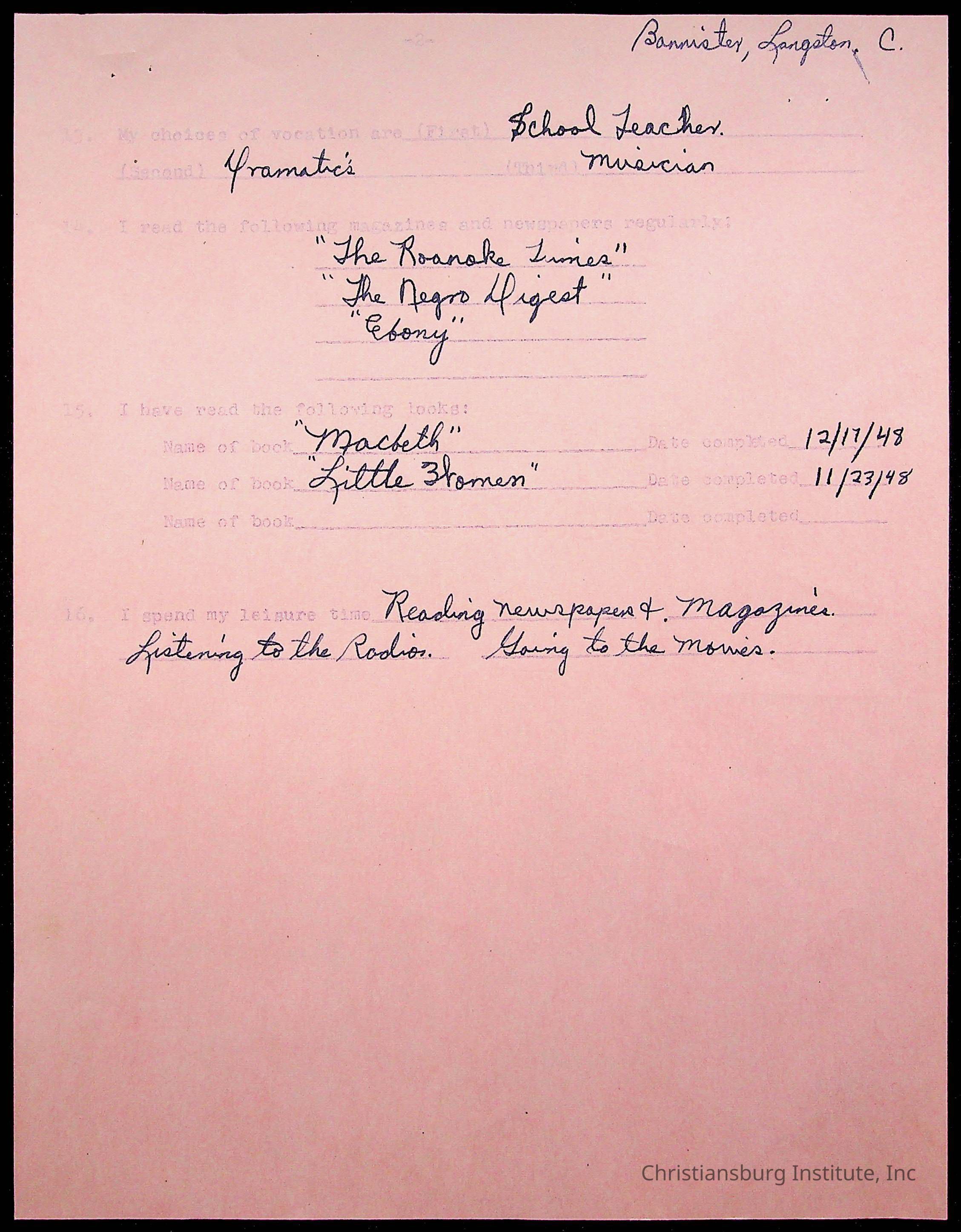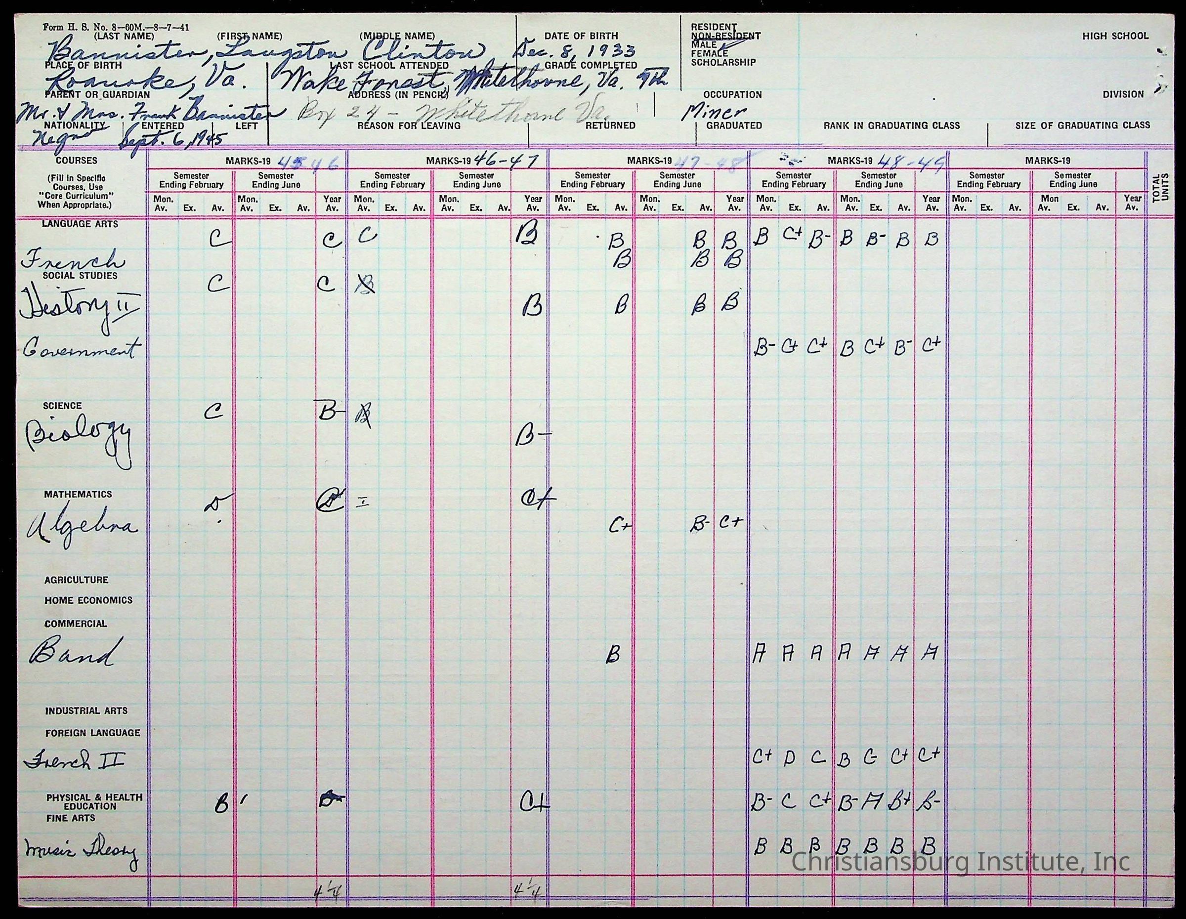 The student file for the Christiansburg Institute student, Langston Clinton Bannister circa 1940s.