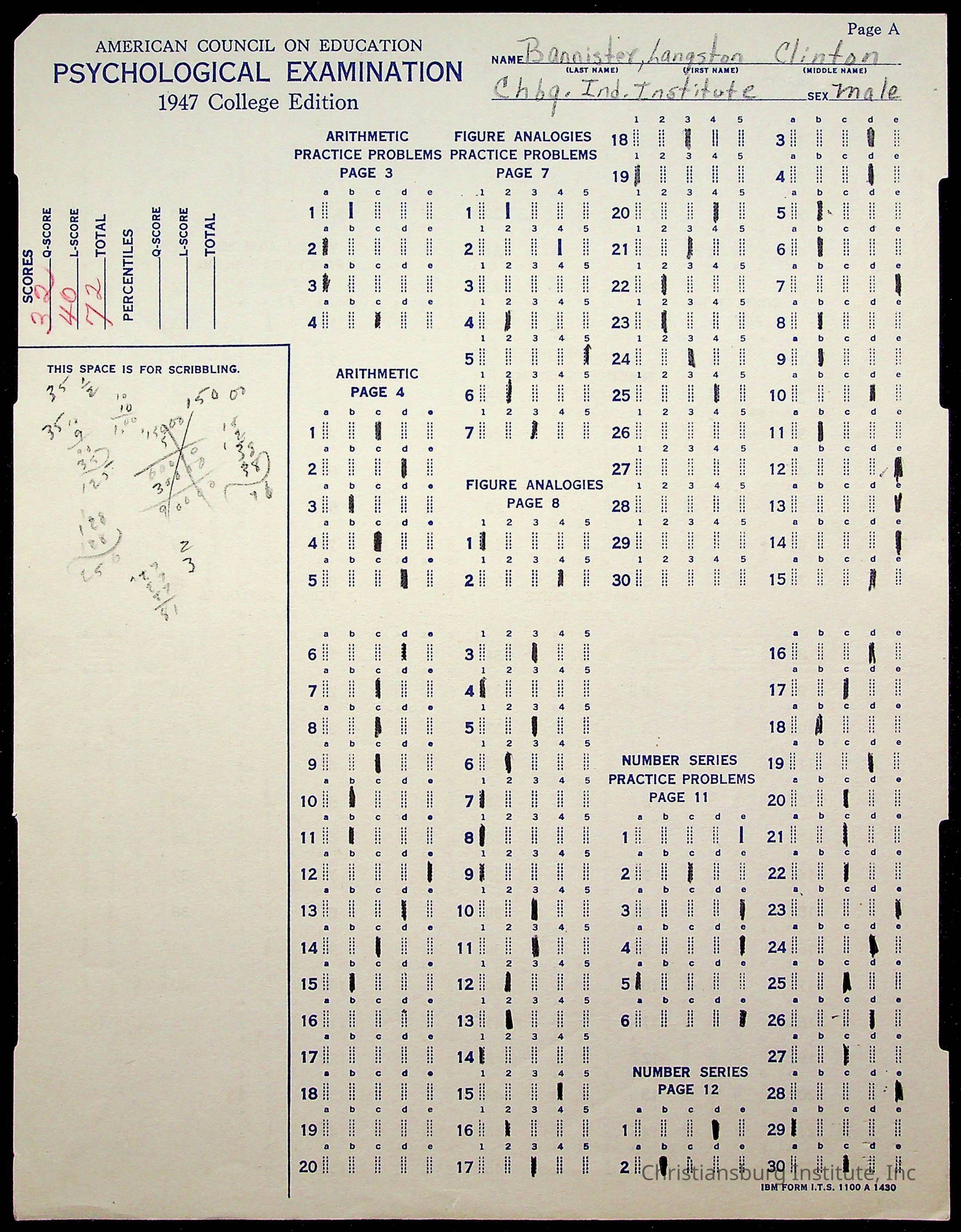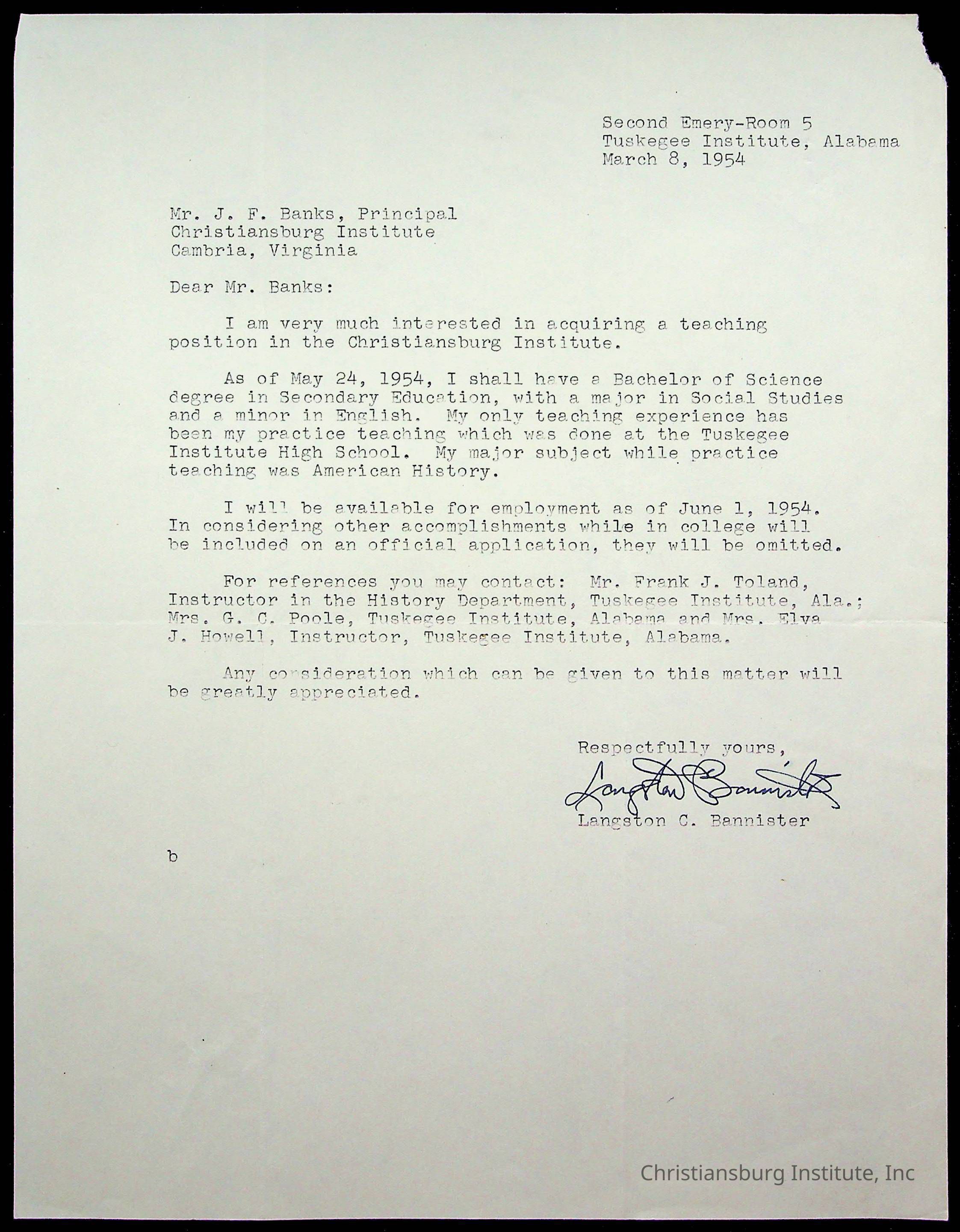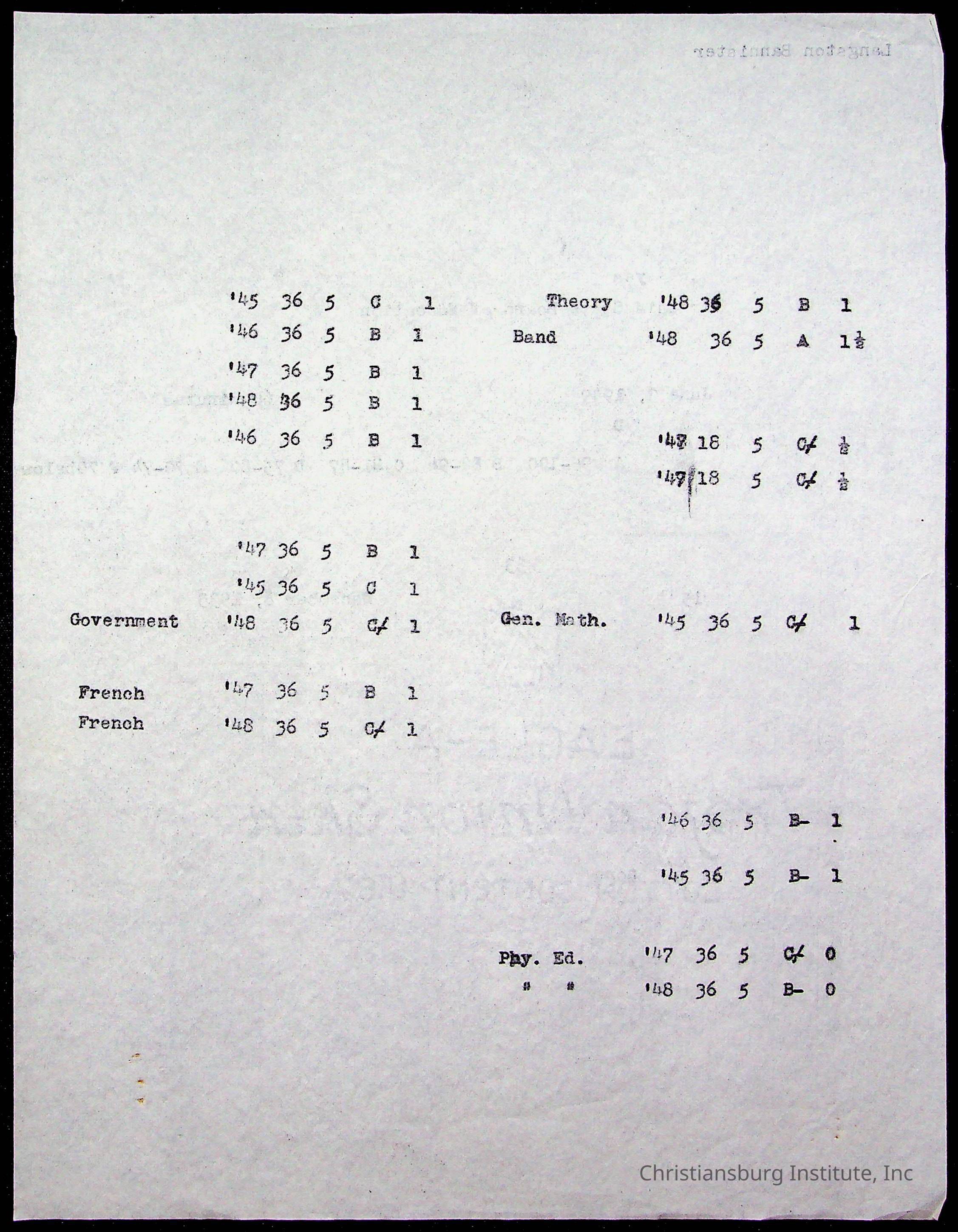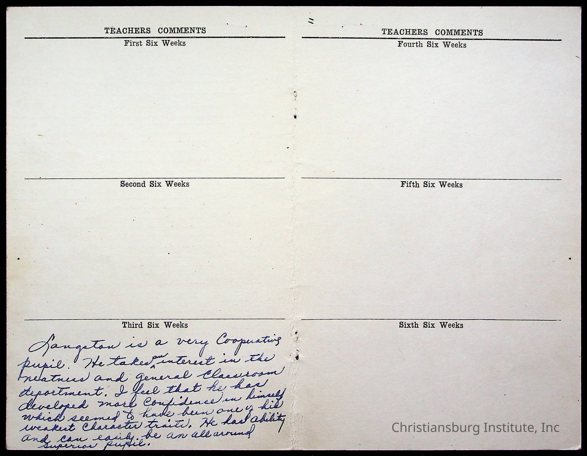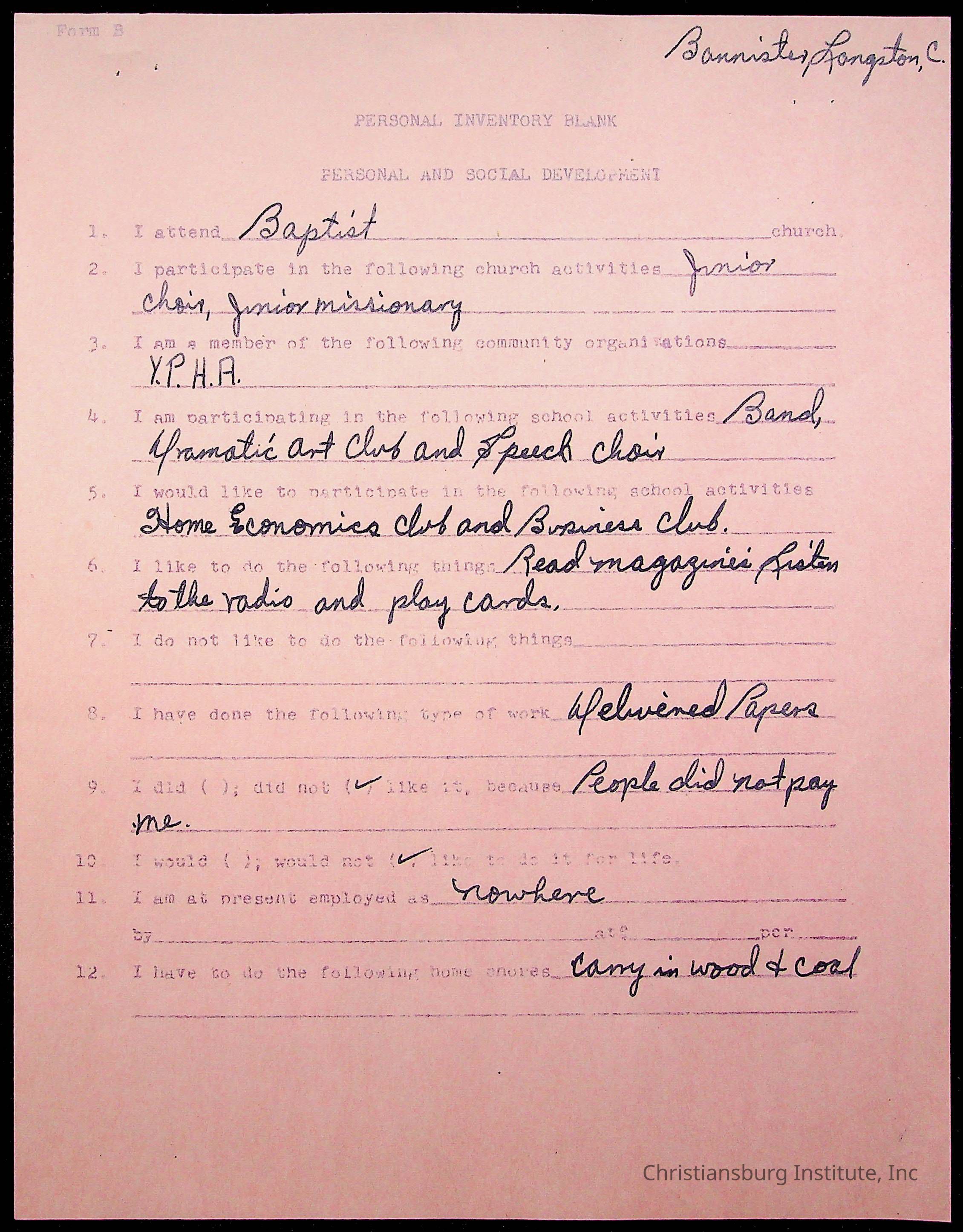 The student file for the Christiansburg Institute student, Langston Clinton Bannister circa 1940s.