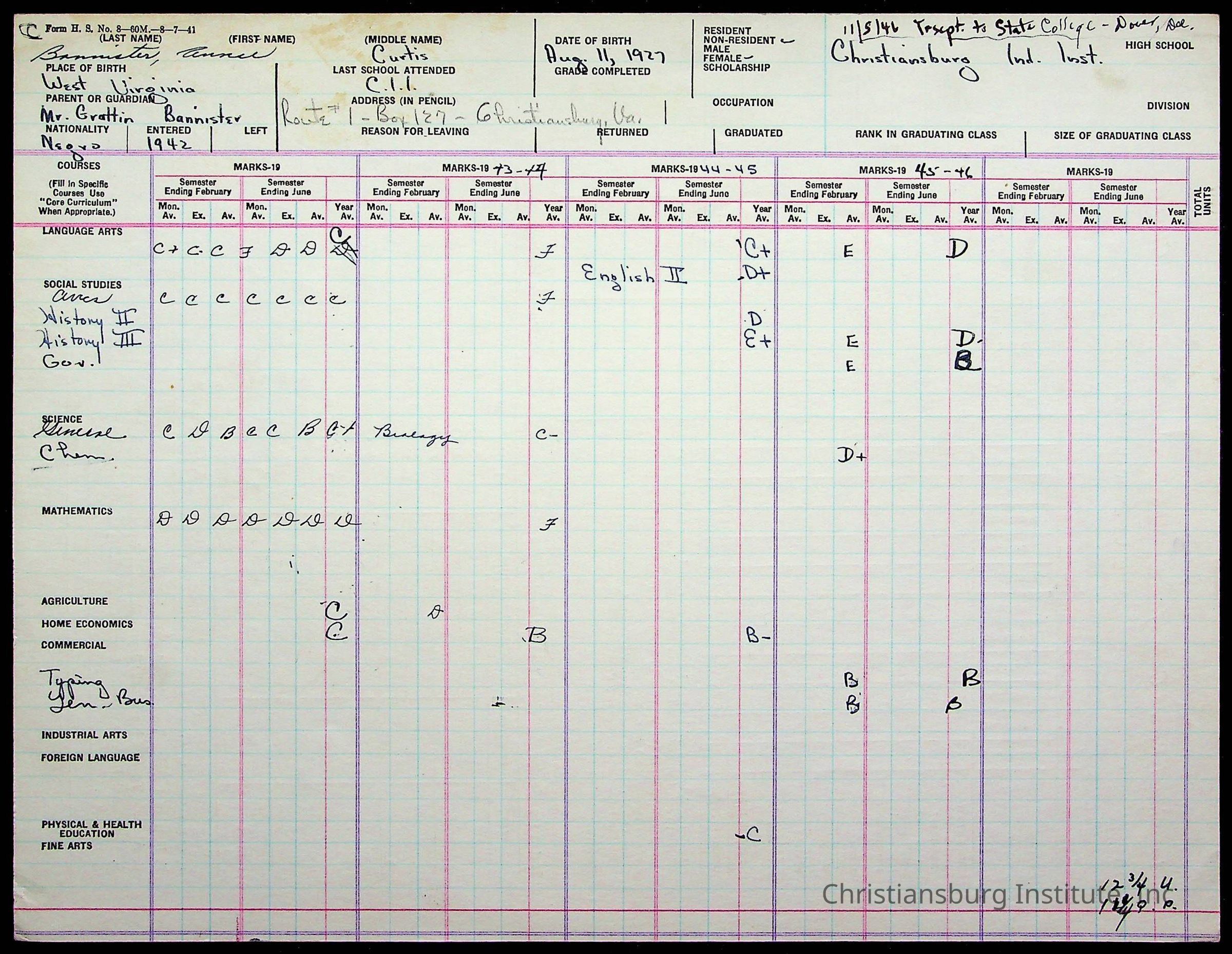 The student file for the Christiansburg Institute student, Renee Curtis Bannister circa 1940s.