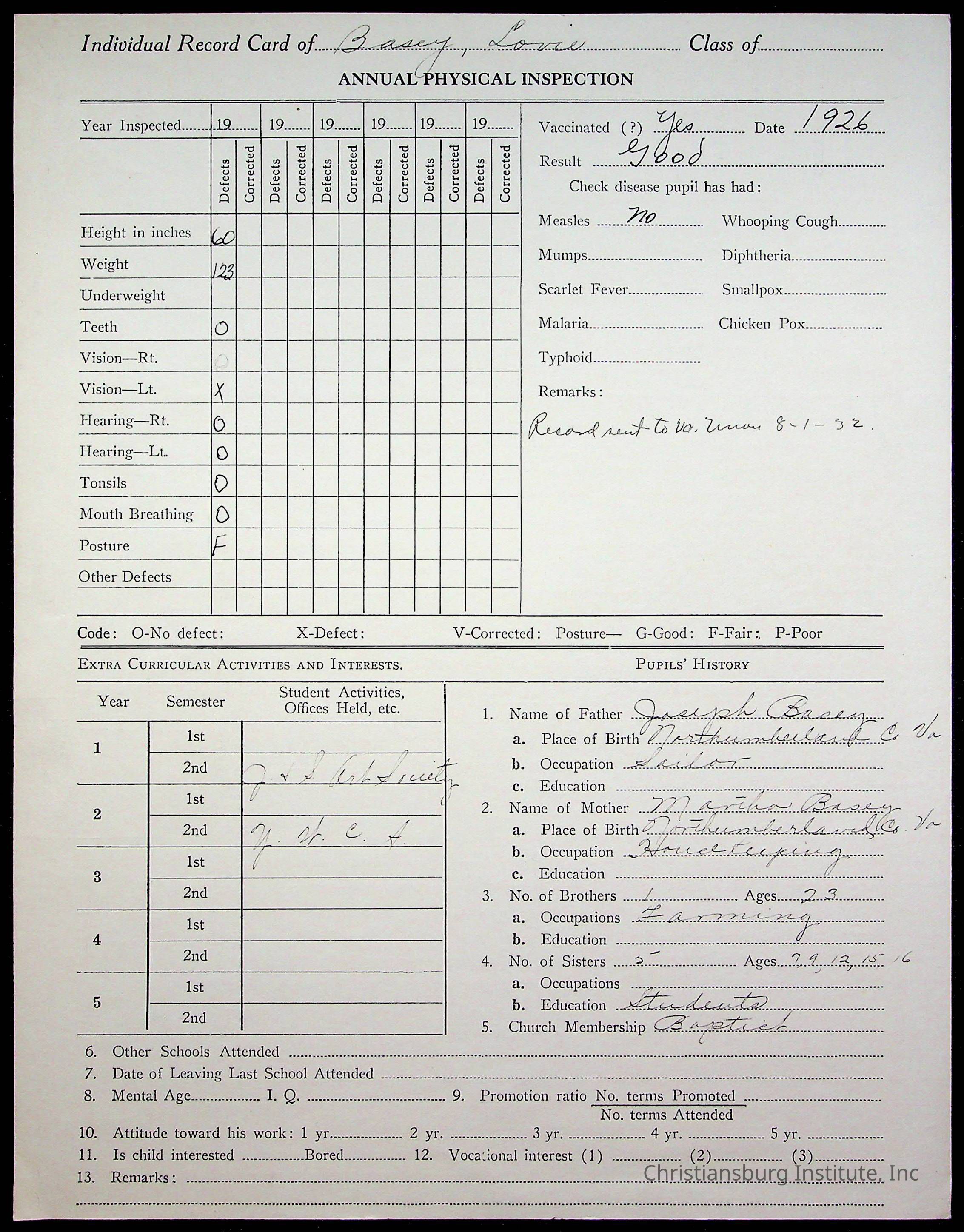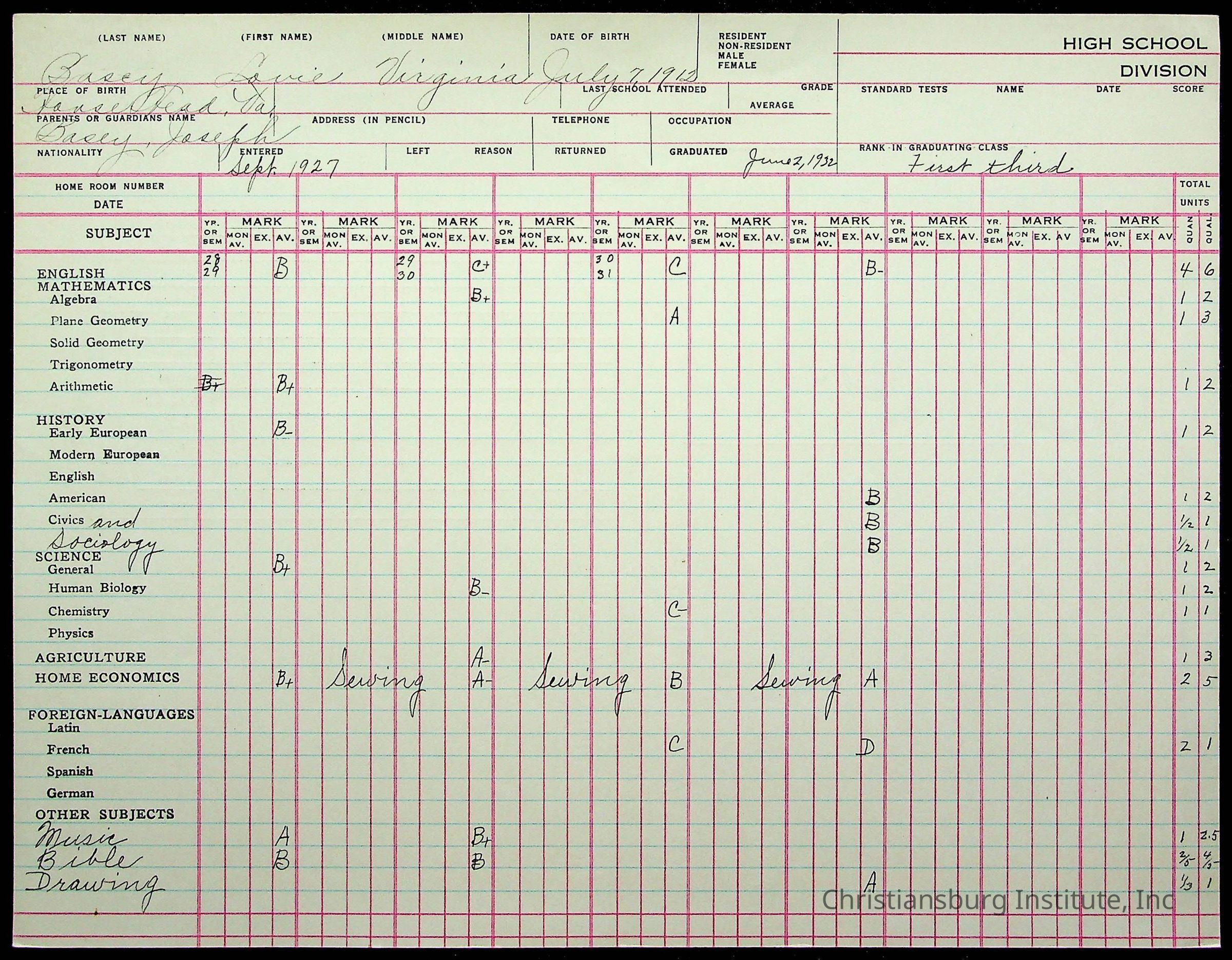 The student file for the Christiansburg Institute student, Lovie Virginia Basey circa 1920s.