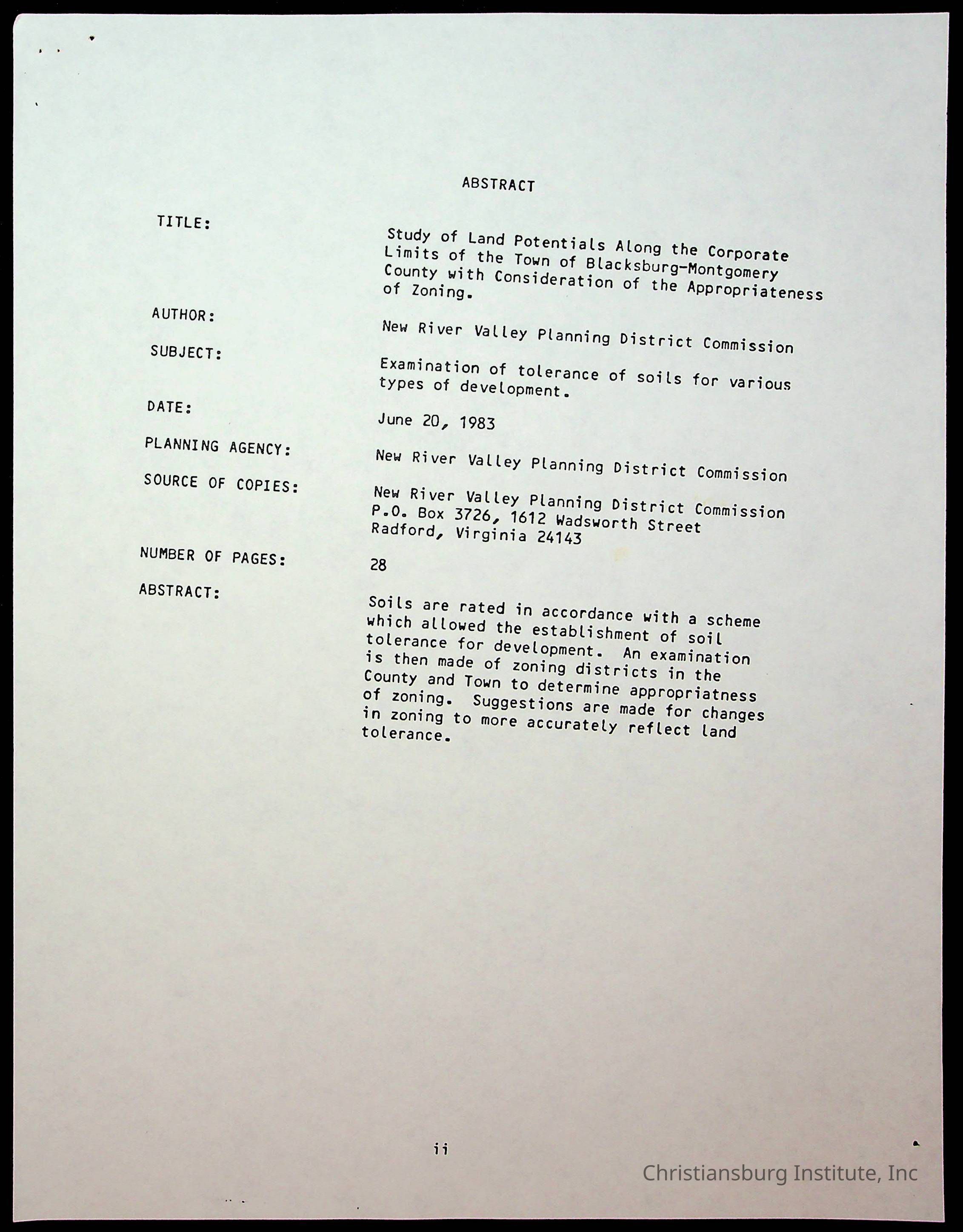 Study of Land Potentials, June 20, 1983 by NRV Planning District CommissionScope and Content