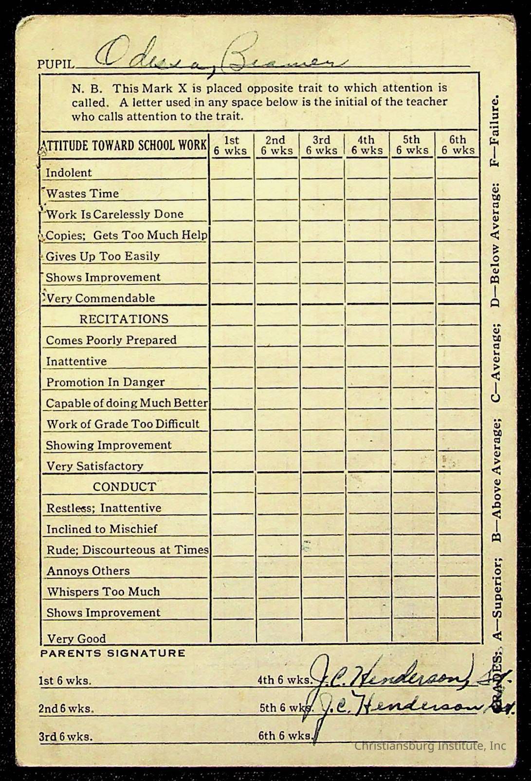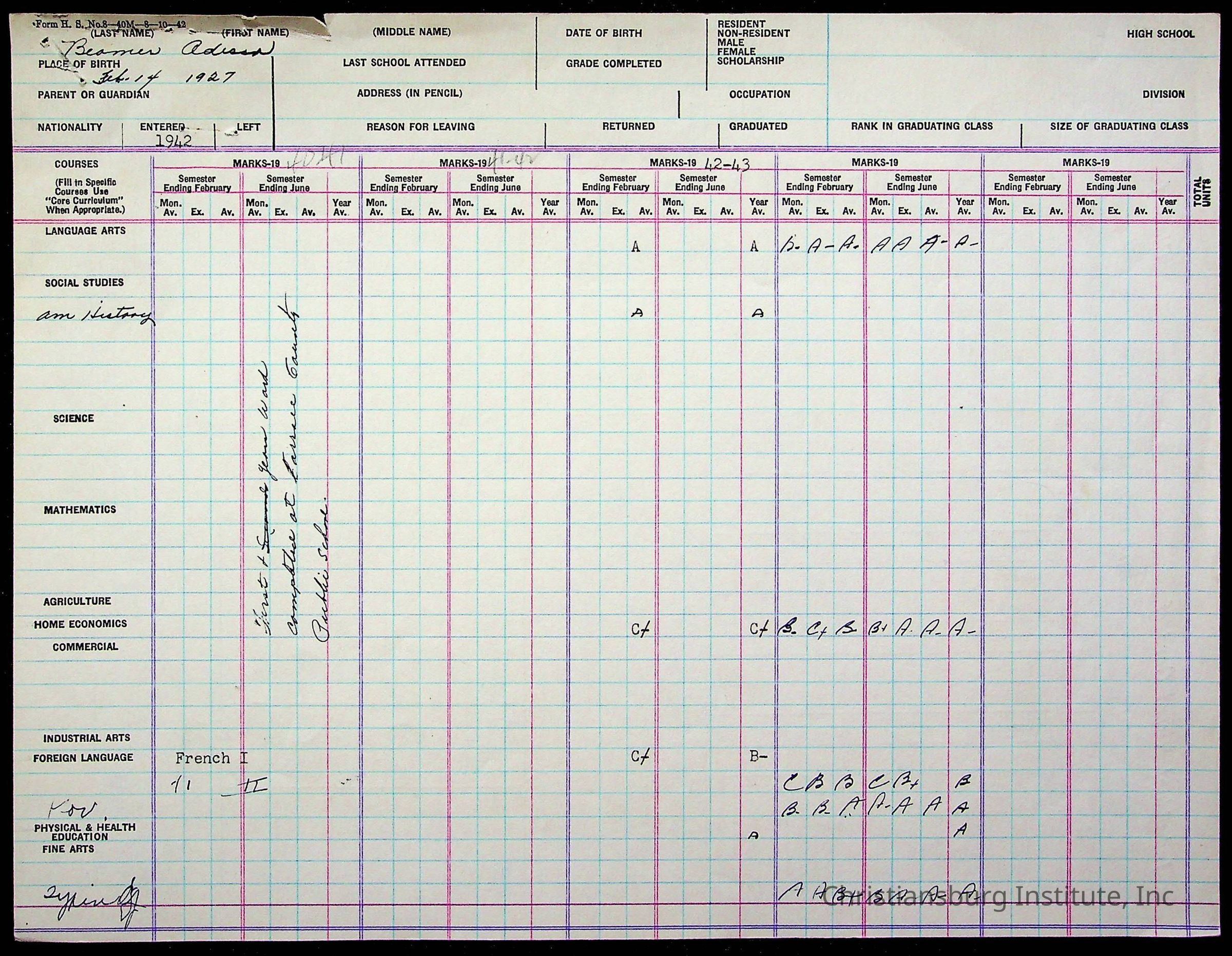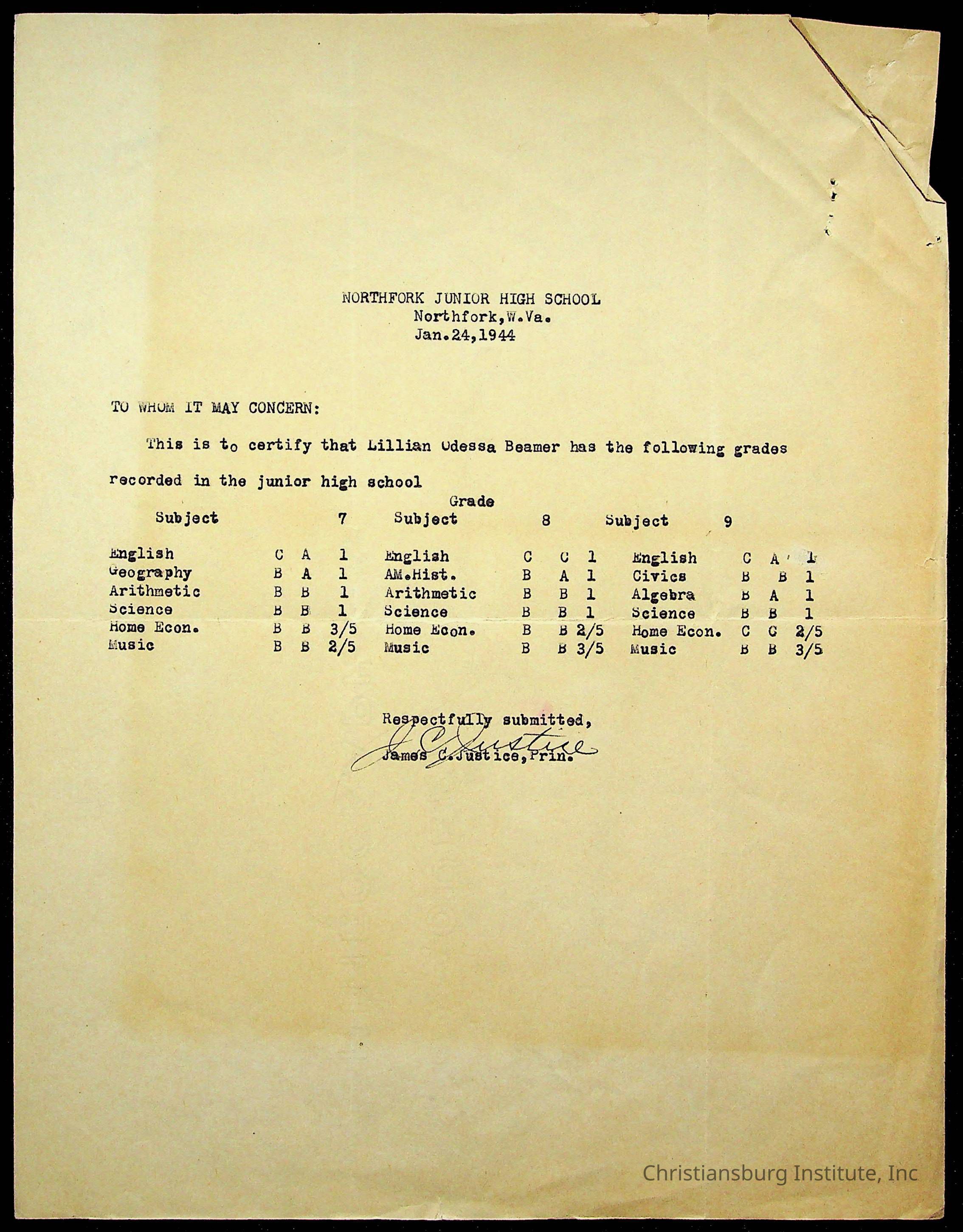 The student file for the Christiansburg Institute student, Adissa Beamer circa 1940s.