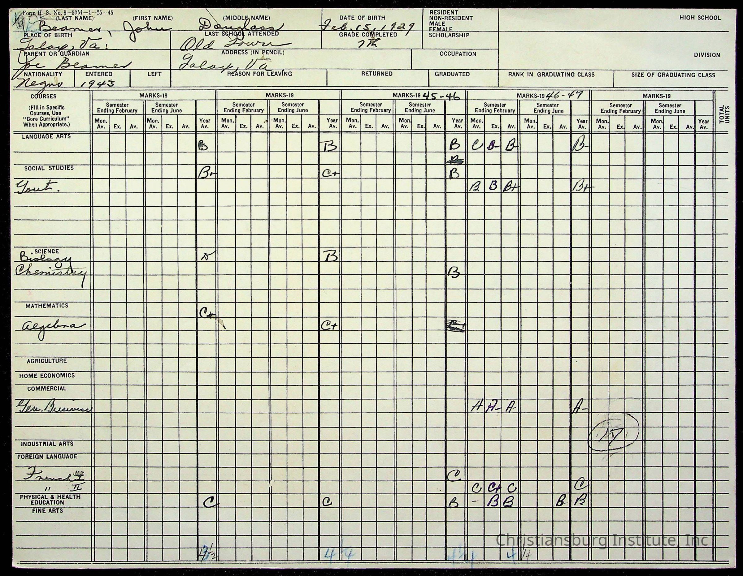 The student file for the Christiansburg Institute student, John Douglass Beamer circa 1940s.